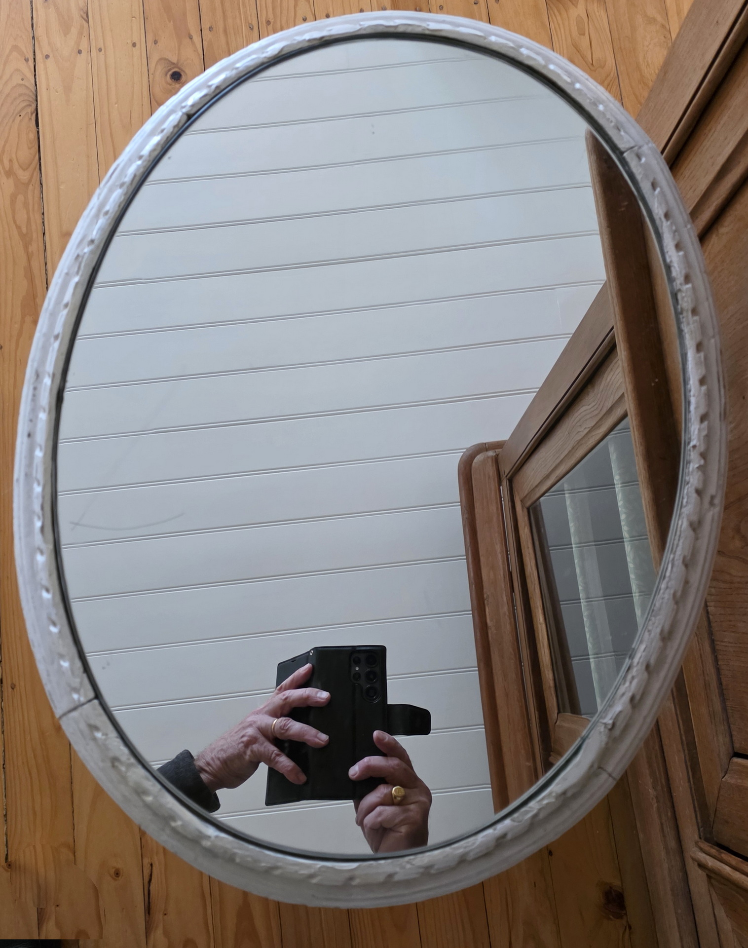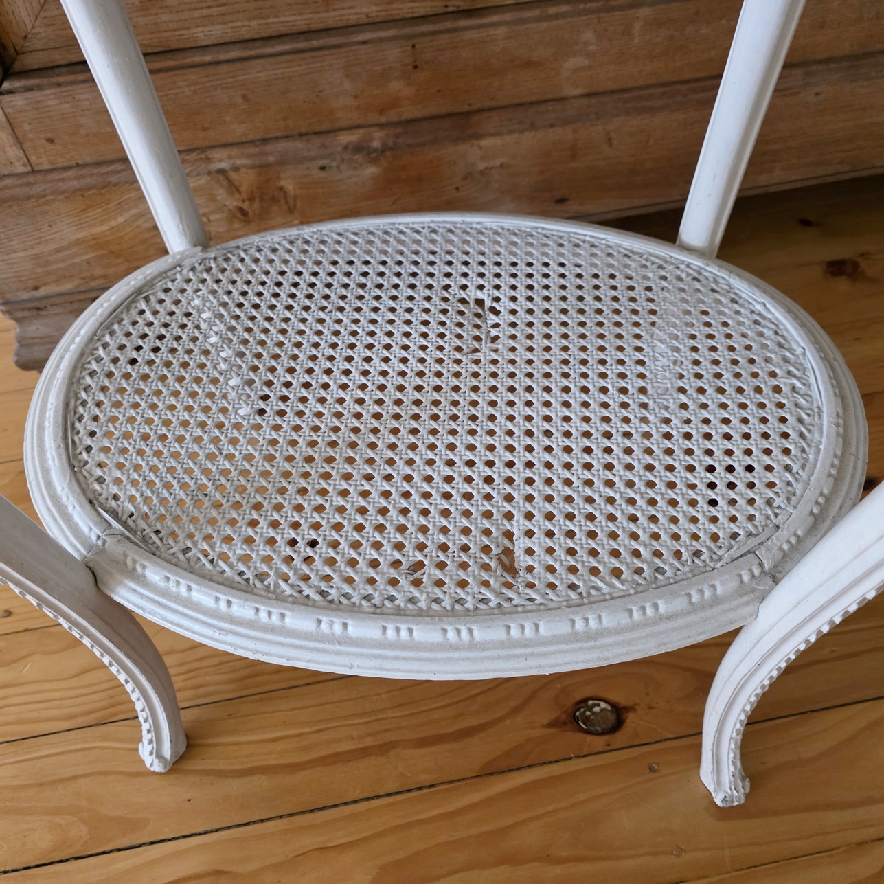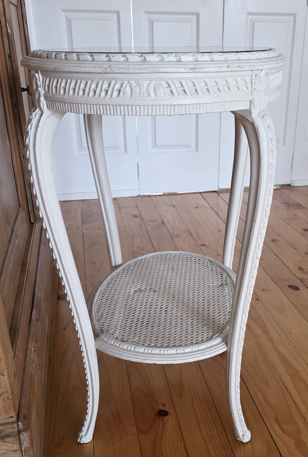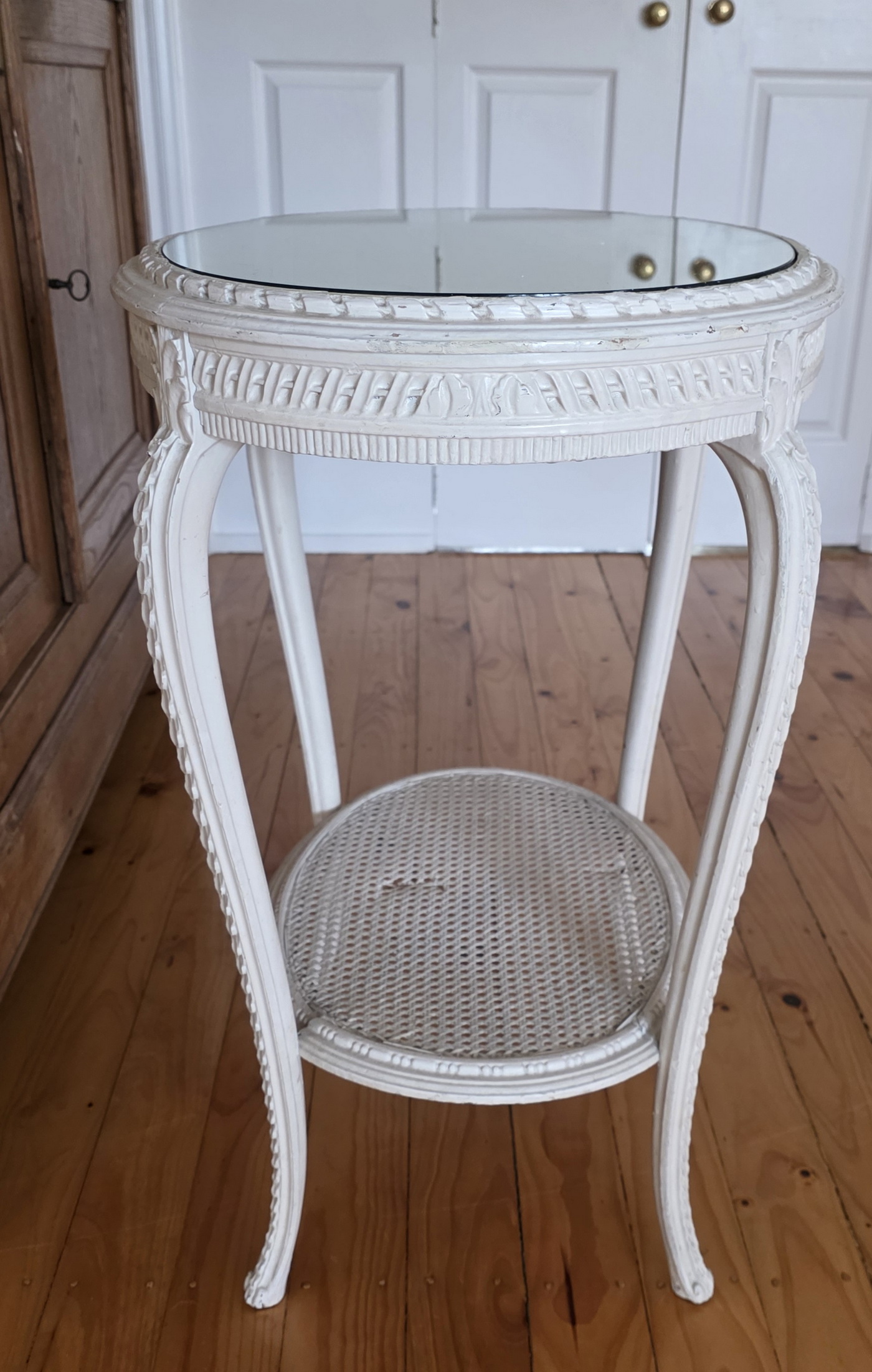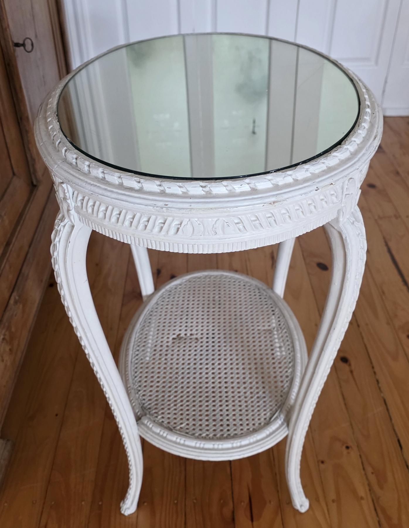 A 19th century French Louis XVI style, finely carved and painted 'Gueridon' table, the oval top fitted with a later mirror, an oval shelf hanging between the elegant legs fitted with finely woven rattan. Area of Paris, circa 1880.