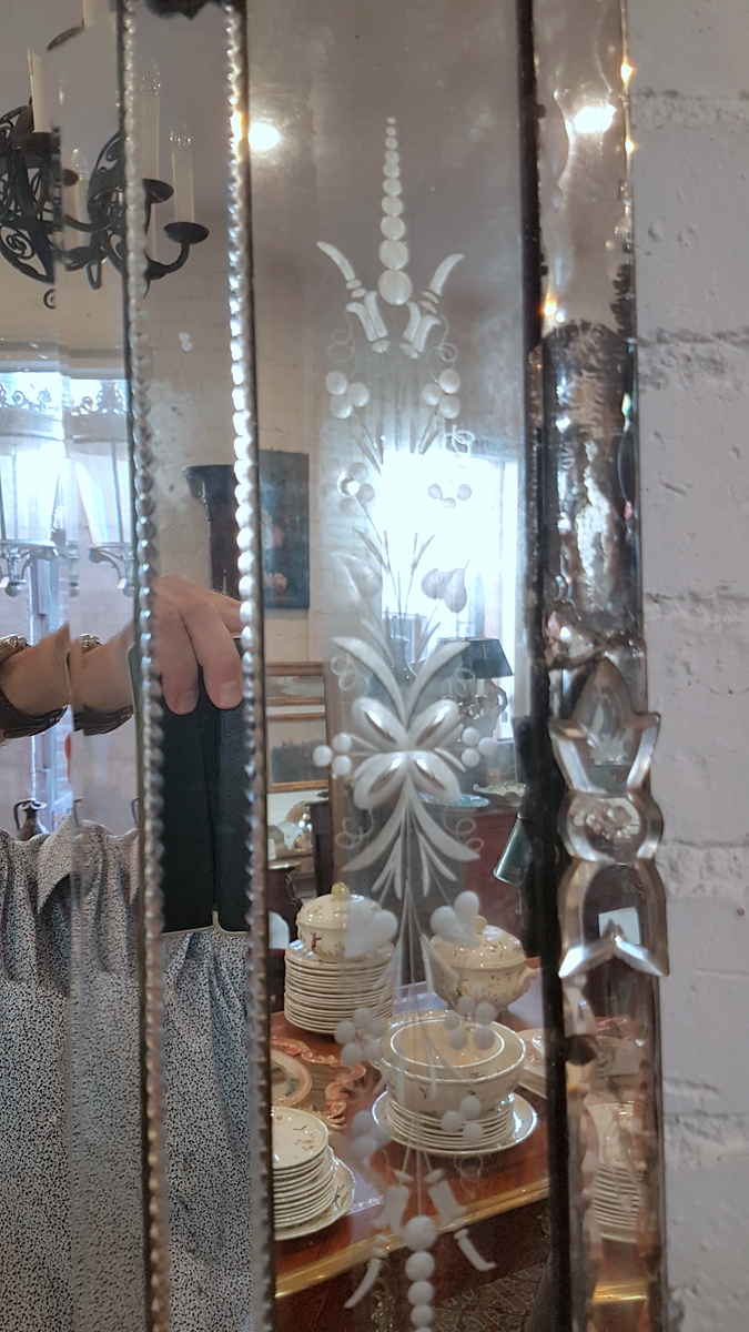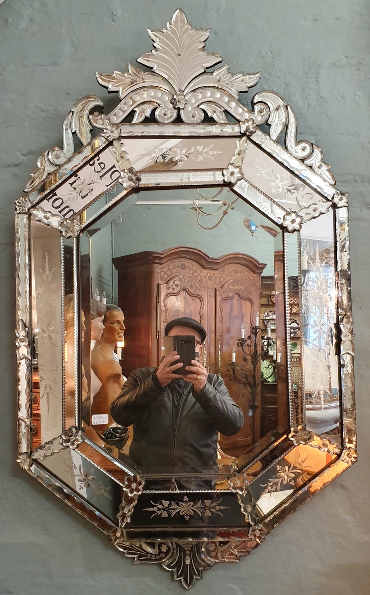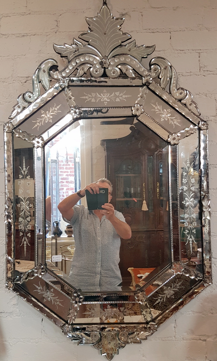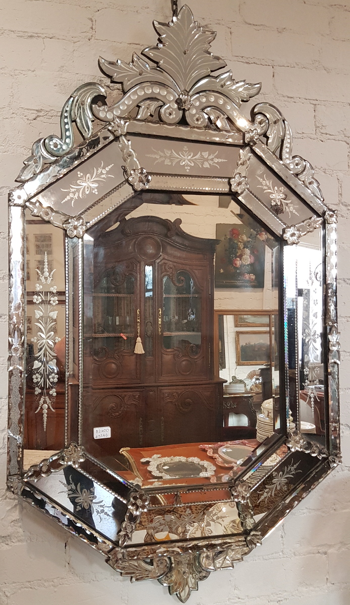 An early 20th century octagonal Venetian mirror of excellent design and proportions, the central bevelled mirror plate surrounded by a triple-mirrored and shaped frame decorated with cut and etched floral designs. Fitted with a shaped and fretted finial and plinth. Area of Venice, circa 1930.