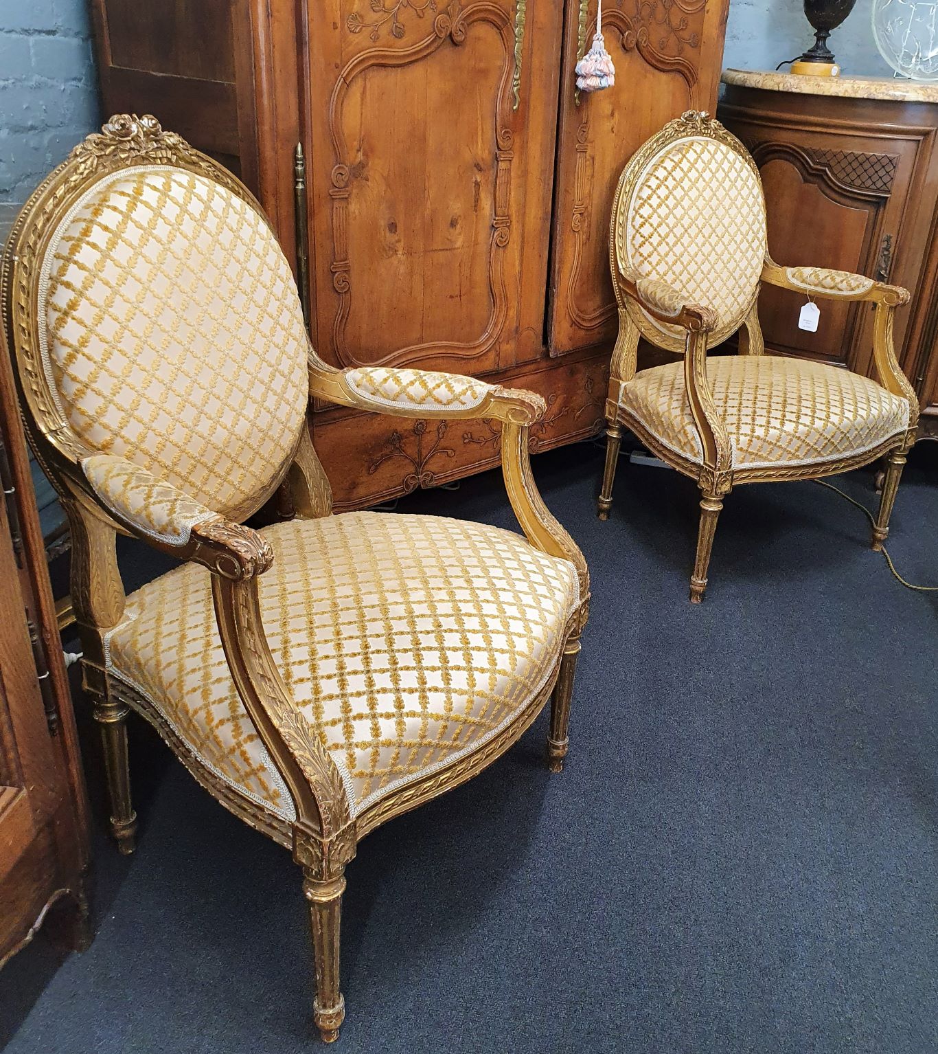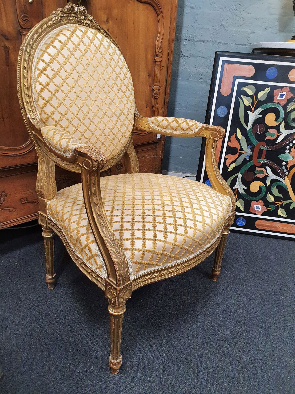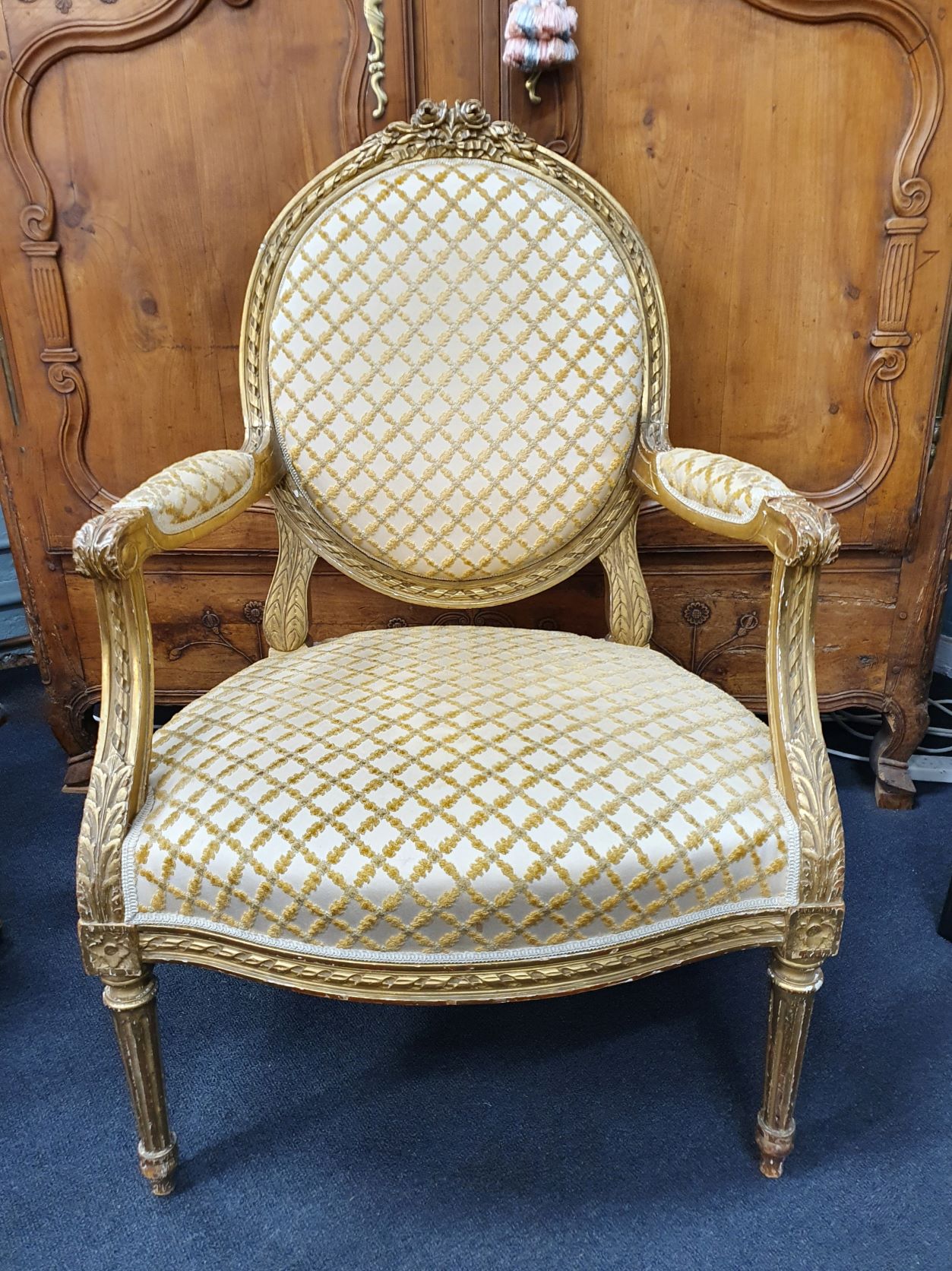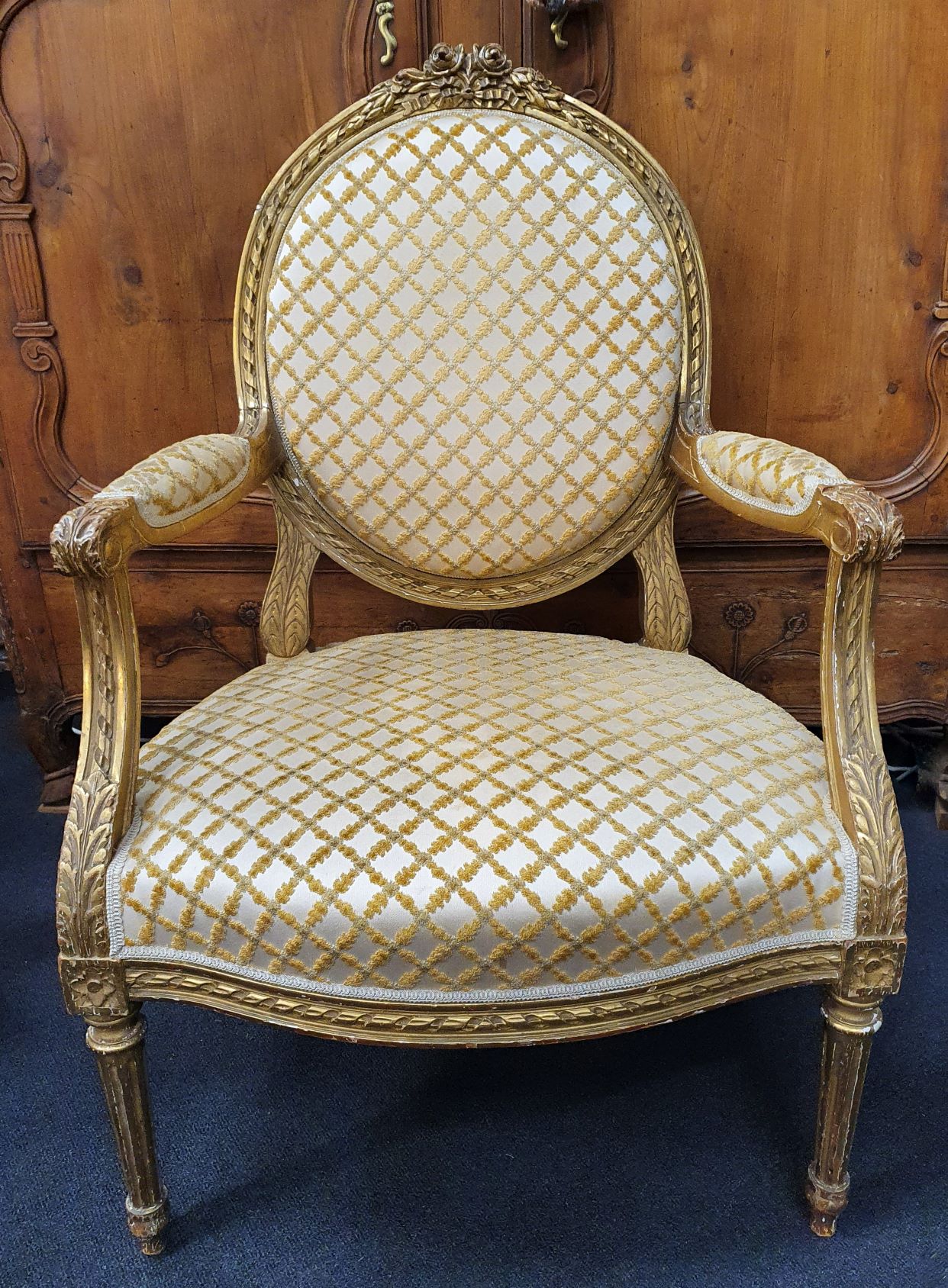 A pair of elegant and comfortable, finely carved and gilt, French Napoleon III period Louis XVI style Fauteuil armchairs. The armchair frames decorated with haut-relief carved and gilded Neoclassical motifs such as ‘ribbon’ pattern mouldings, acanthus leaves and paterae. The Medallion backrests decorated with carved knotted bows and roses motifs. Area of Paris, circa 1860.