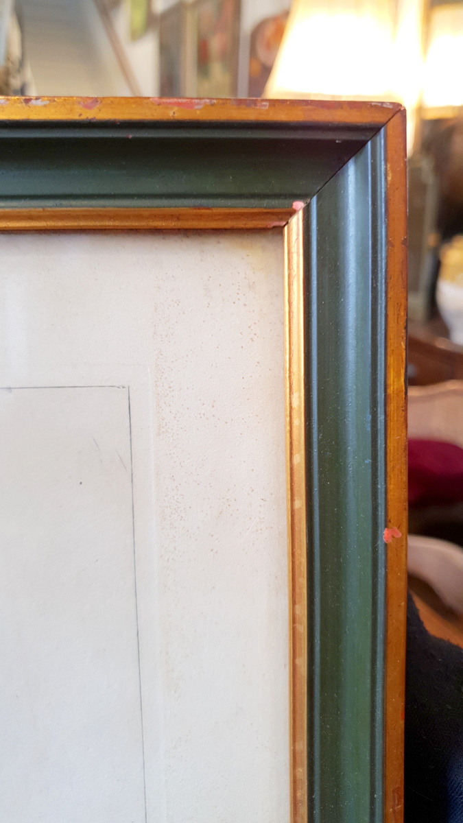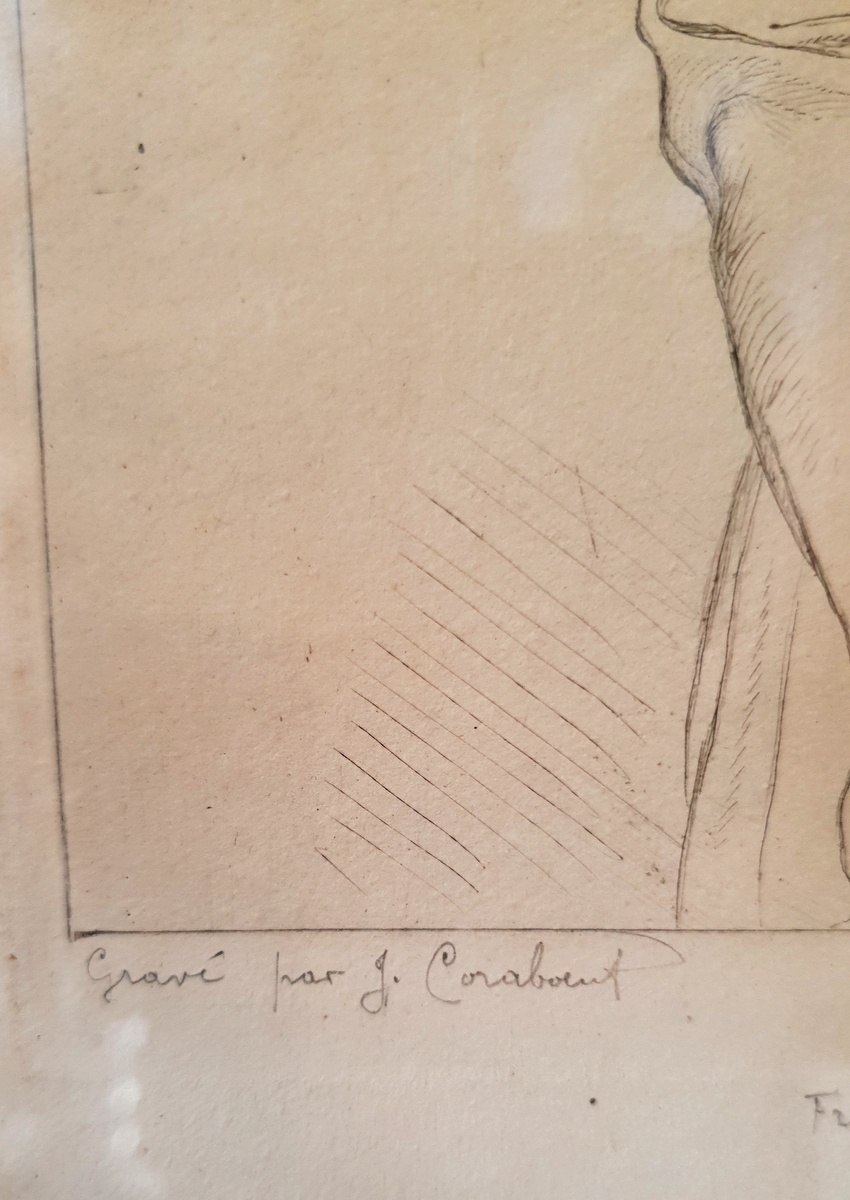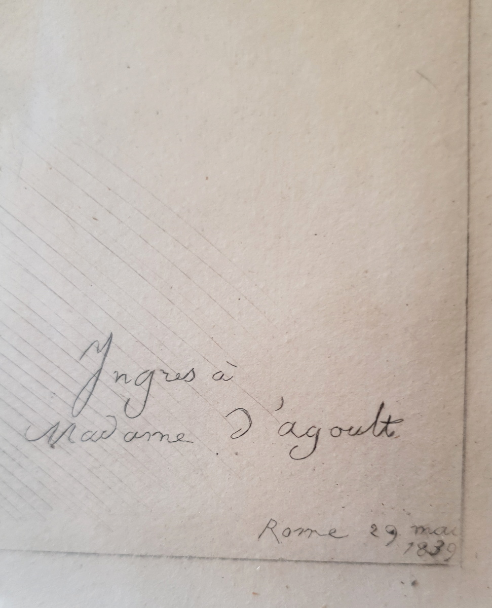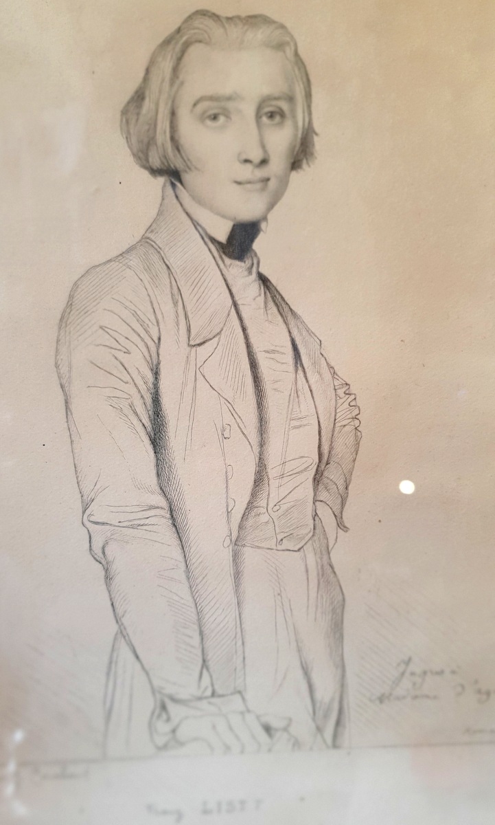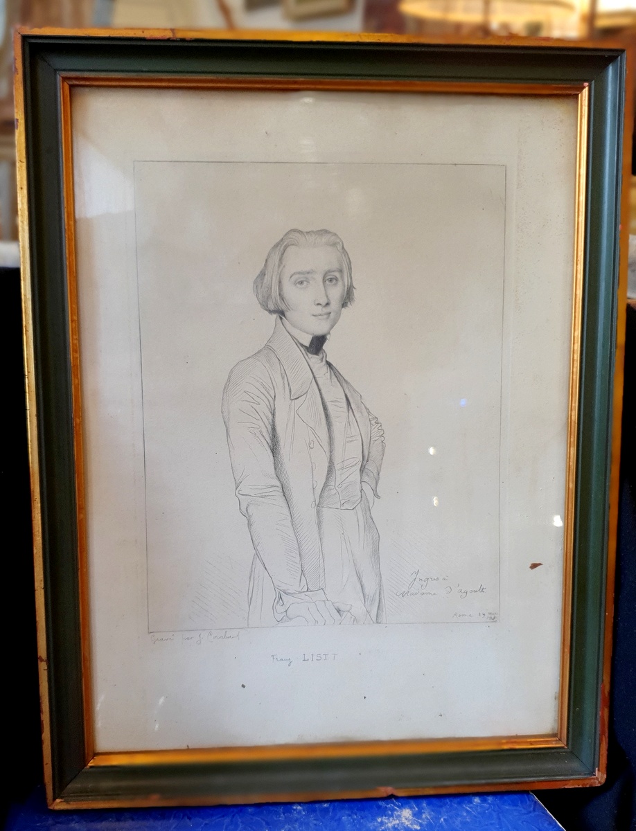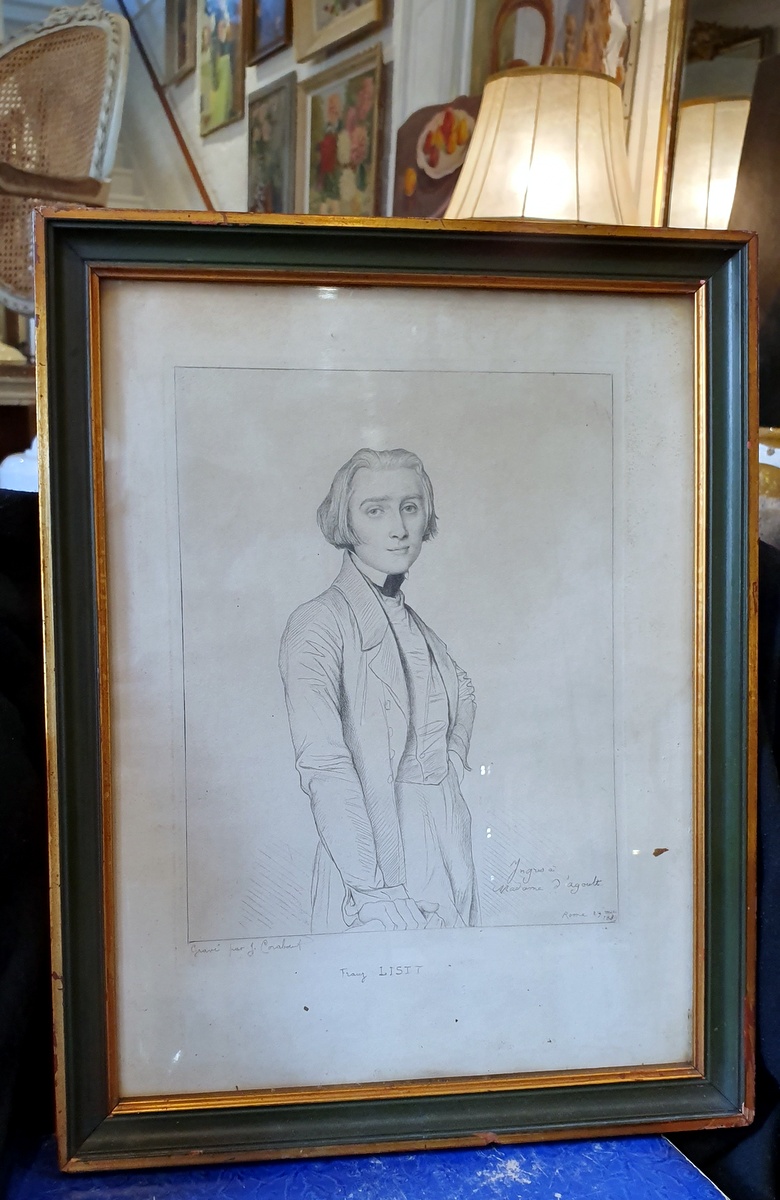 A fine, early 19th century portrait of a young and whimsical looking Franz List, Hungarian pianist and composer (1811-1886), derived from the original pencil drawing portrait by Ingres (Jean-Auguste-Dominique Ingres (1780–1867). Etched by renown 19th century French engraver Jean Alexandre Coraboeuf (1840-1918). The etching has a dedication to Mme. d'Agoult (Countess d'Agoult (1805-1876), Franz List's companion for many years. Fitted into a 19th century painted and gilded frame.