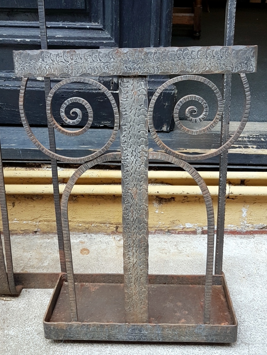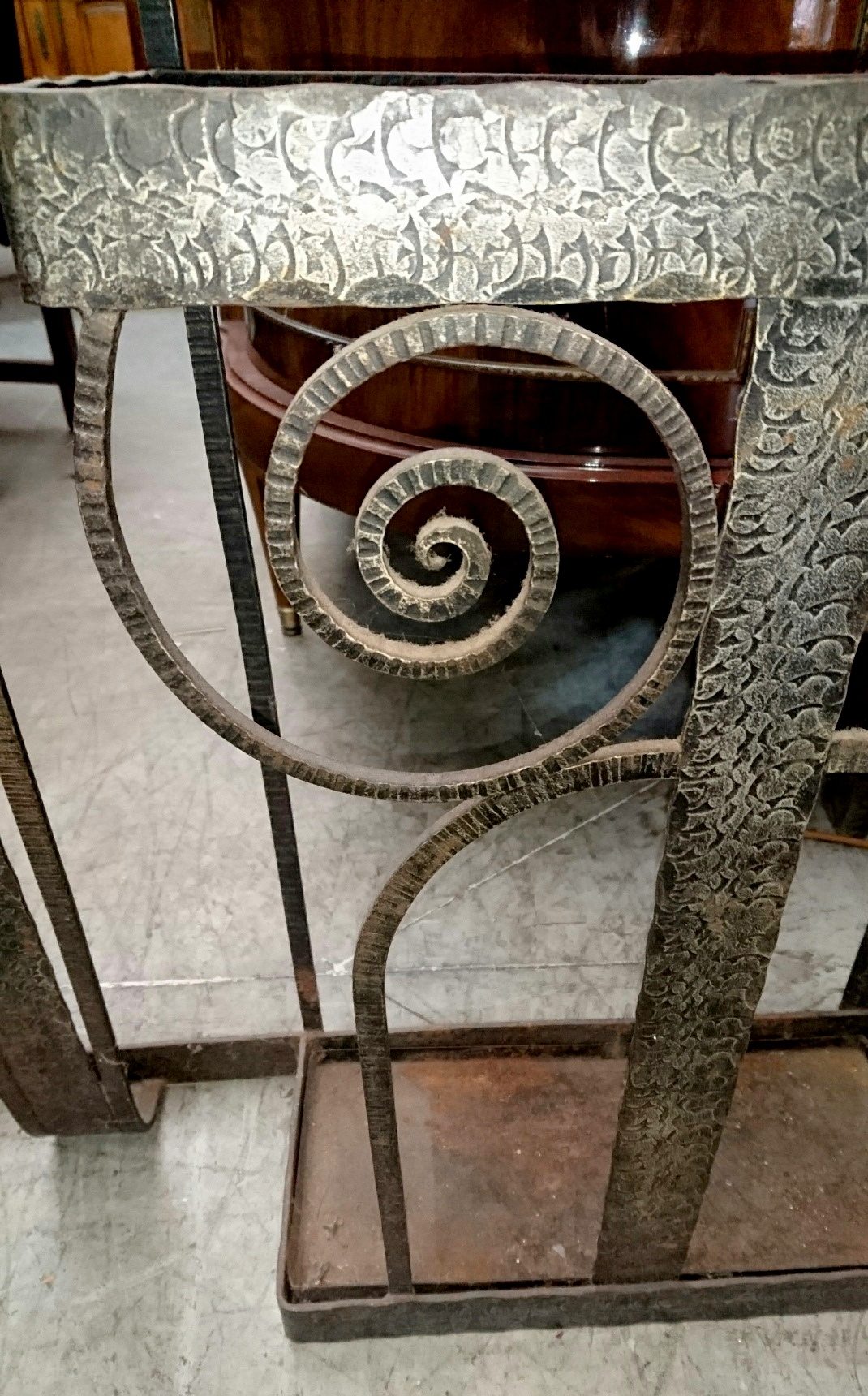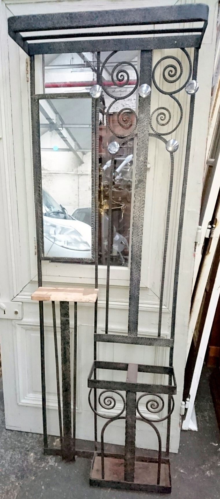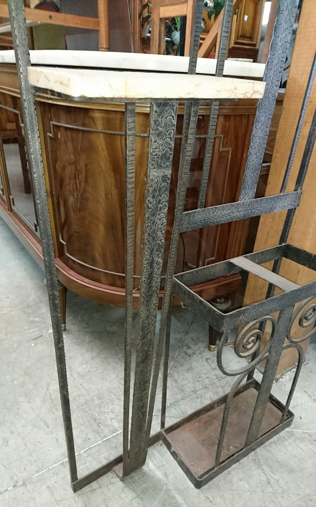 An early 20th century French Art Deco period, wrought iron coat and hat rack, fitted with a bevelled-edge mirror (not shown in photo) and its original Siena marble-top console, and retaining the original polished steel 'button' hooks. The lower section is fitted with umbrella and walking stick holders. Please note the quality of the textured hand-wrought iron. Area of Paris, circa 1930.