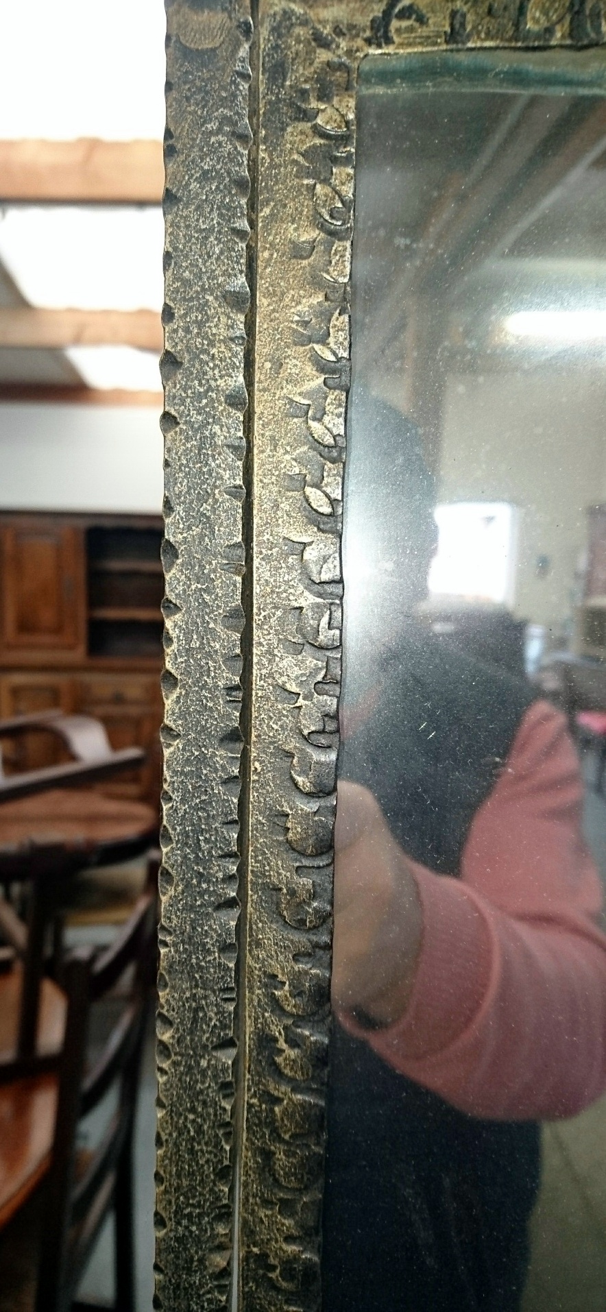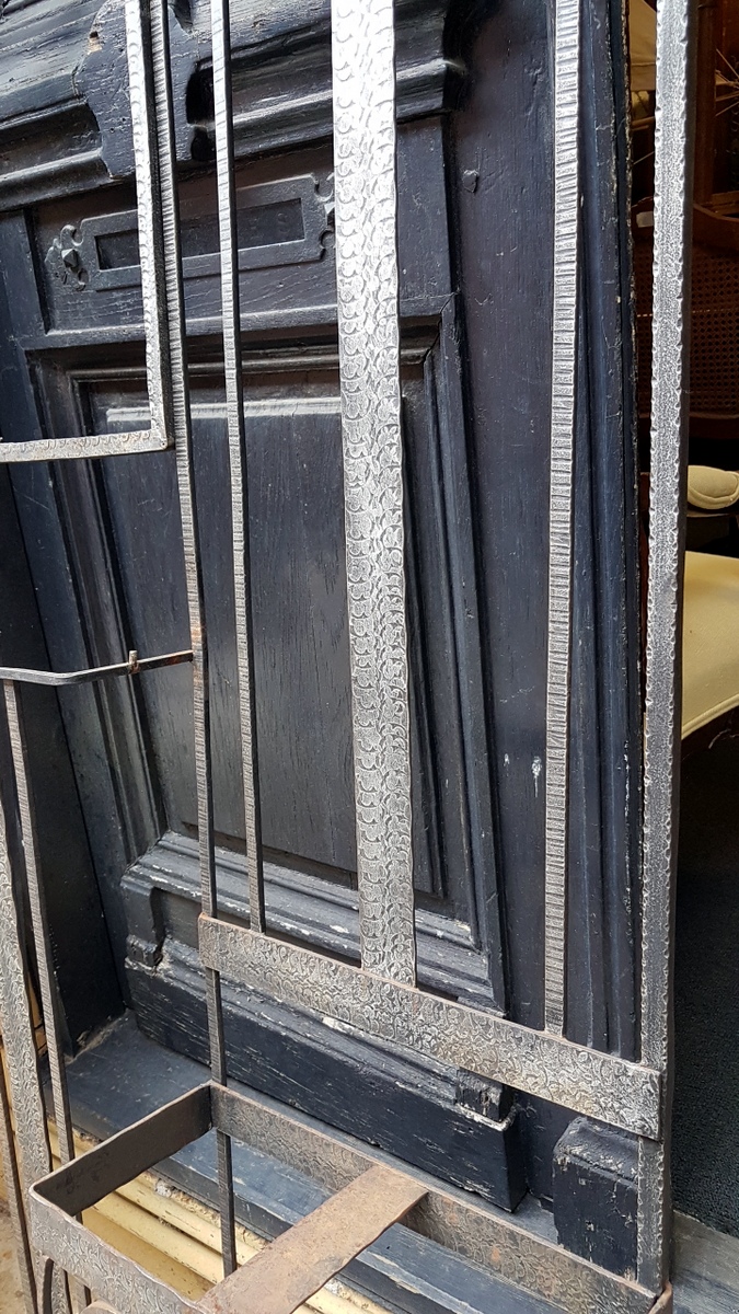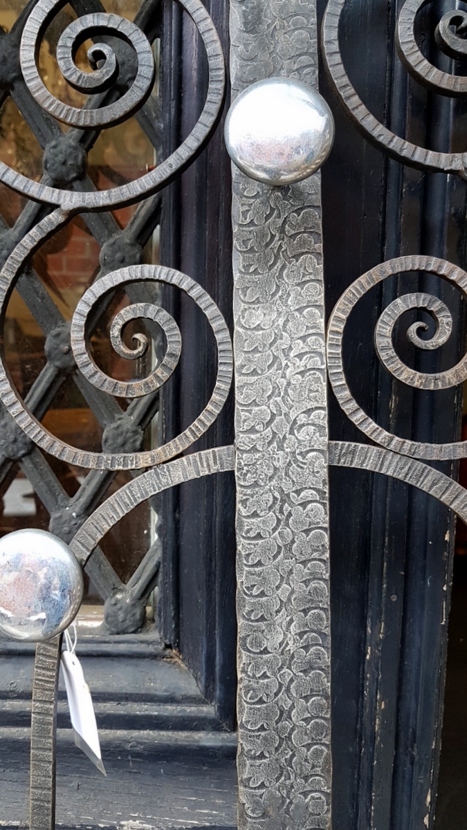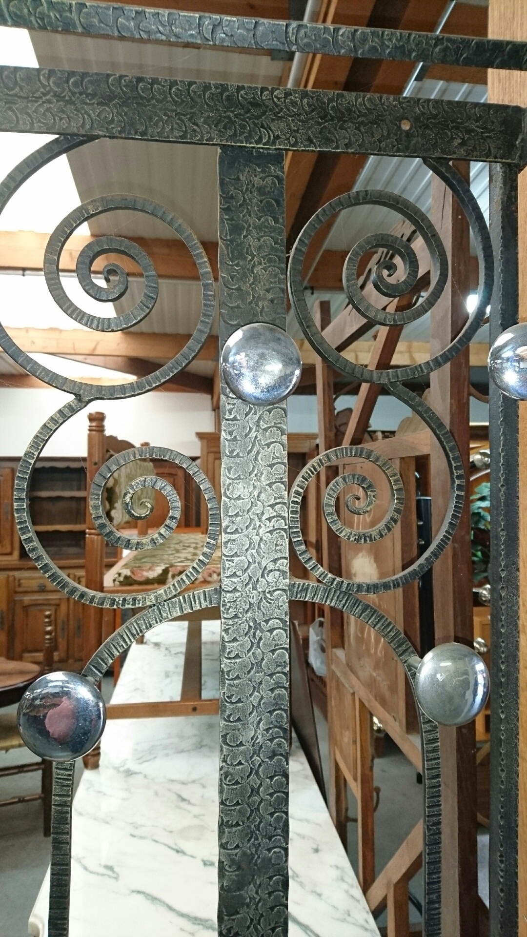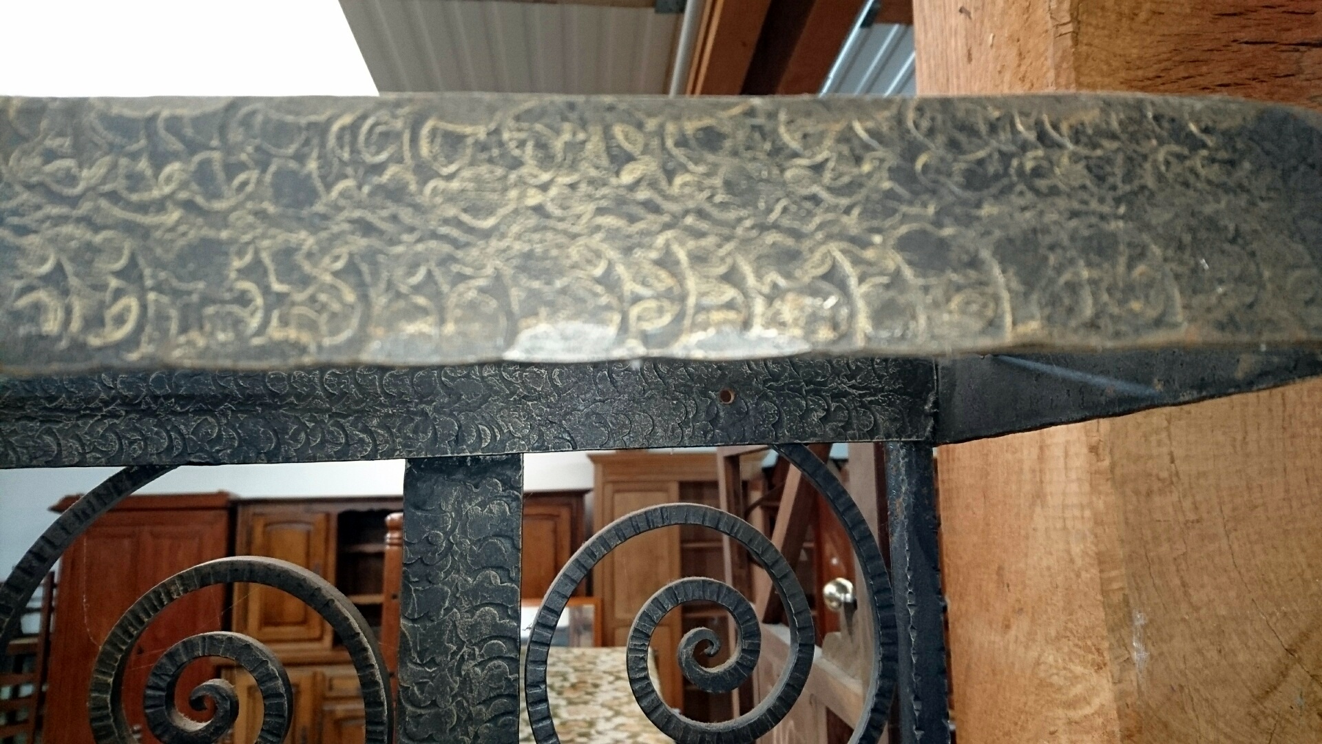 An early 20th century French Art Deco period, wrought iron coat and hat rack, fitted with a bevelled-edge mirror (not shown in photo) and its original Siena marble-top console, and retaining the original polished steel 'button' hooks. The lower section is fitted with umbrella and walking stick holders. Please note the quality of the textured hand-wrought iron. Area of Paris, circa 1930.