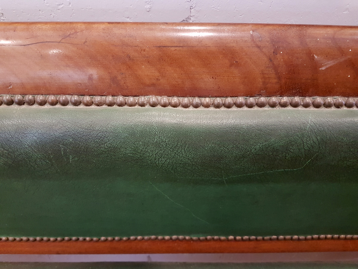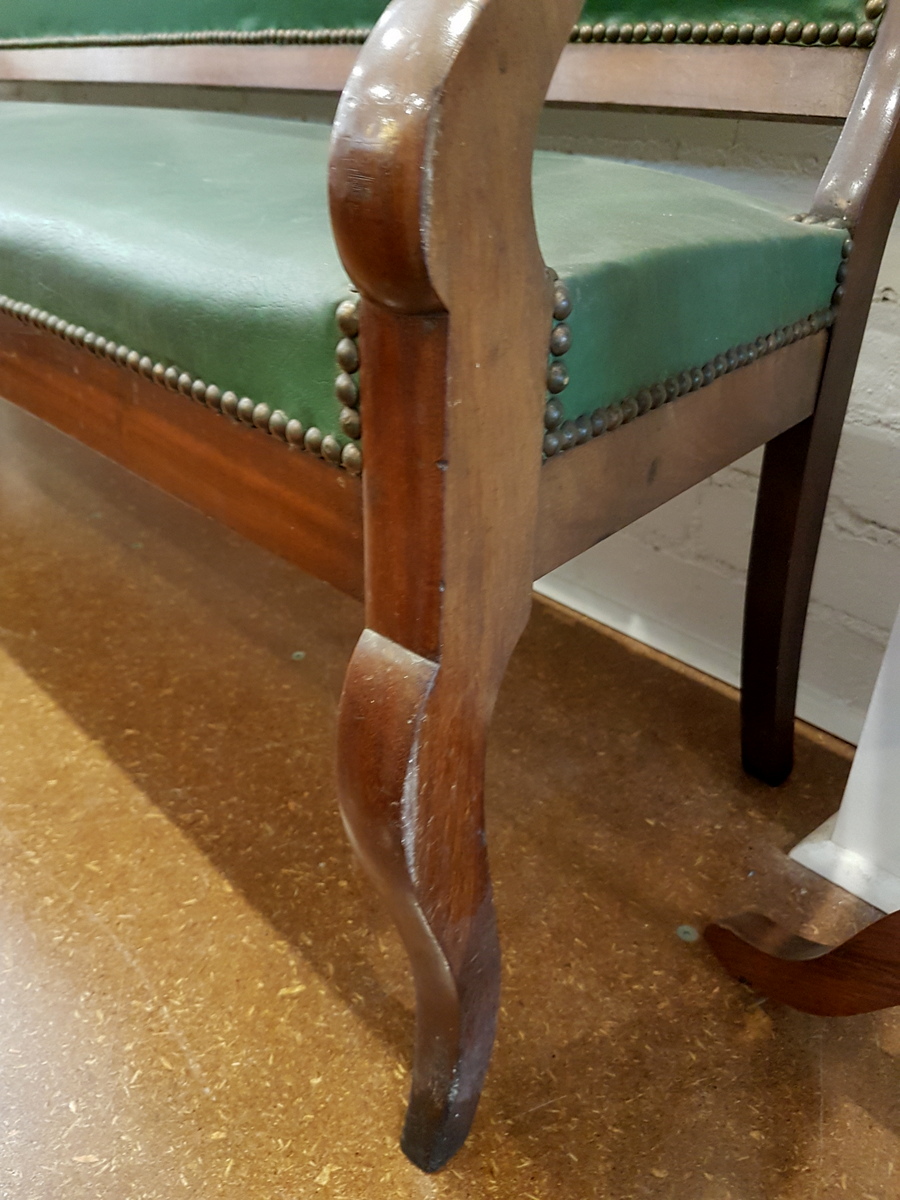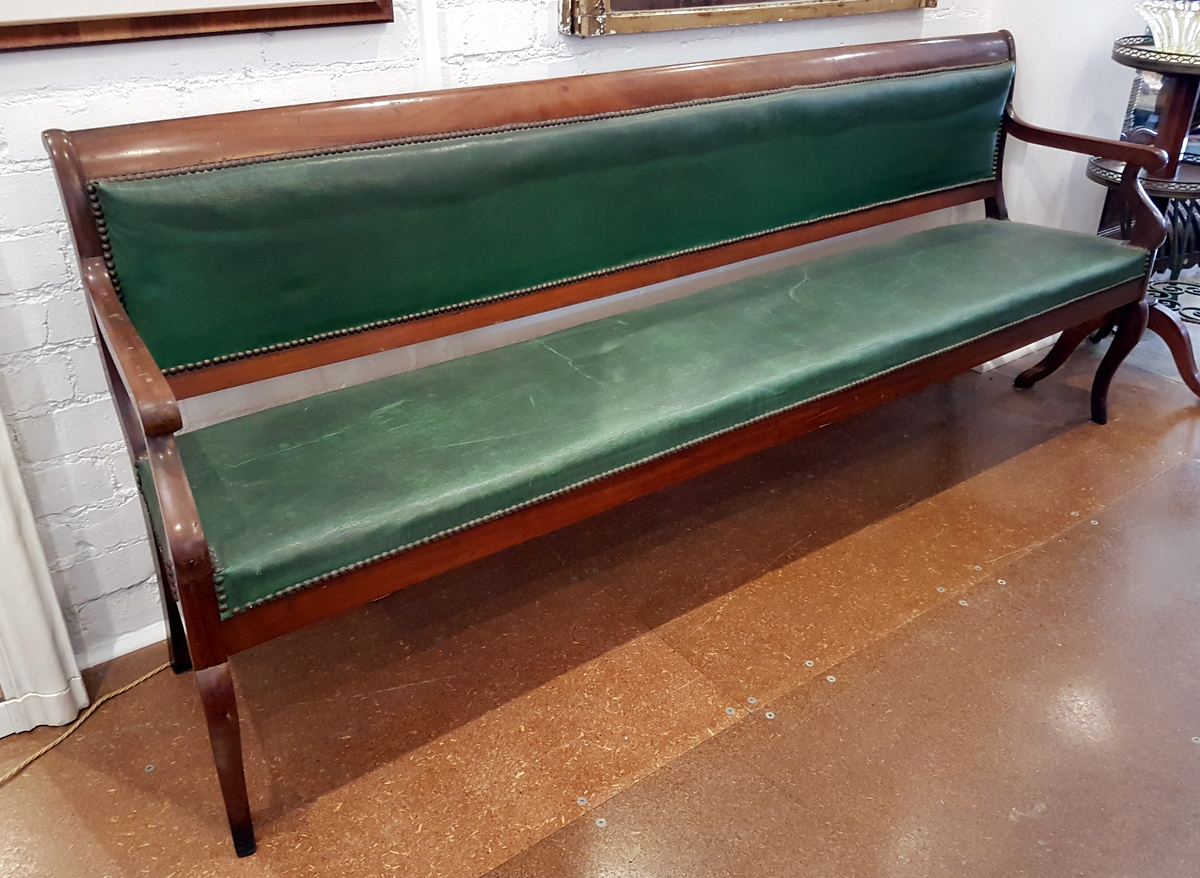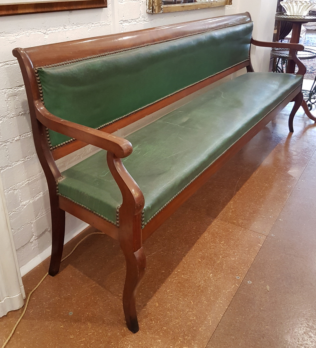 An early 19th century French Restauration period solid mahogany and leather-upholstered banquette bench seat of simple design and long and narrow proportions. Provenance: a chateaux's billiard room. Area of Normandy, circa 1830.