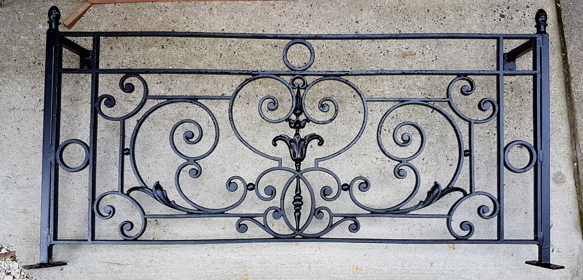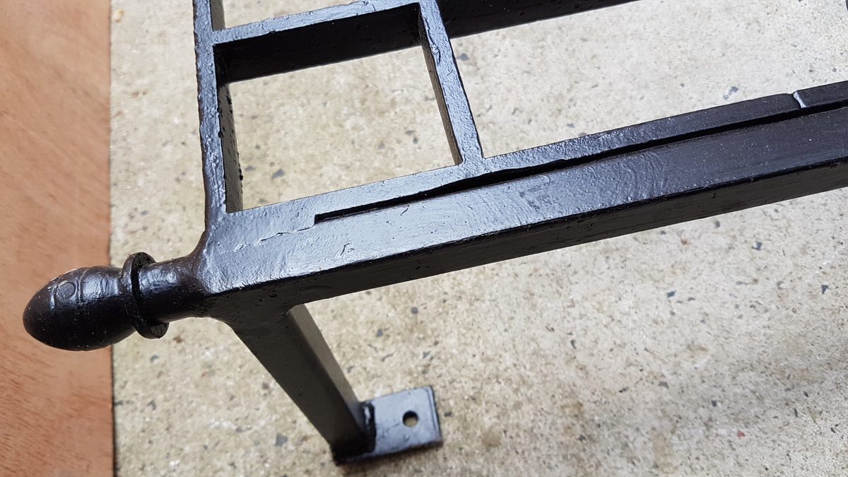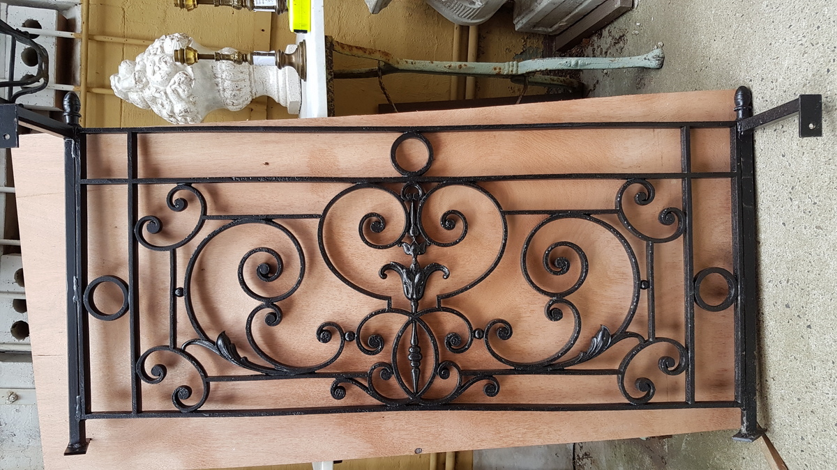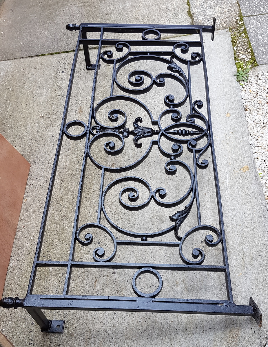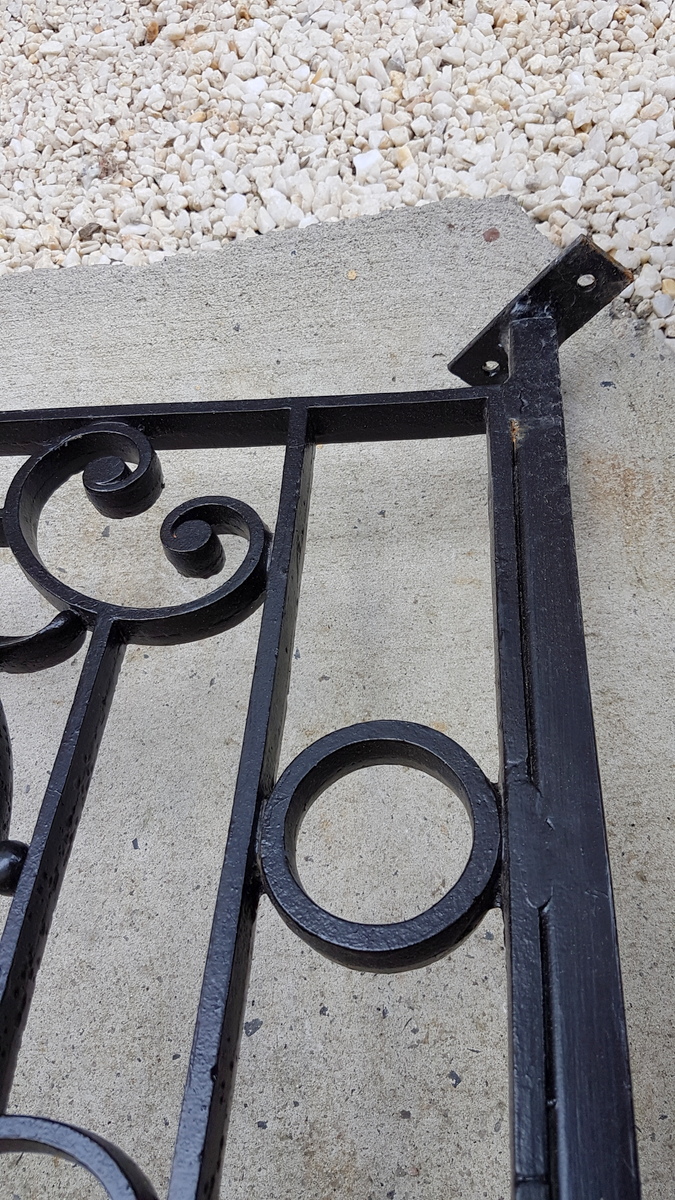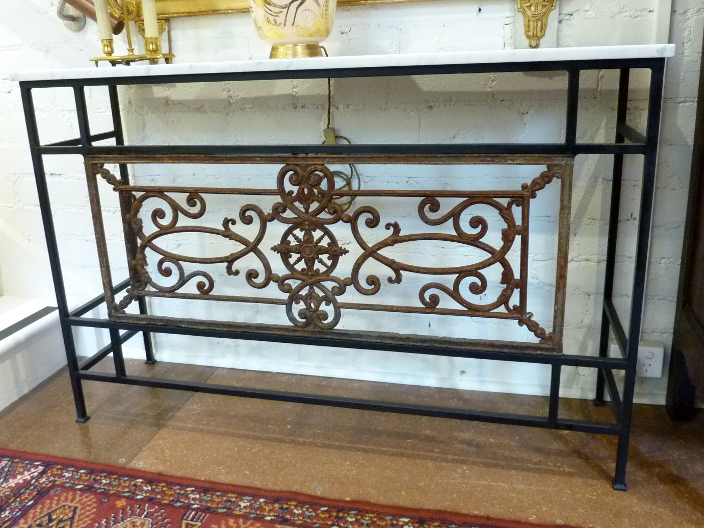 A 19th century French Napoleon III period cast iron balcony decorated with stylised scroll patterns. Area of Paris, circa 1870. Please note that Miguel has a very similar grille, stock nr. 7998. Our workshop can make this one into a matching balcony or console table. Our workshop can build to measure a traditional French “cache-radiateur”, a long and narrow console table, using this grille. For an examples of a similar console please see attached photo.