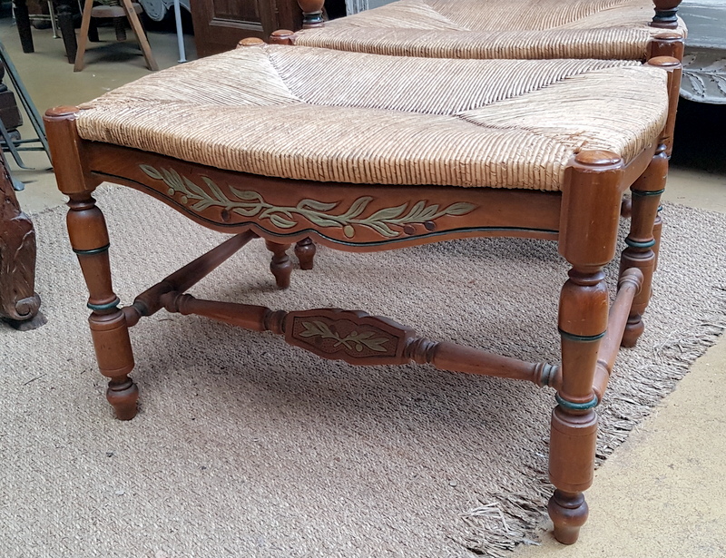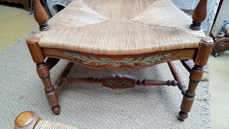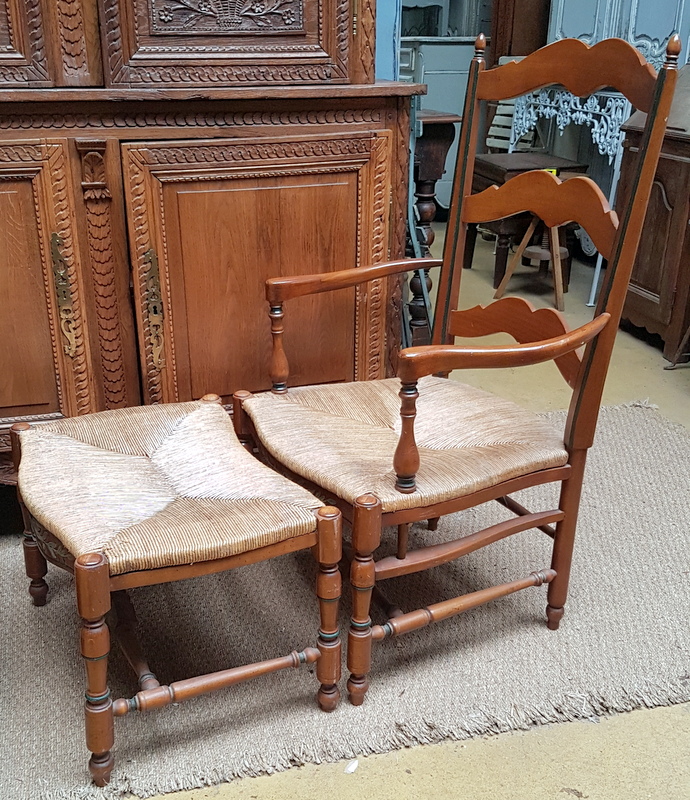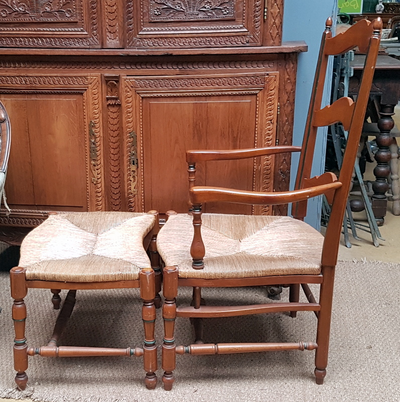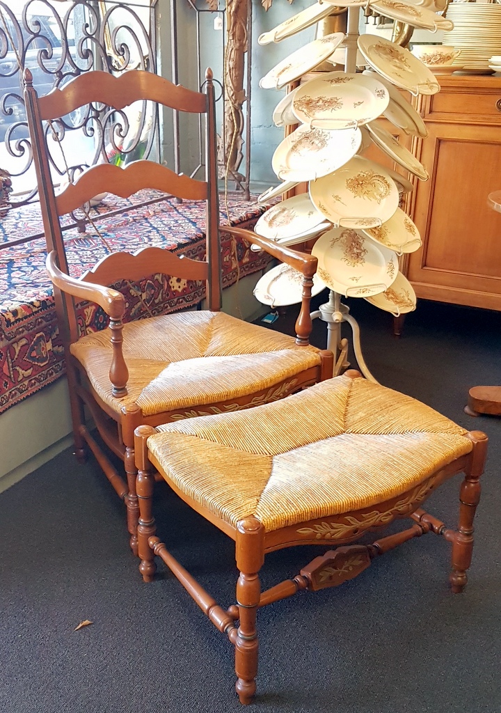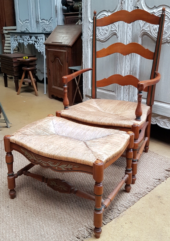 A French ladder-back lounging chaise longue armchair and adjoining stool, the ample 'envelope' shaped seats with woven rush. Typical provincial-Directoire ladderback design from the South of France, circa 1930.