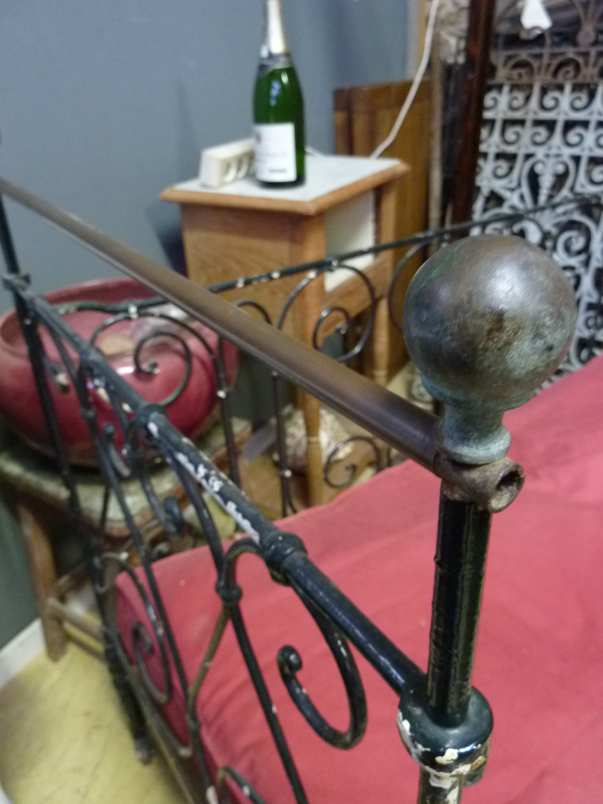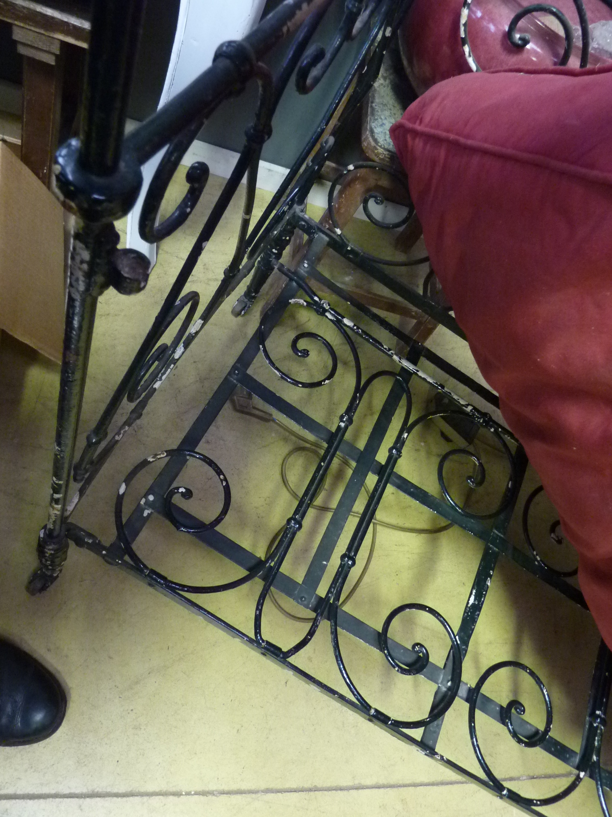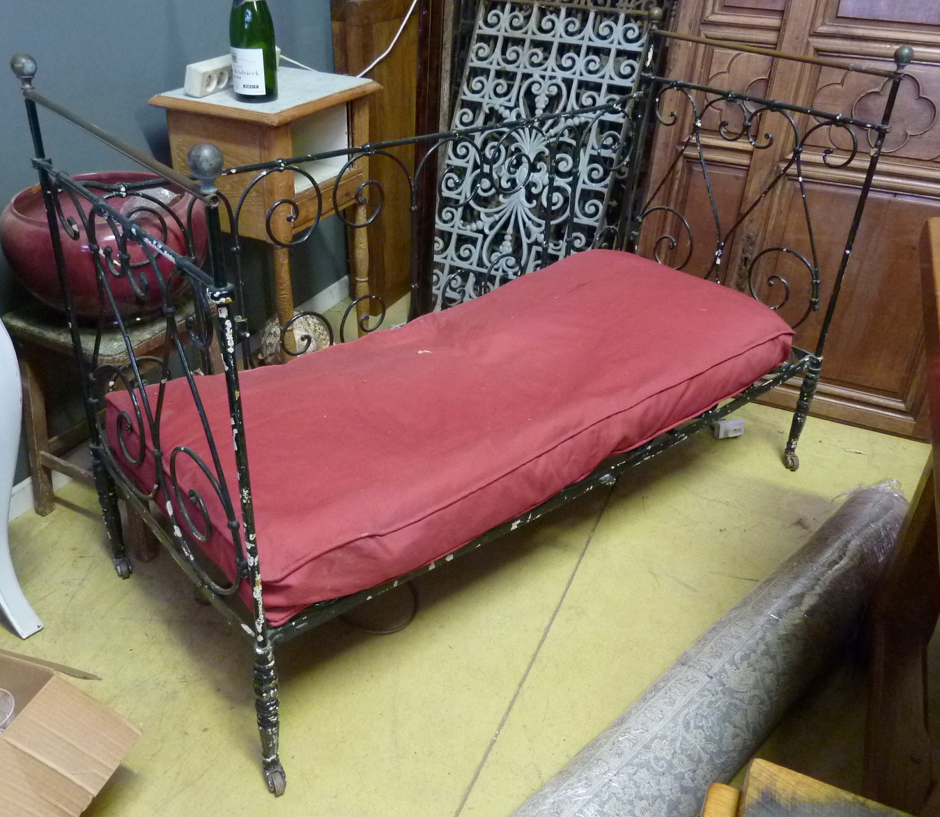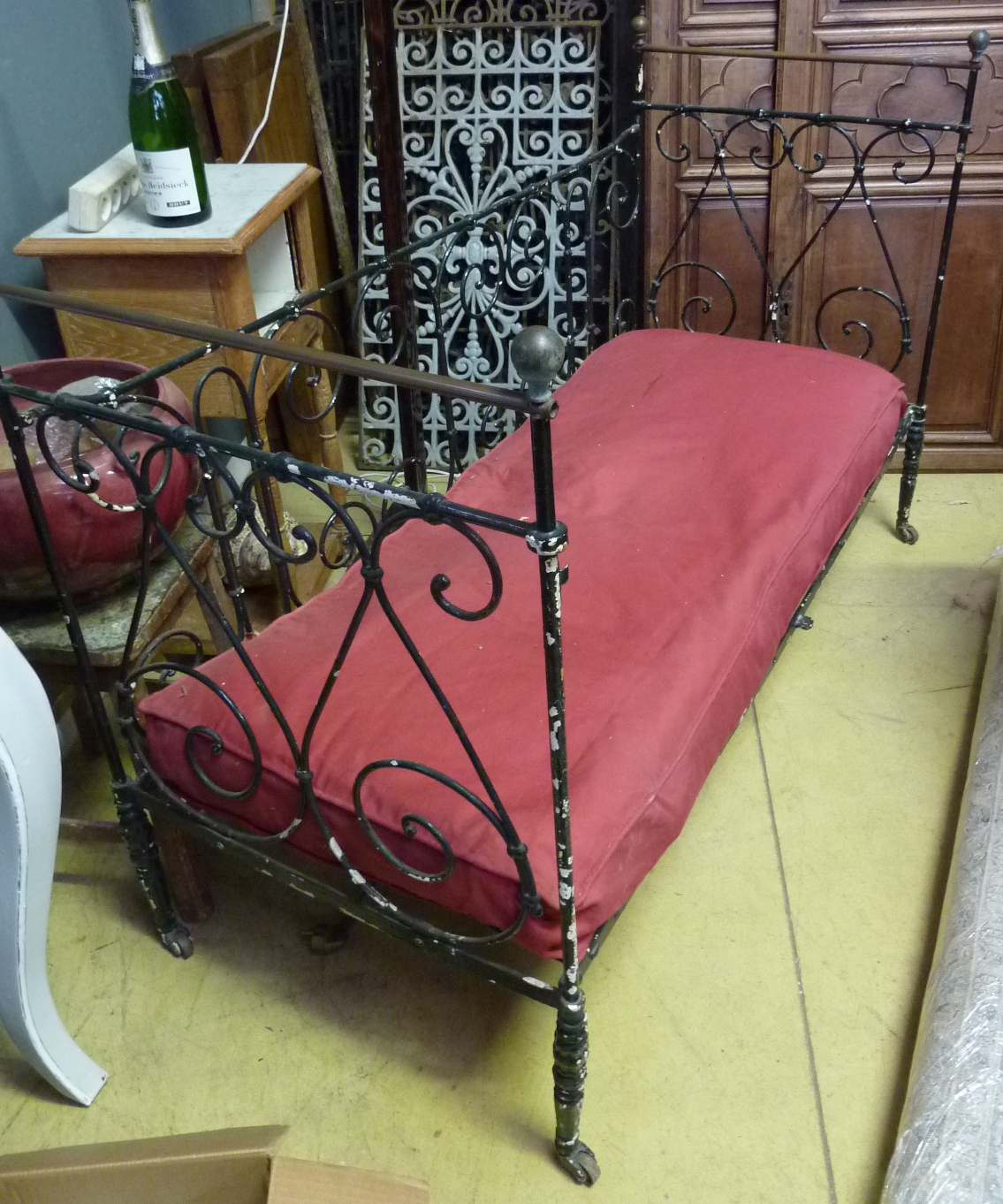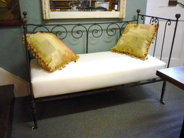 A 19th century French cast and wrought iron day bed, originally used as a collapsible cot. The fourth side of the original cot still exists, and is folded under the mattress. See also the photo of a similar bed, once it was restored.