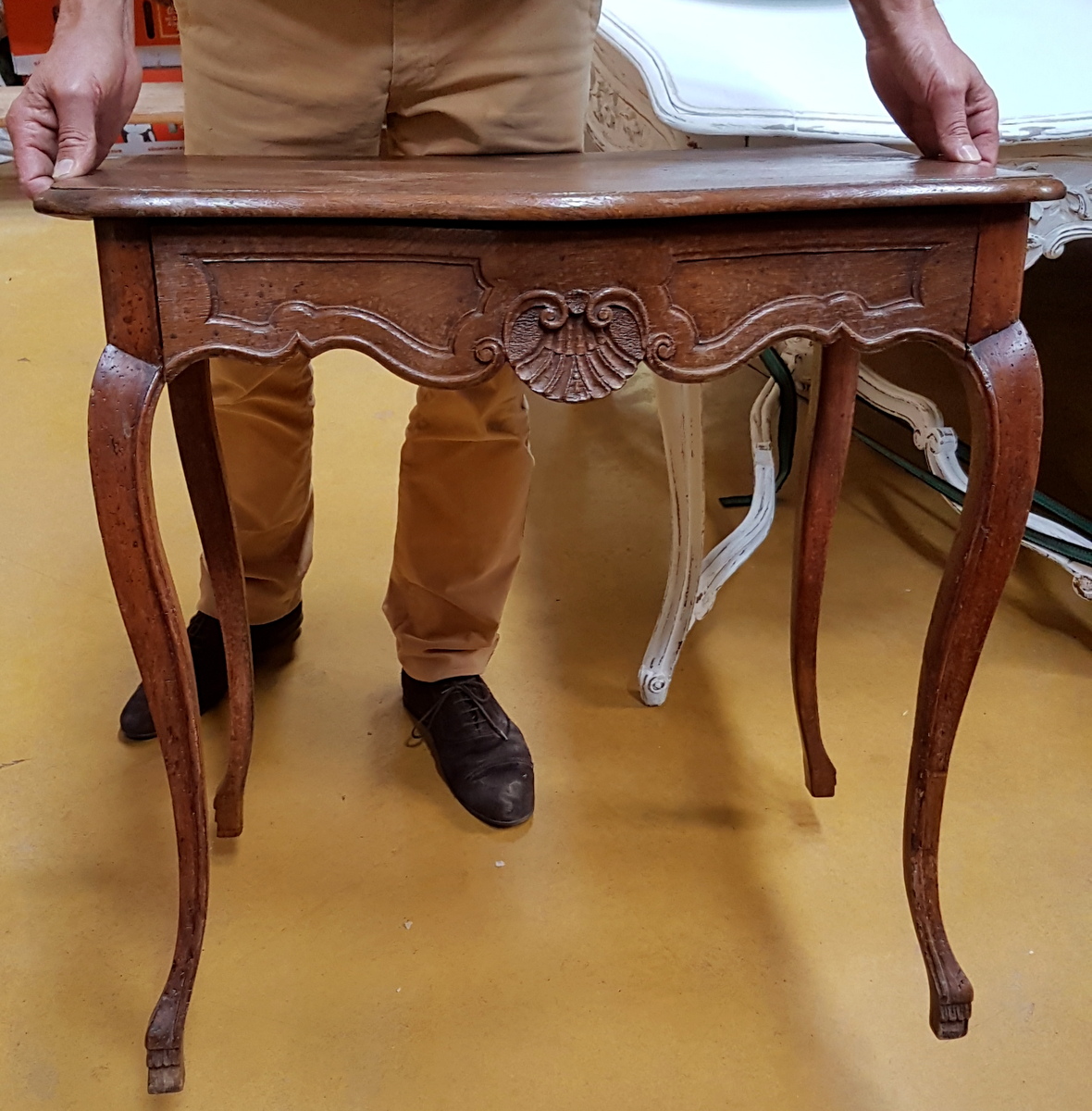 A mid 18th century French Louis XV period solid oak side table, the moulded top standing on four Cabriole legs, a shallow drawer opening in the shaped front rail, decorated with a shell motif. Note the perfection of proportions. Area of Rouen, circa 1750.