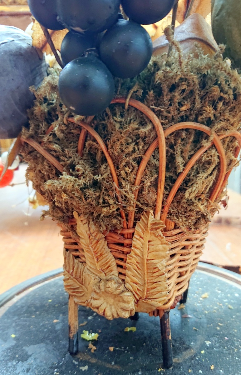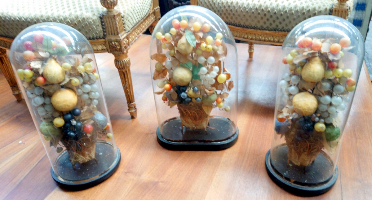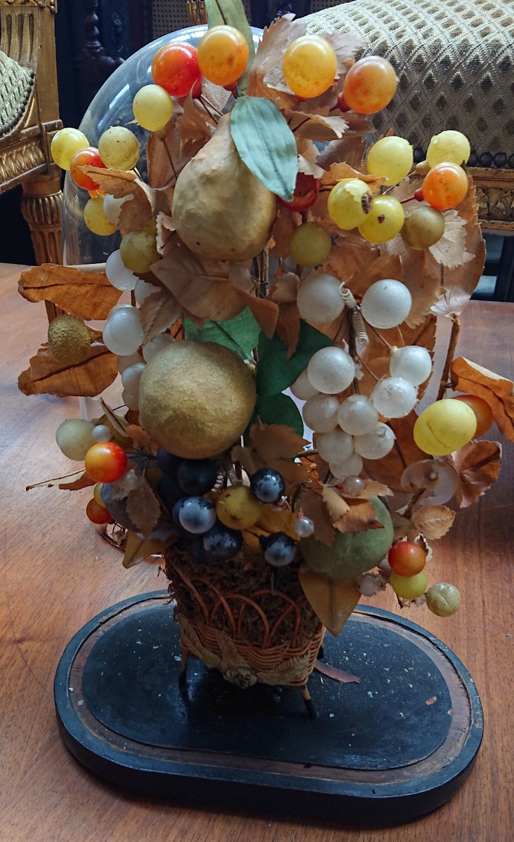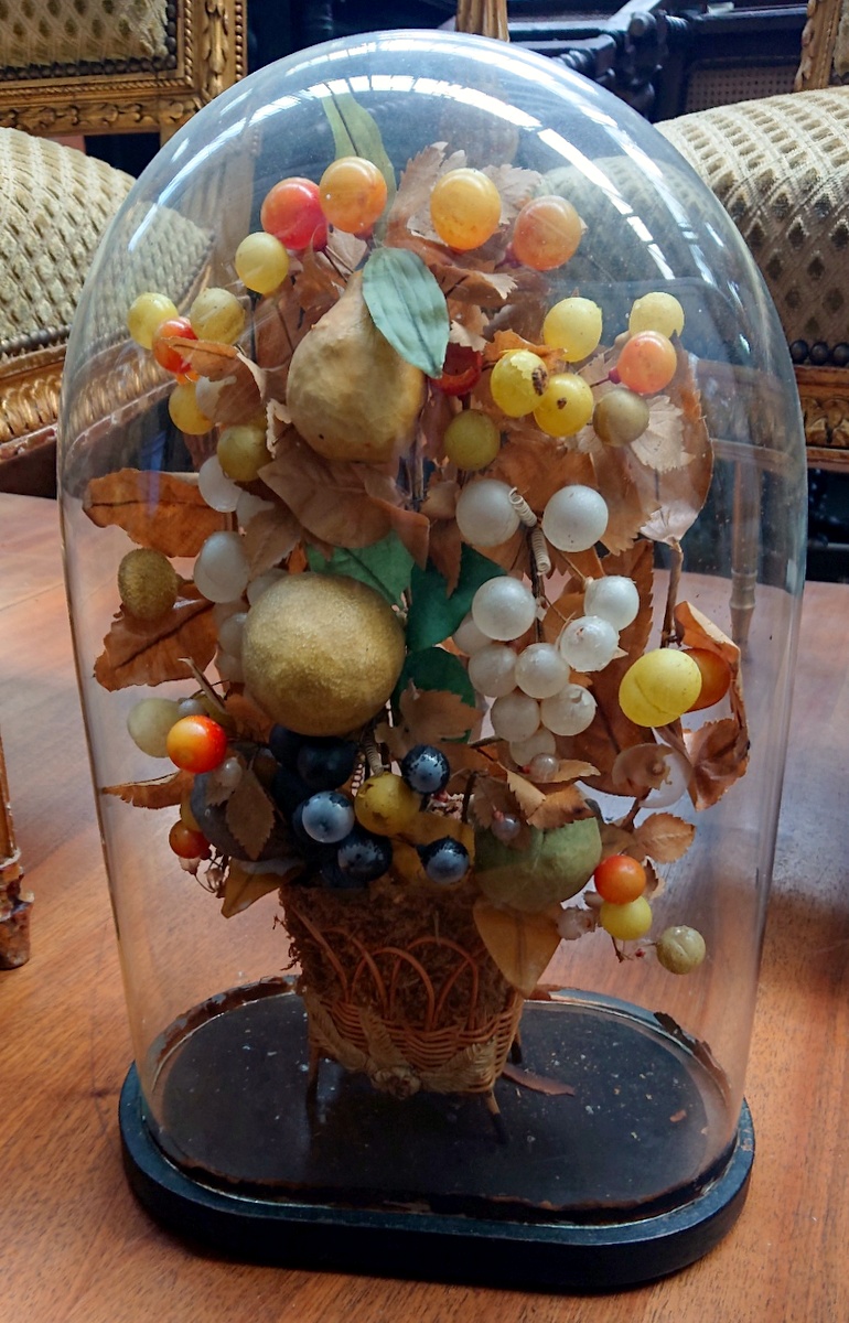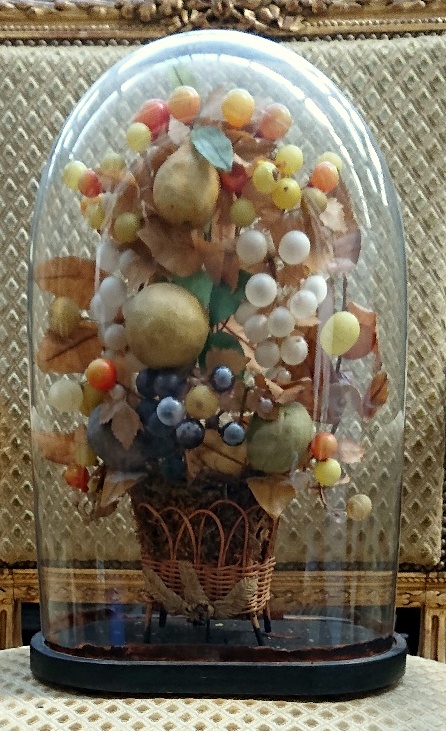 A mid 19th century French napoleon III period "Bouquet de MariƩe", an exquisite arrangement of flowers and fruit made from blown glass and fabric, emanating from a wicker basket. Retaining the original ebonised plinth and blown glass dome. Area of Paris, circa 1860. Miguel has a set of three Marriage bouquets arriving. The price is for the single bouquet shown in the main photo.