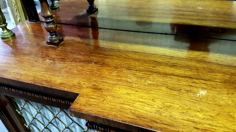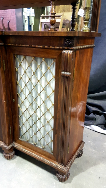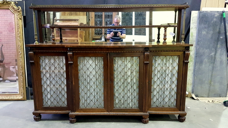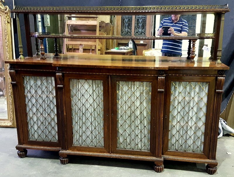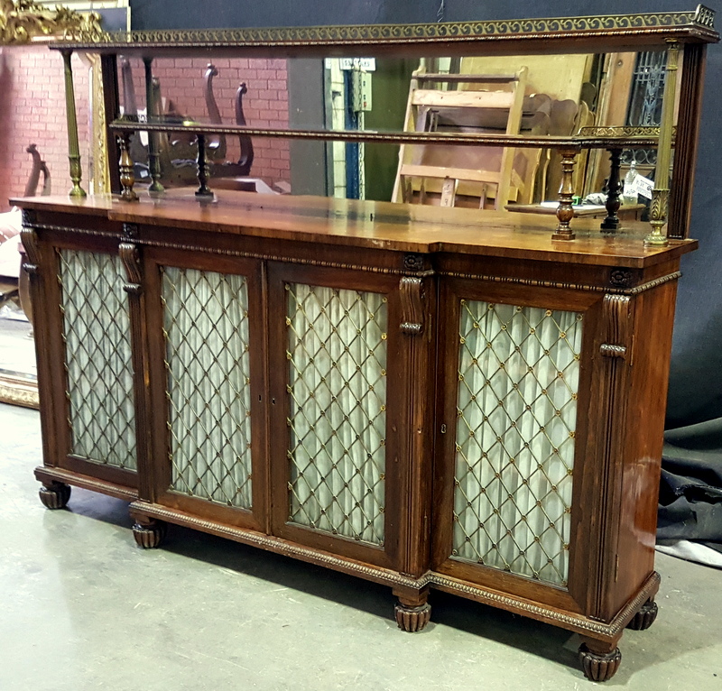 A mid 19th century, French Napoleon III period, rosewood and gilt brass-mounted, long and narrow Chiffonier dresser, the top section with two shelves supported by finely turned gilt brass balusters, retaining the original mirror-back, and fitted with fretted gilt brass galleries. The main body with a stepped front and with four glazed and gilt brass-grilled doors, backed by pleated curtains. Internally fitted with drawers designed to store silverware. Note the exquisite quality of the carved mouldings and corbels, and the colour of the original and excellent, faded rosewood patina. Area of Paris, circa 1860.