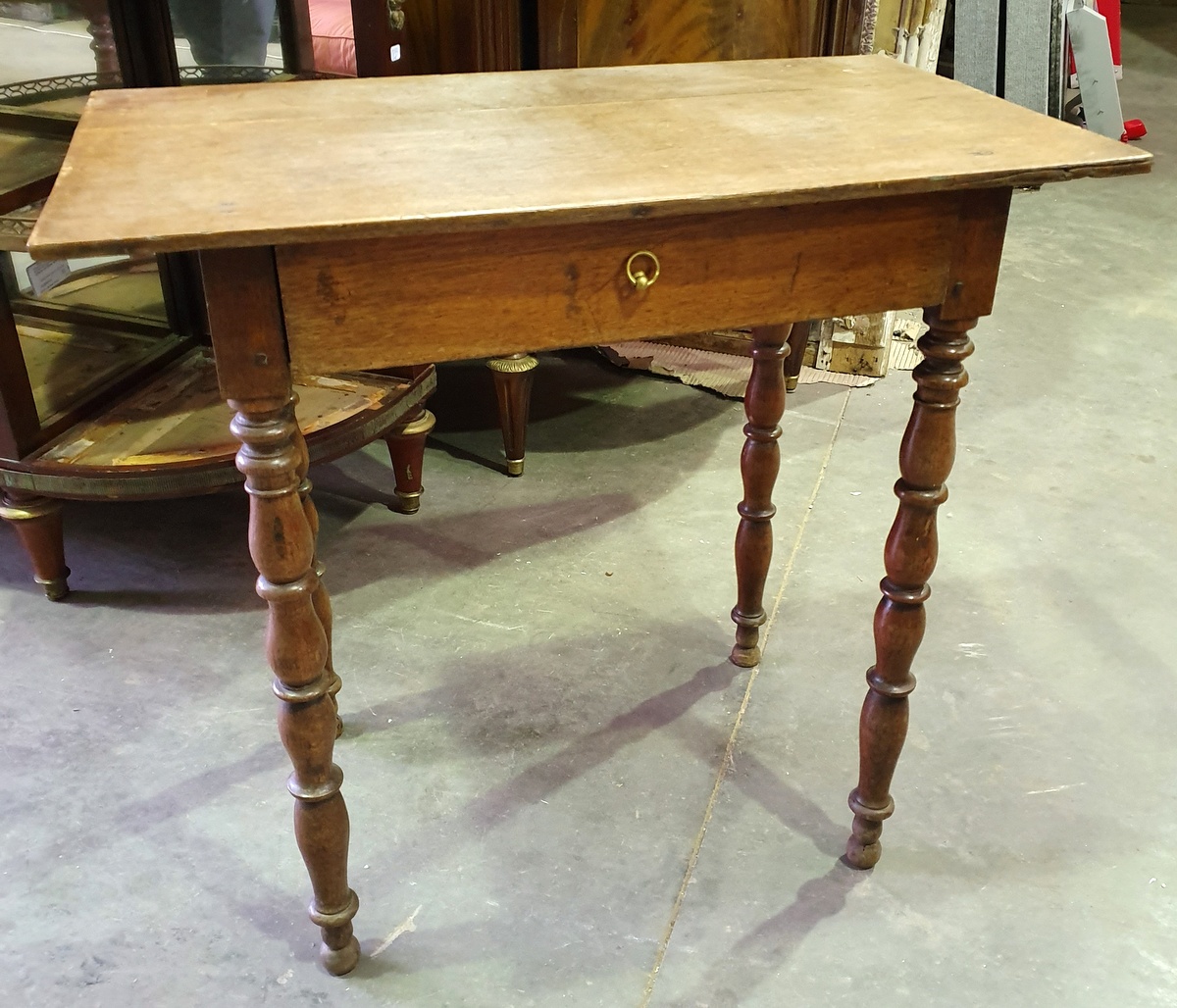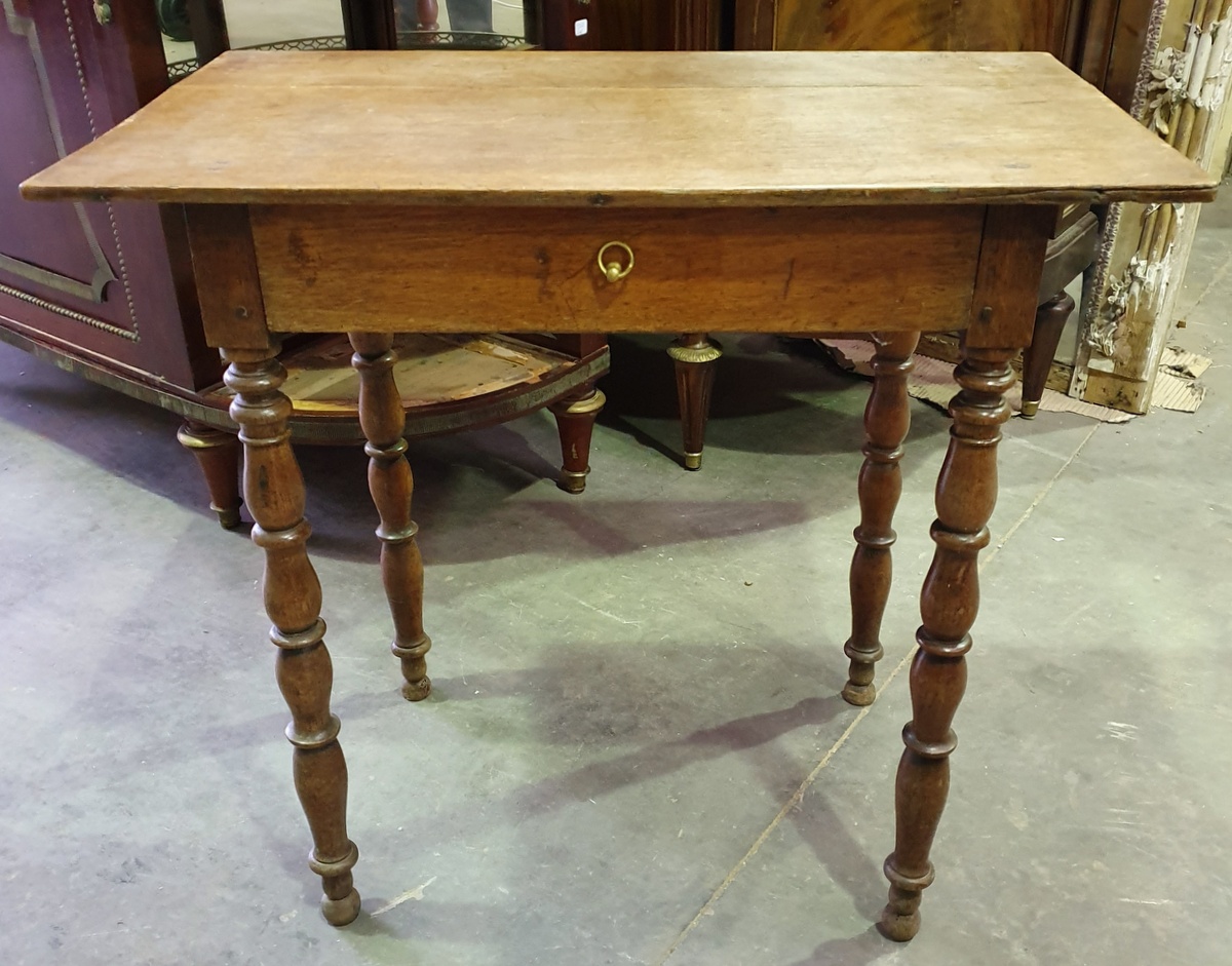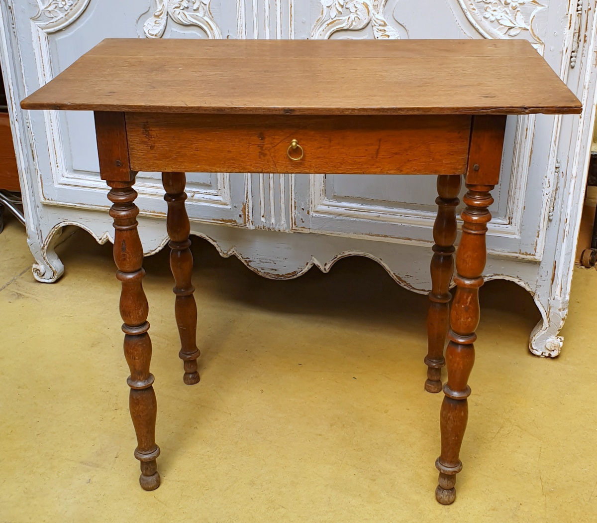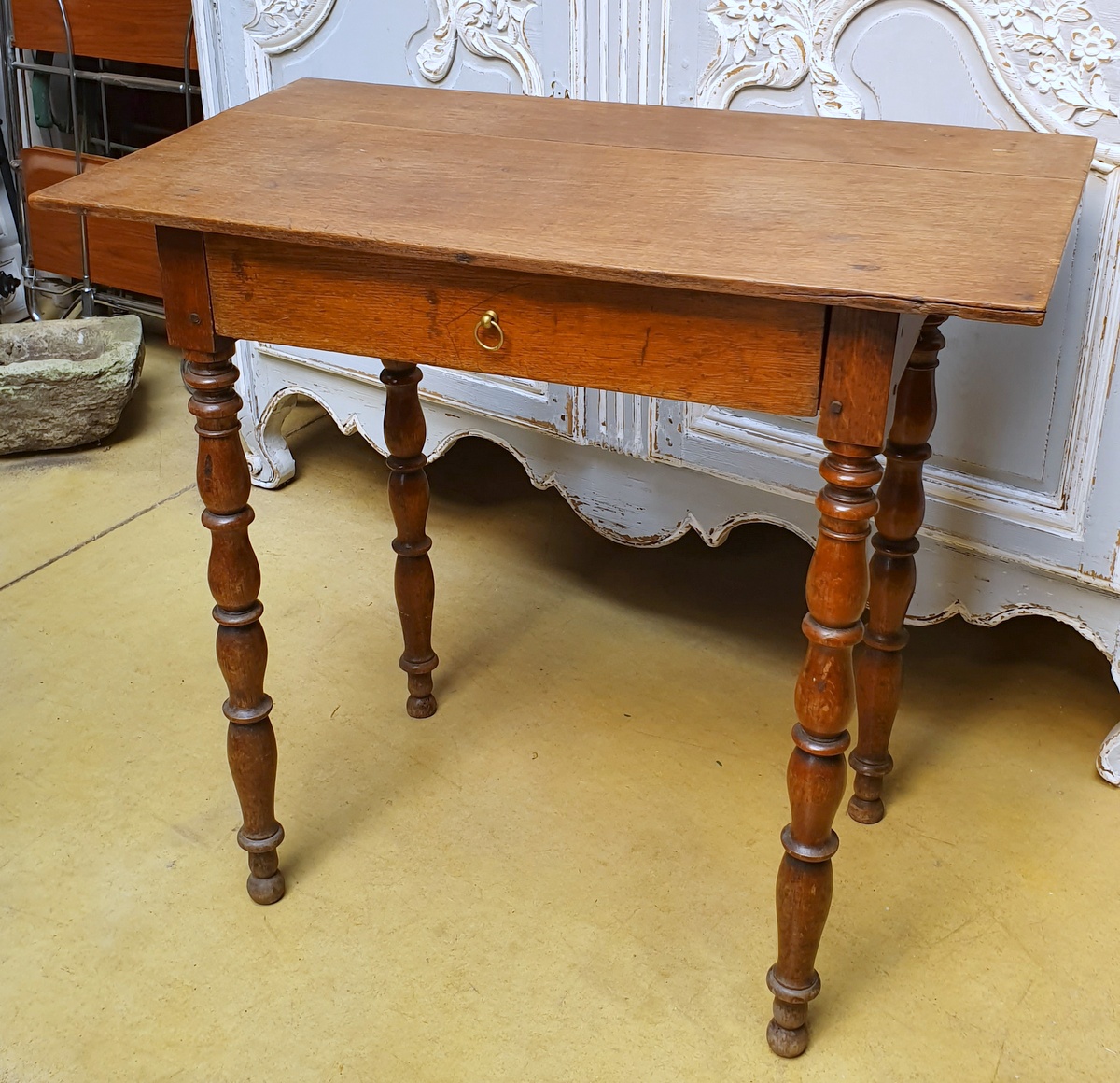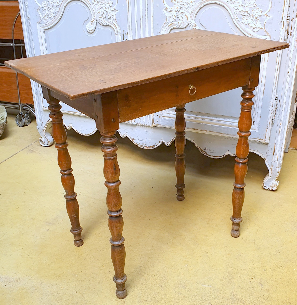 An early 19th century French Restauration period solid blond oak side table, the rectangular top above a shallow drawer, standing on typical Jacob-design turned baluster legs, (Georges Jacob, 1739–1814). Jacob was a prominent cabinetmaker of the turn of the 18th and 19th centuries, and his design of book-matched turned legs were the fashion of the time. Area of Paris, circa 1820.