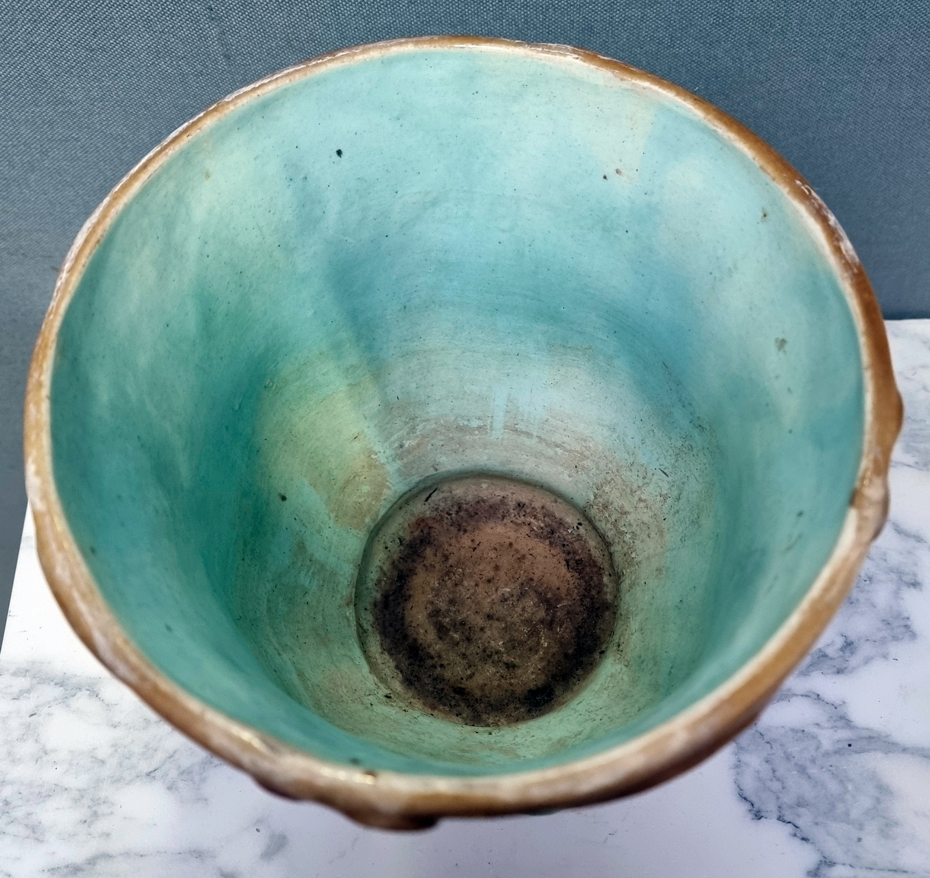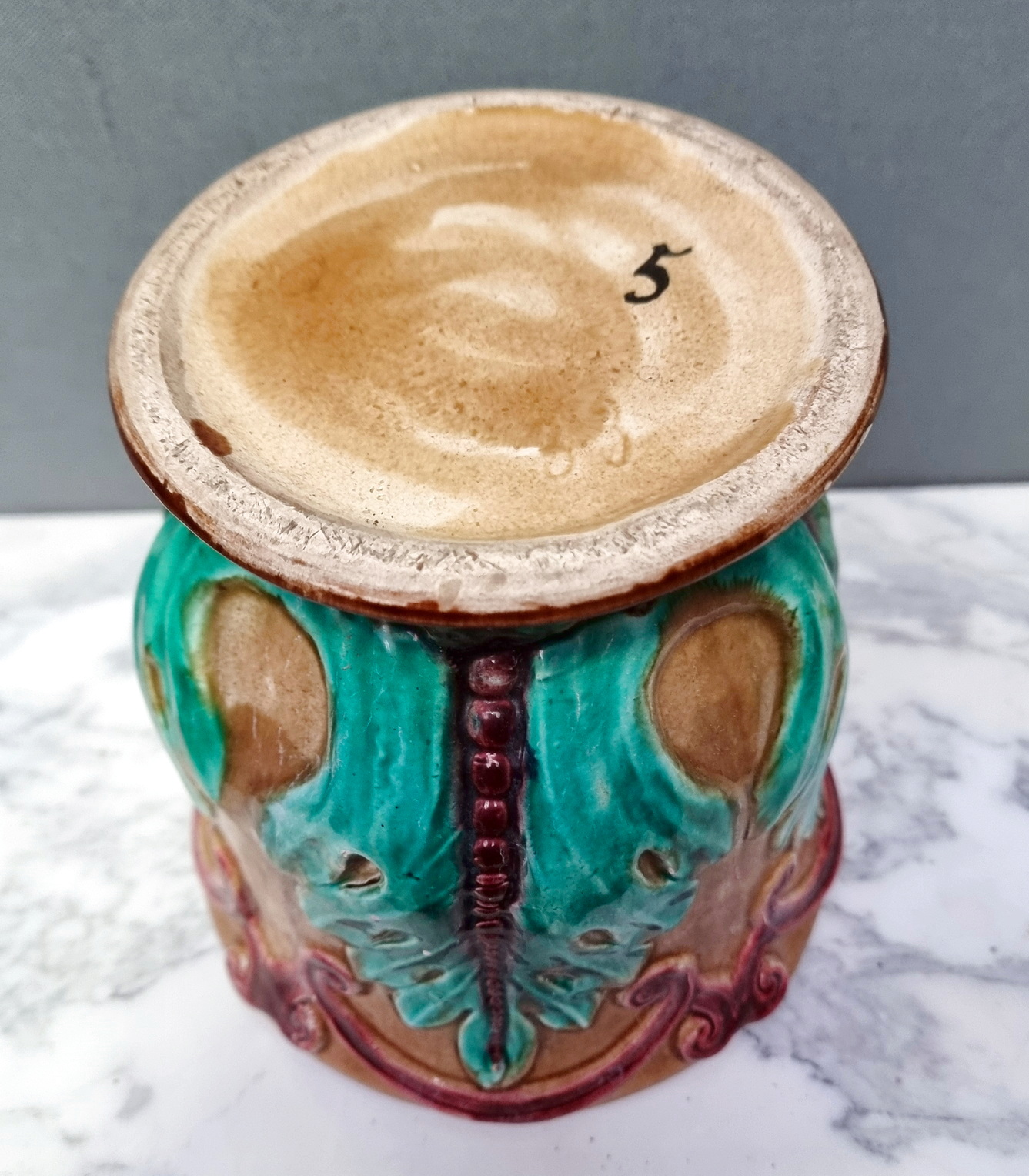 An early 20th century French Art Nouveau period majolica ‘cache-pot’ jardiniere planter vase, the Classical baluster shape decorated with haut relief palm frond patterns and scrollwork, the colours and patterns of the glaze typical of the barbotine De Bruyn majolica. The underside with the potter's stamp. Area of Lille, Northern France, circa 1900.