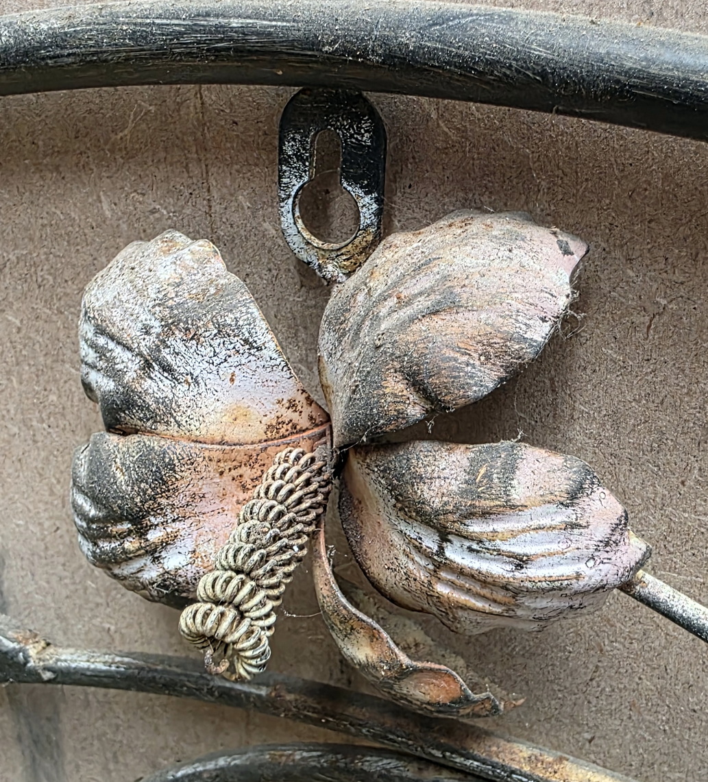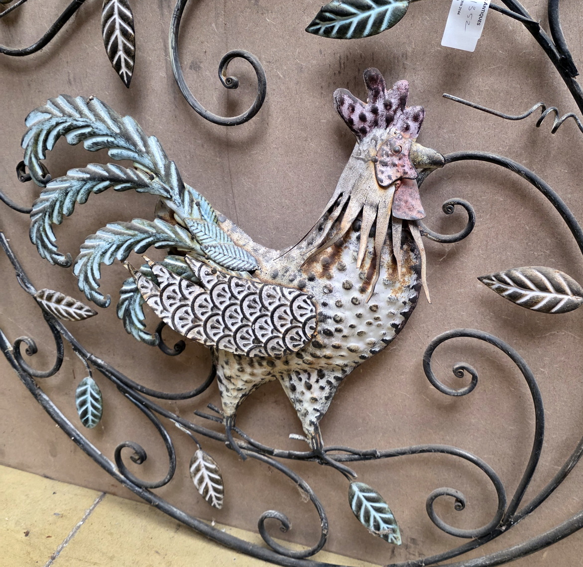 A vintage French wall decoration in the shape of a round wrought iron panel depicting a 'coq gaulois' rooster, a symbol of France. Please note the whimsical foliate motifs surrounding the rooster. Please note: this panel is suitable as a decorative piece for a garden wall. France, circa 1970.