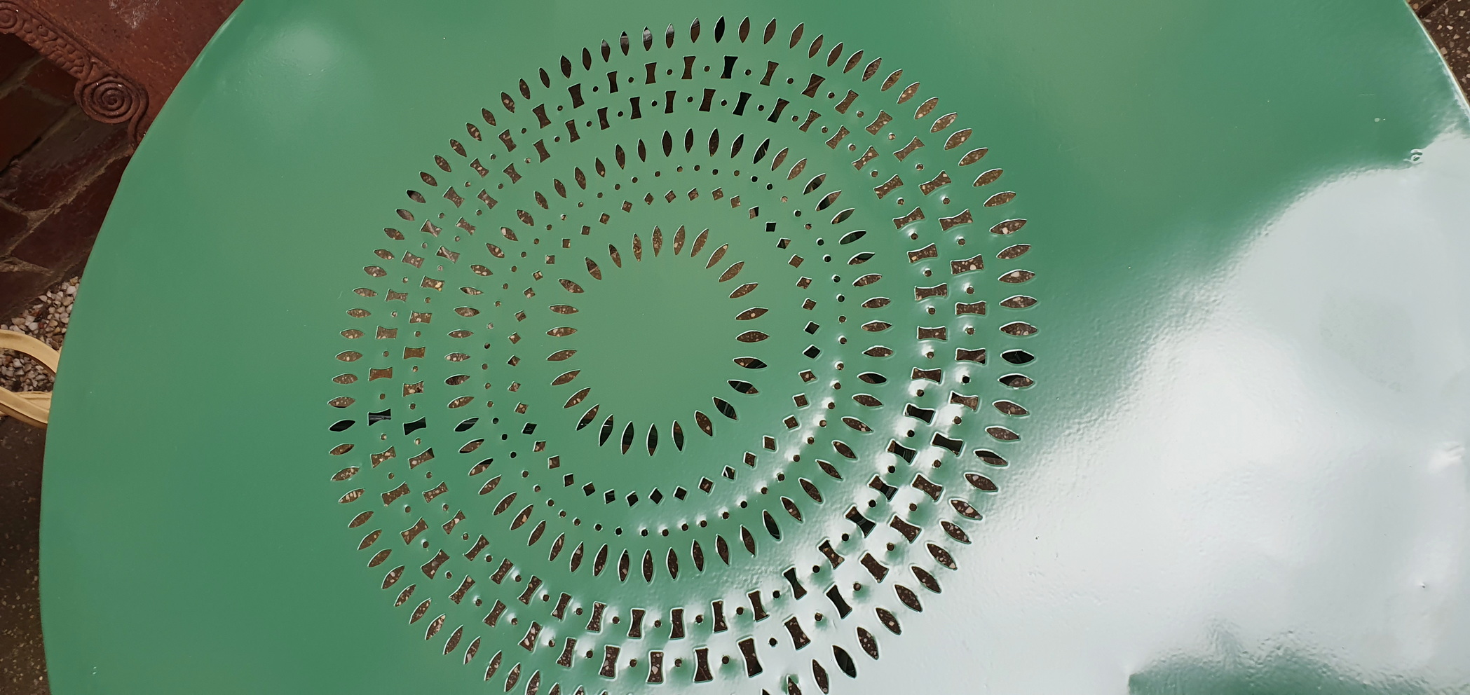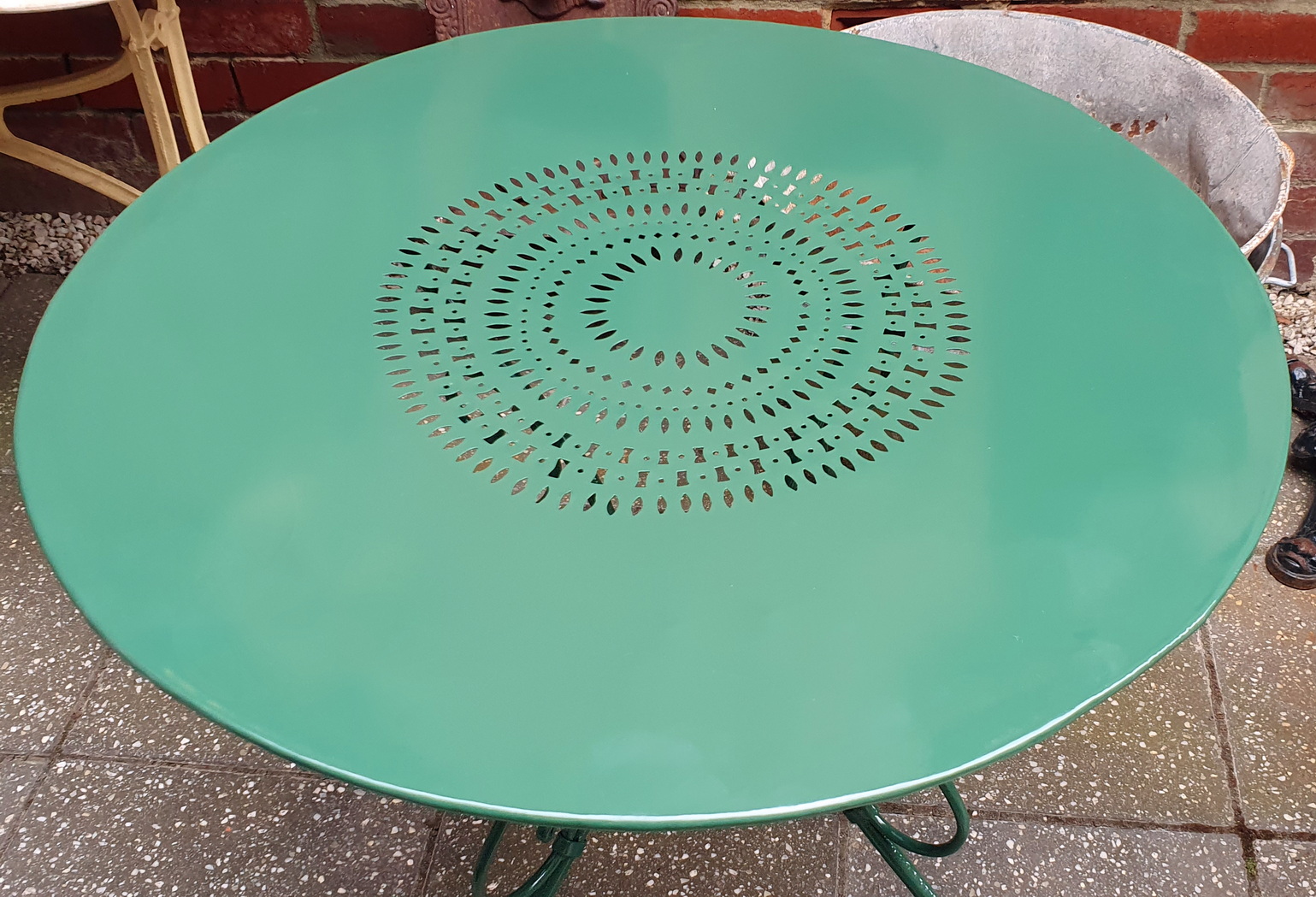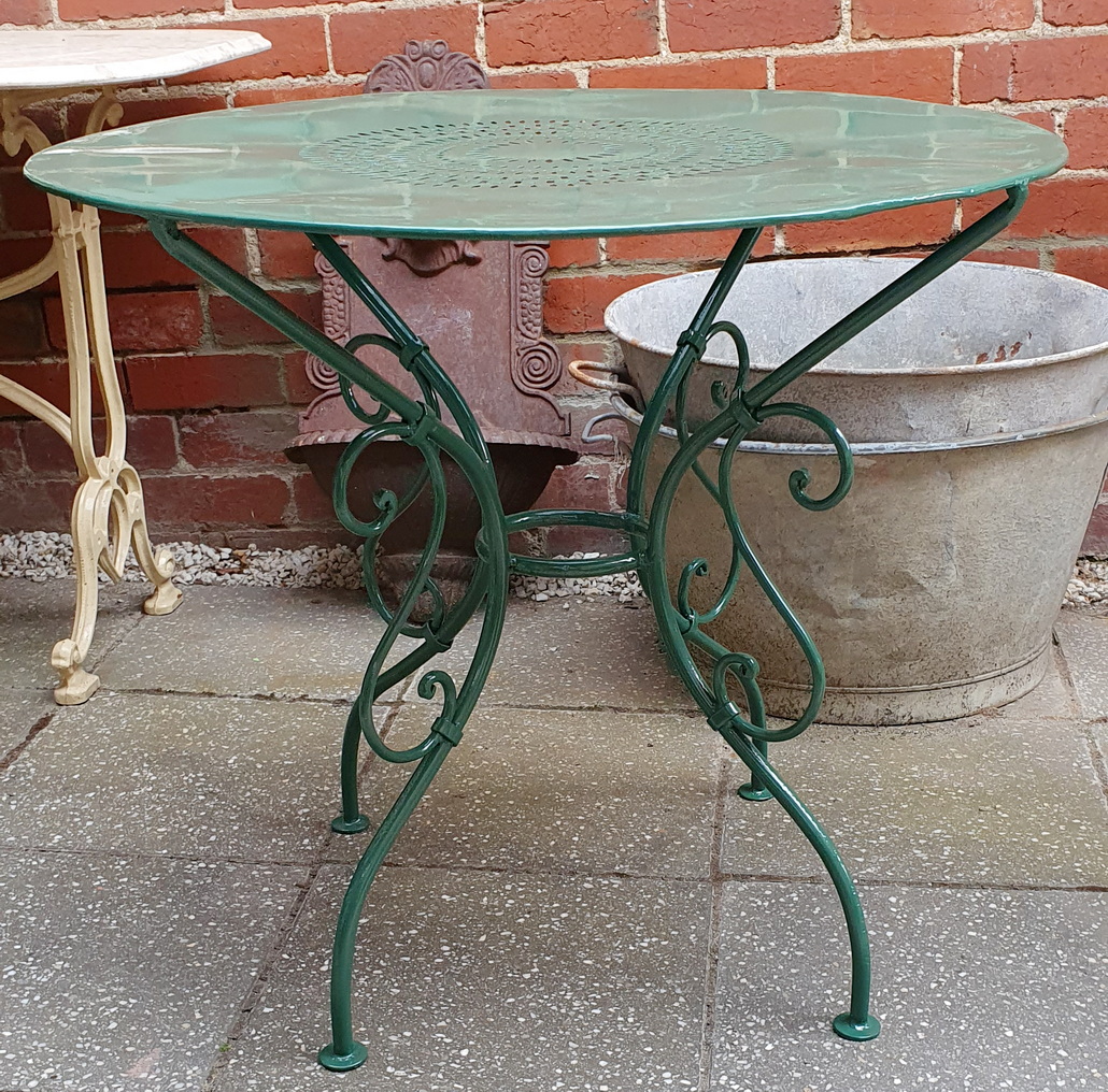 A French wrought iron and tole-work garden table of Classic shape, the top with hand-cut fretted geometrical patterns, the underside decorated with traditional scroll-work. Lightweight and easy to carry, it can be used as a cellar wine-tasting table.
