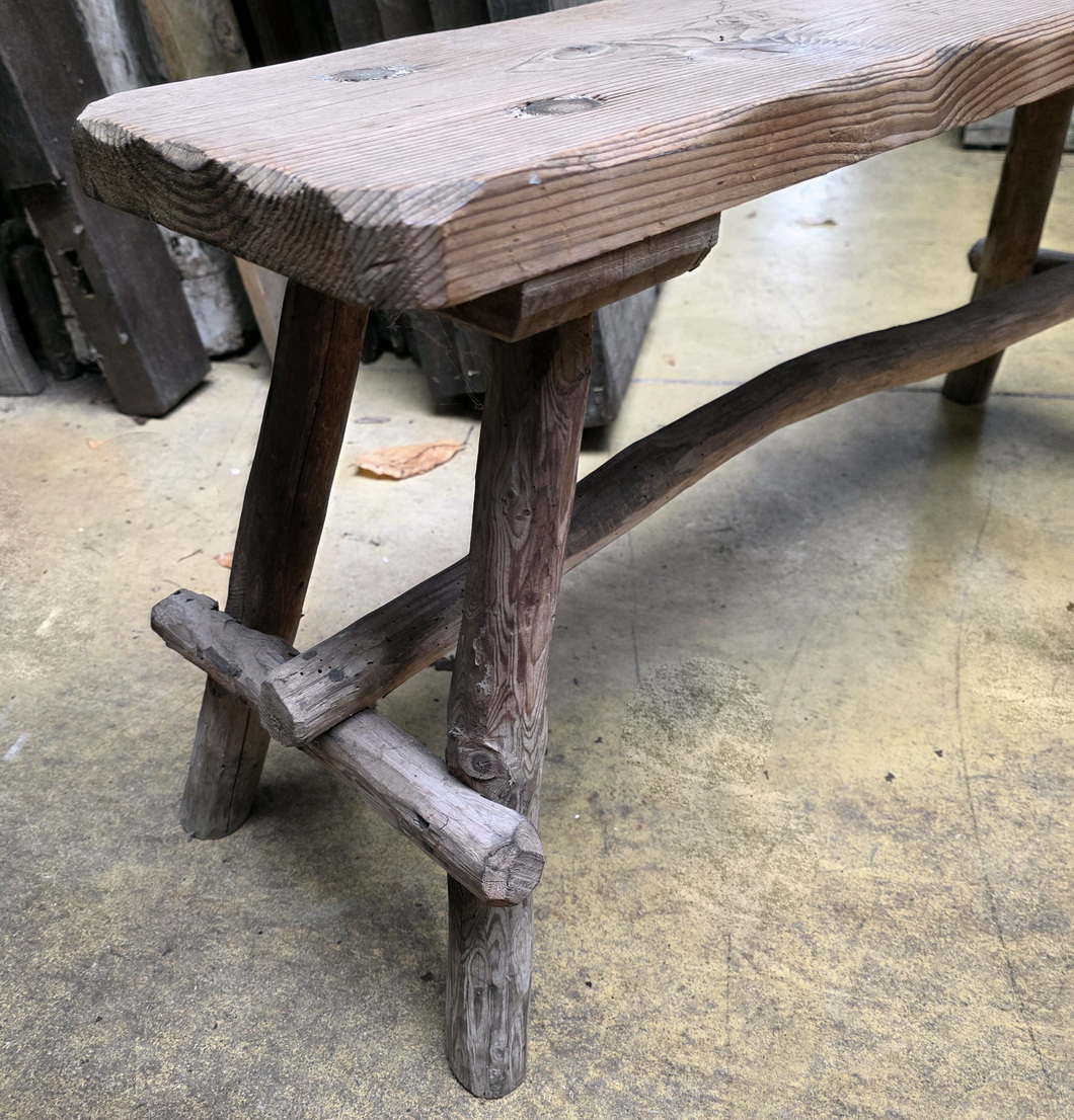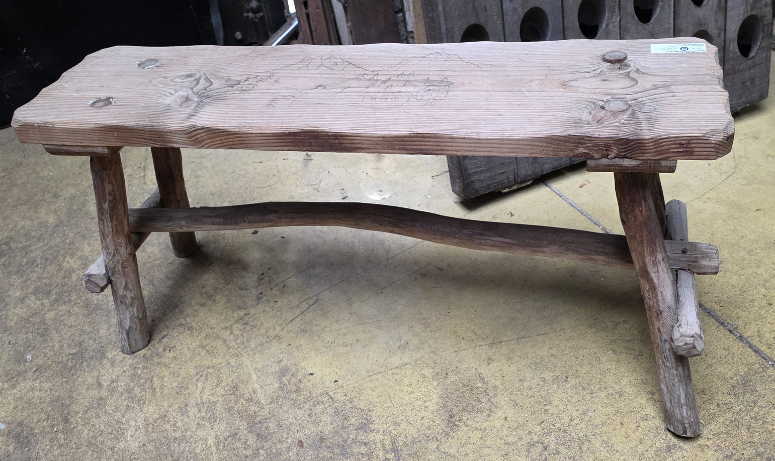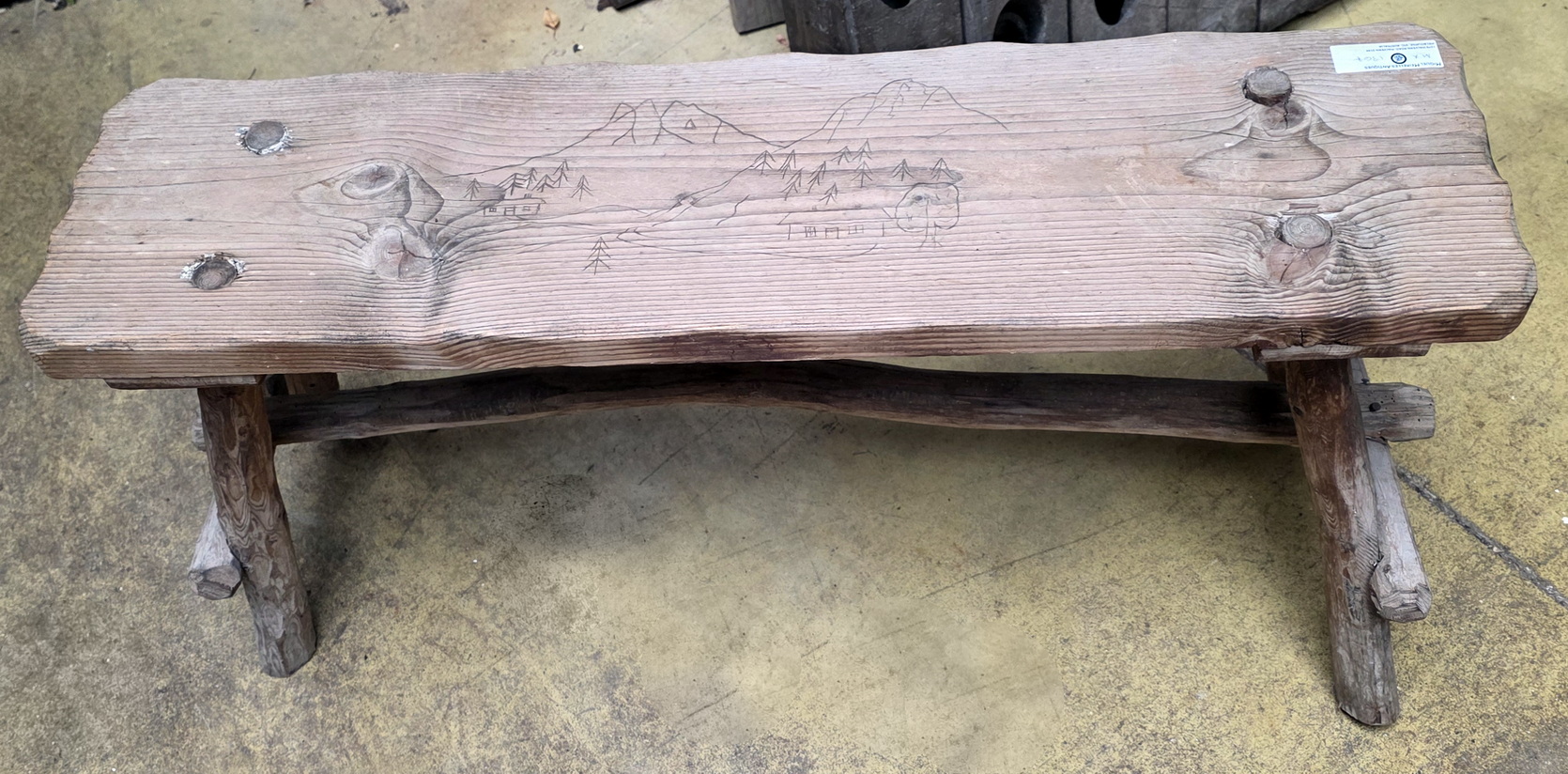 A characterful, early 20th century Alpine bench made from a plank of conifer wood, with four legs and an 'H' rail made from branches. Please note the landscape drawing pyrographed on the seat. Area of Switzerland, circa 1930.