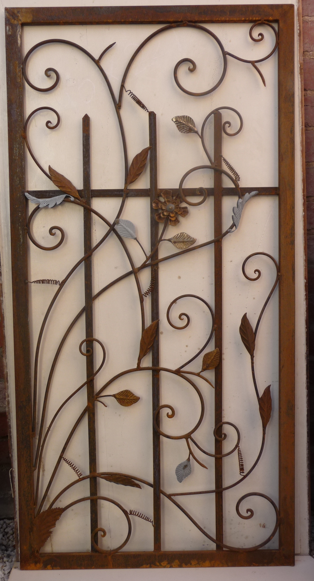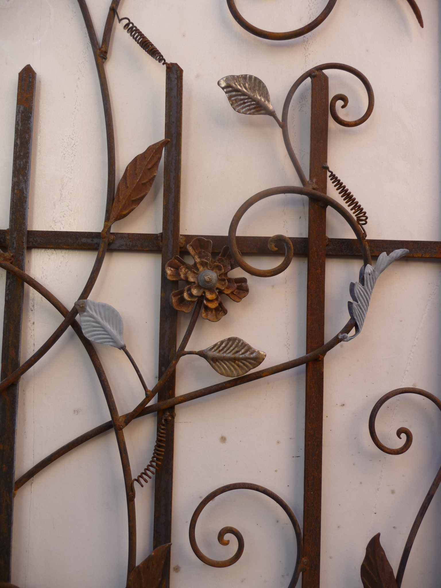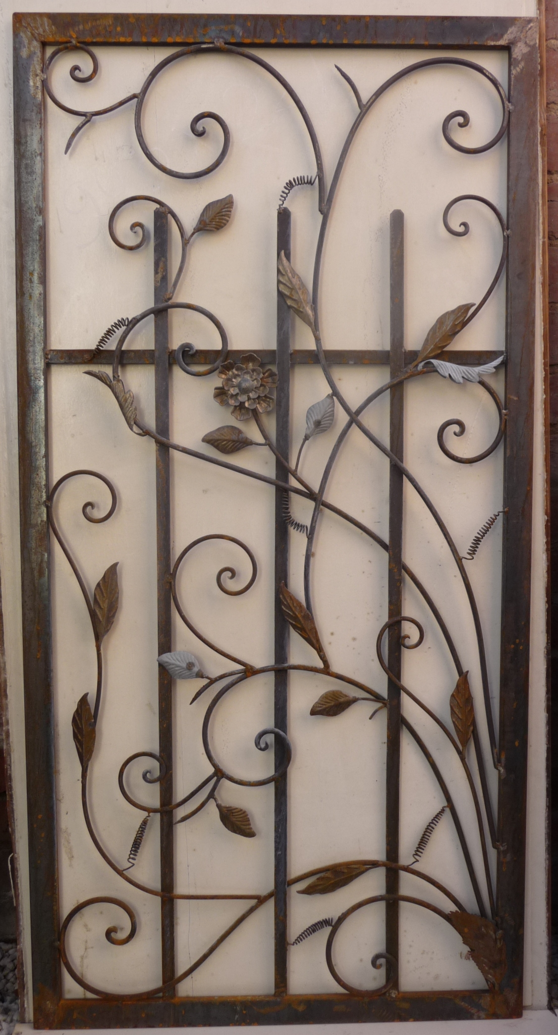 A pair of French wrought iron and tole work garden gates, each decorated with scroll work and foliate motifs set in a symmetrically-opposed pattern. 20th century.