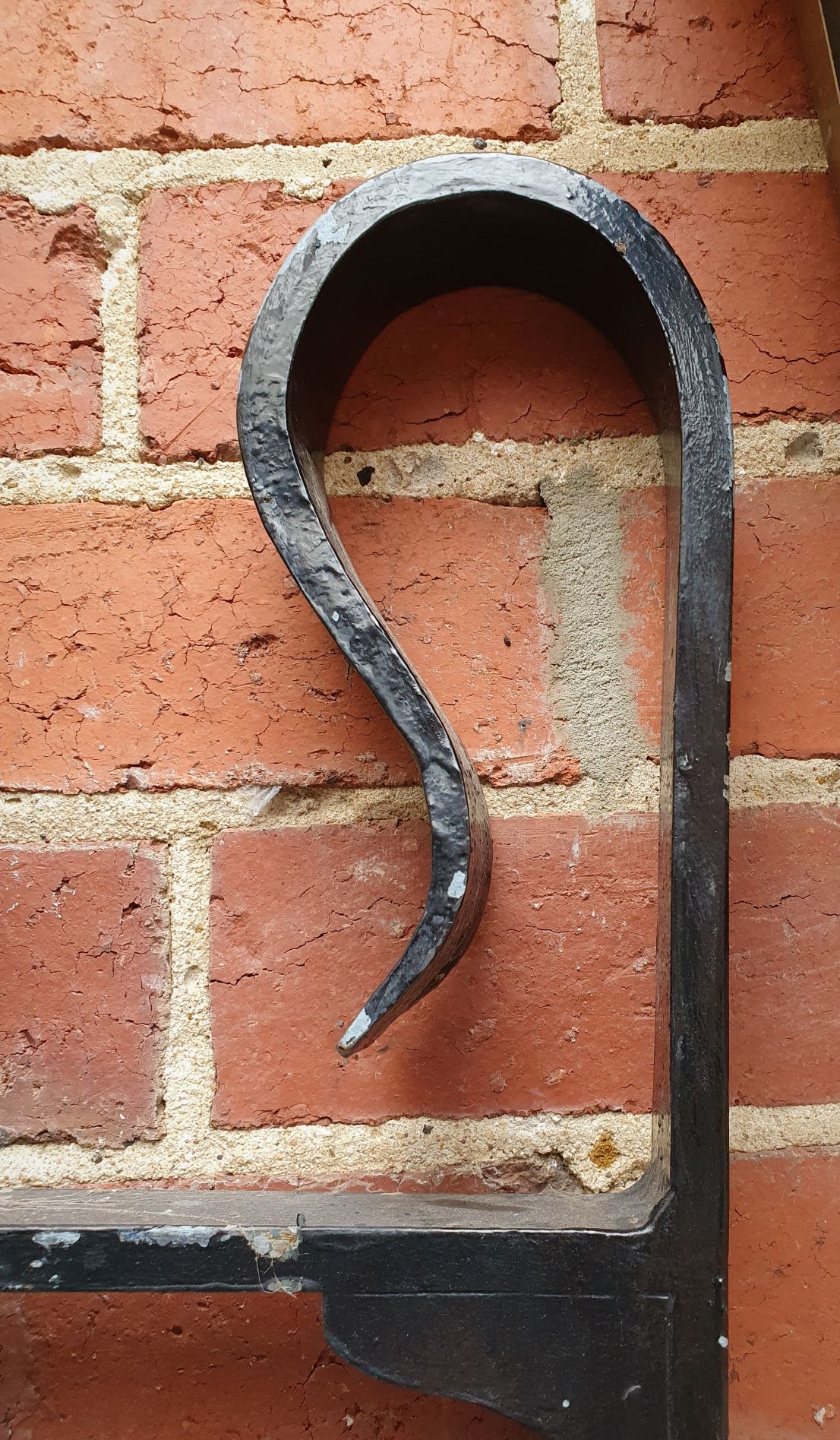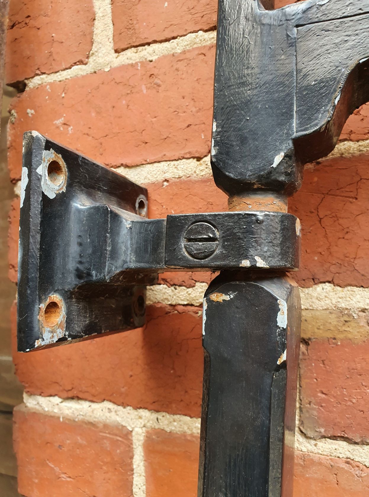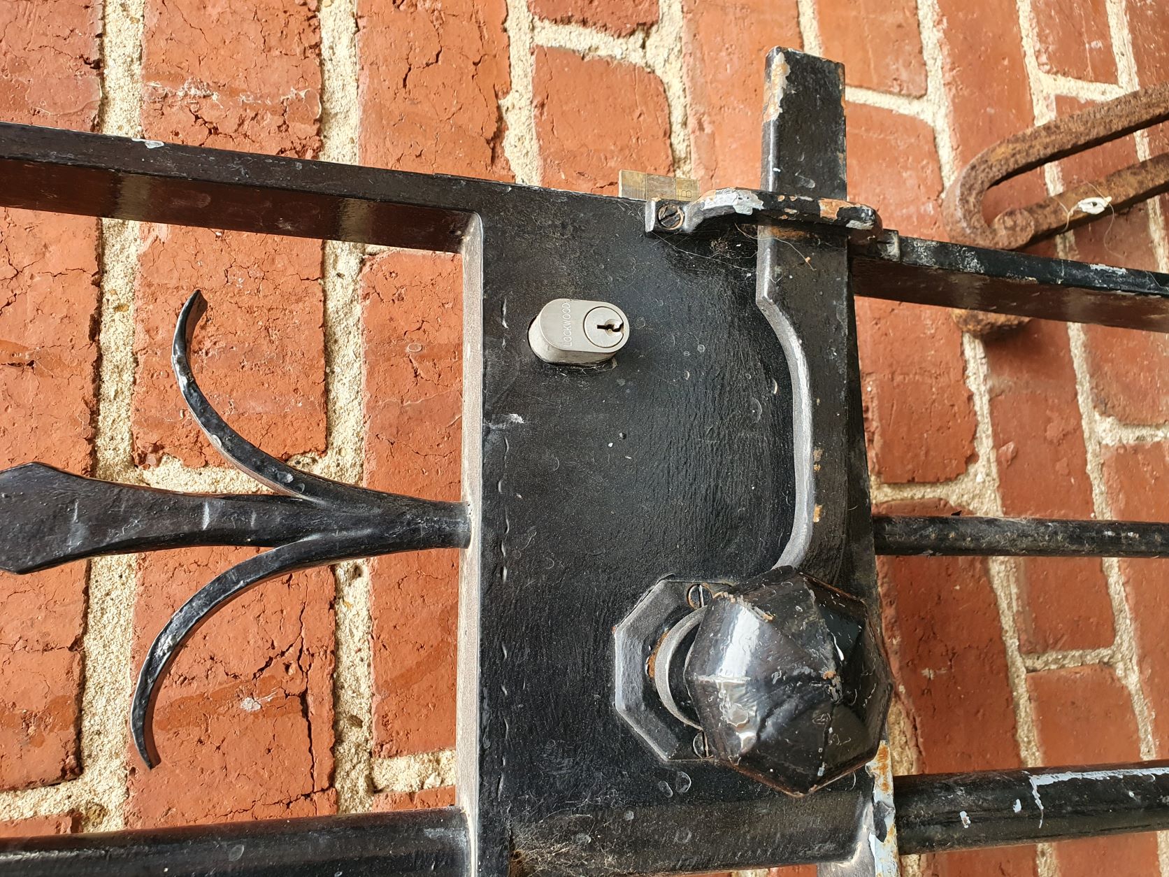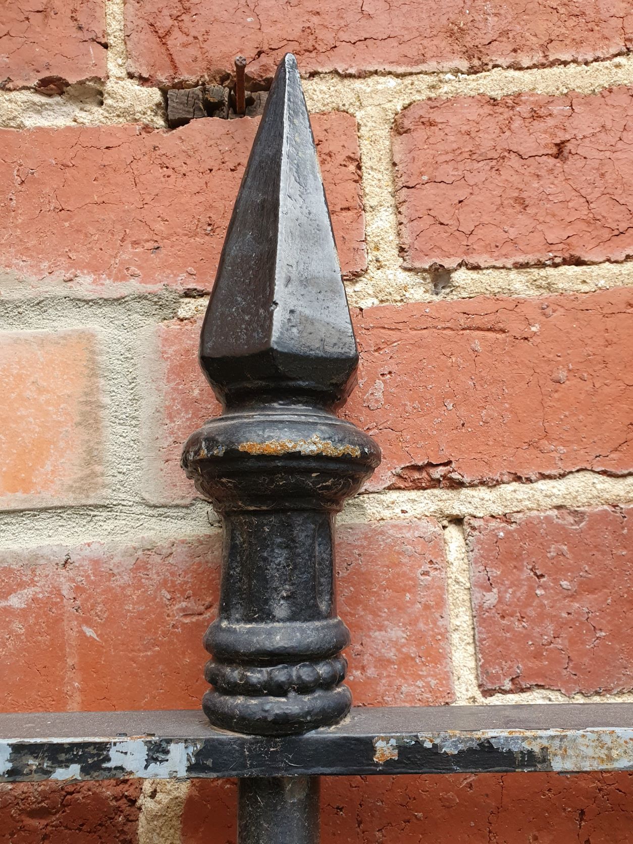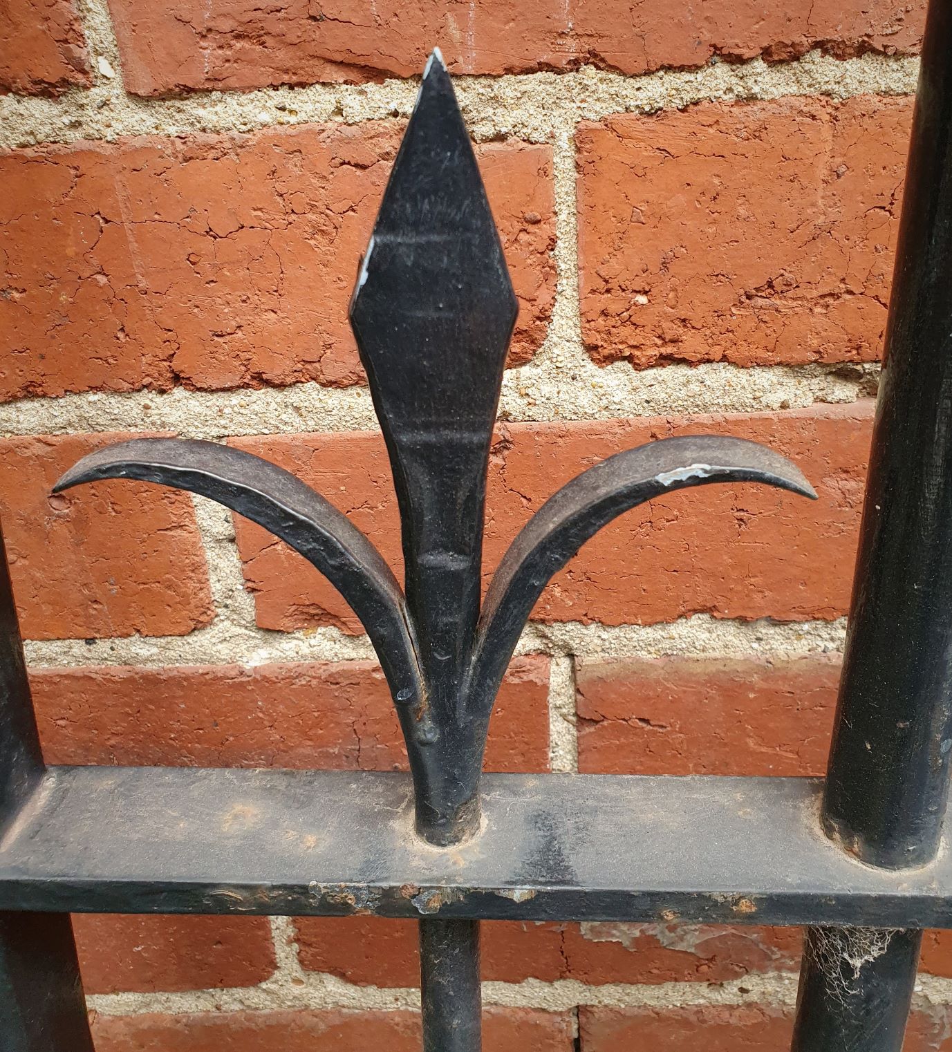 A vintage French garden gate, the uprights decorated with 'poignard' spear-head finials and decorated with 'fleur-de-lys' motifs, the top uprights with scrolled ends. Area of France, circa 1960.