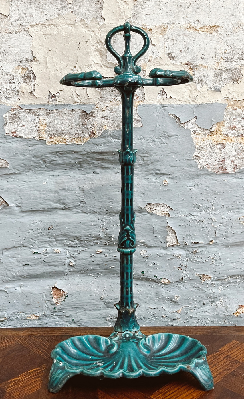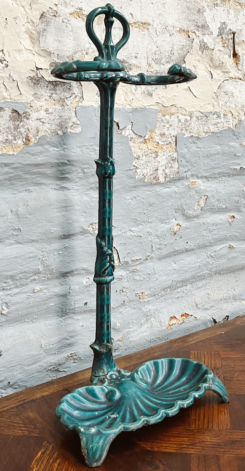 A 19th century French enamelled cast iron umbrella and walking stick stand, the shaped upright with two arms decorated with stylisd foliate motifs, standing on a seashell shaped drip tray. Area of Paris, circa 1880.