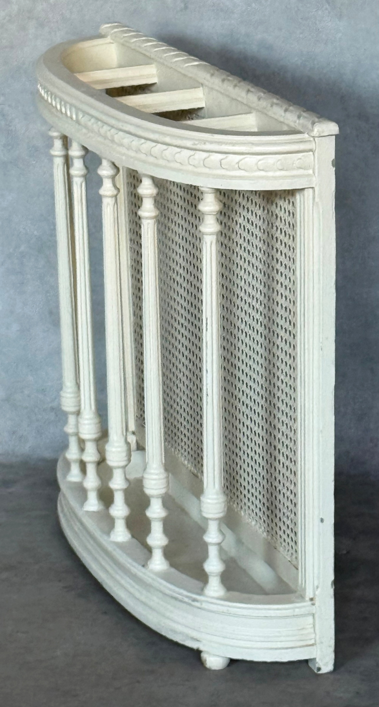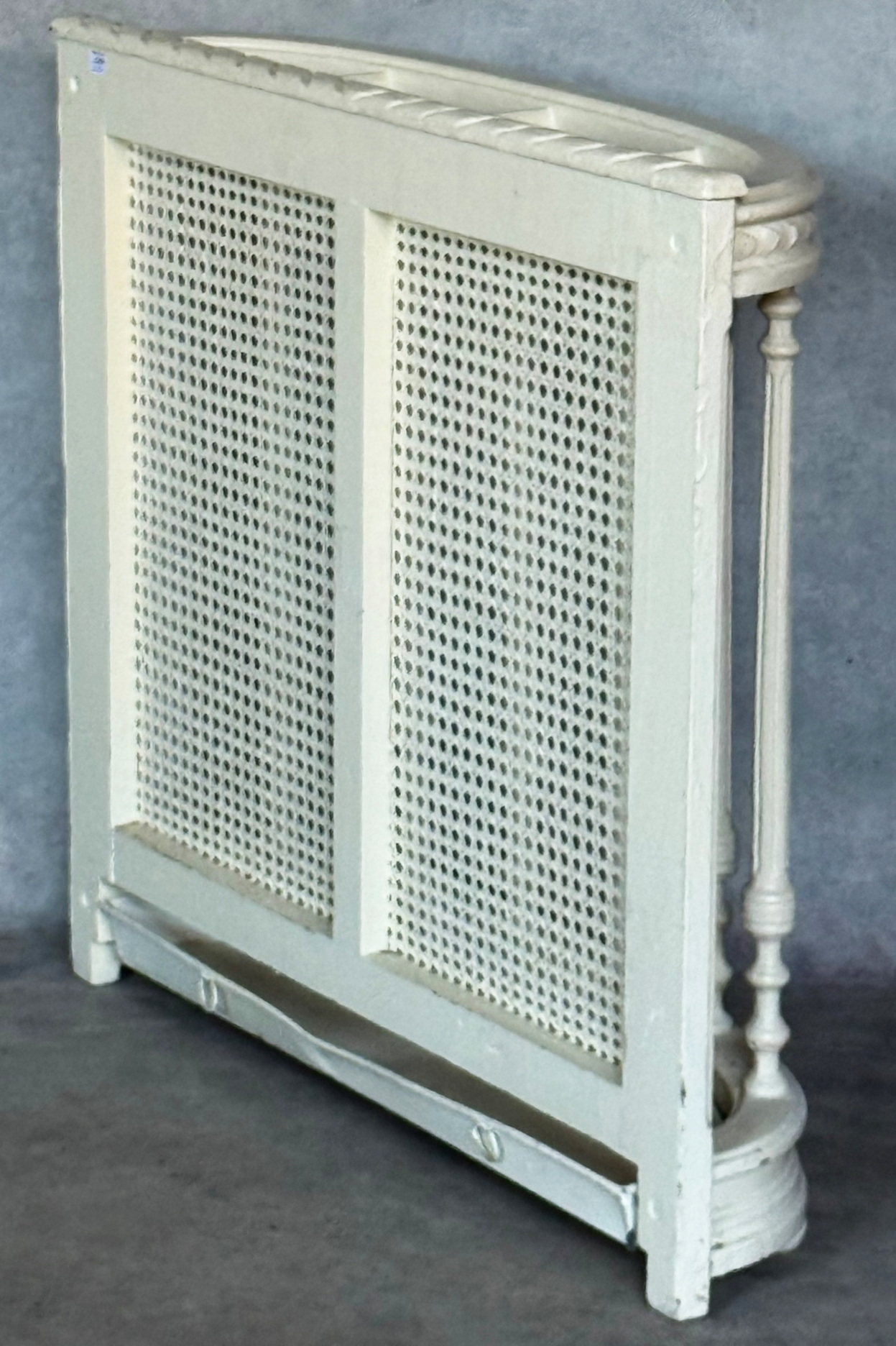 An elegant 19th century French Directoire style umbrella and walking cane stand, decorated with turned pilasters set against a background of a finely-woven rattan panel, the structure carved with neoclassical motifs. Fitted with the original painted metal waterproof insert. Area of Paris, circa 1880.