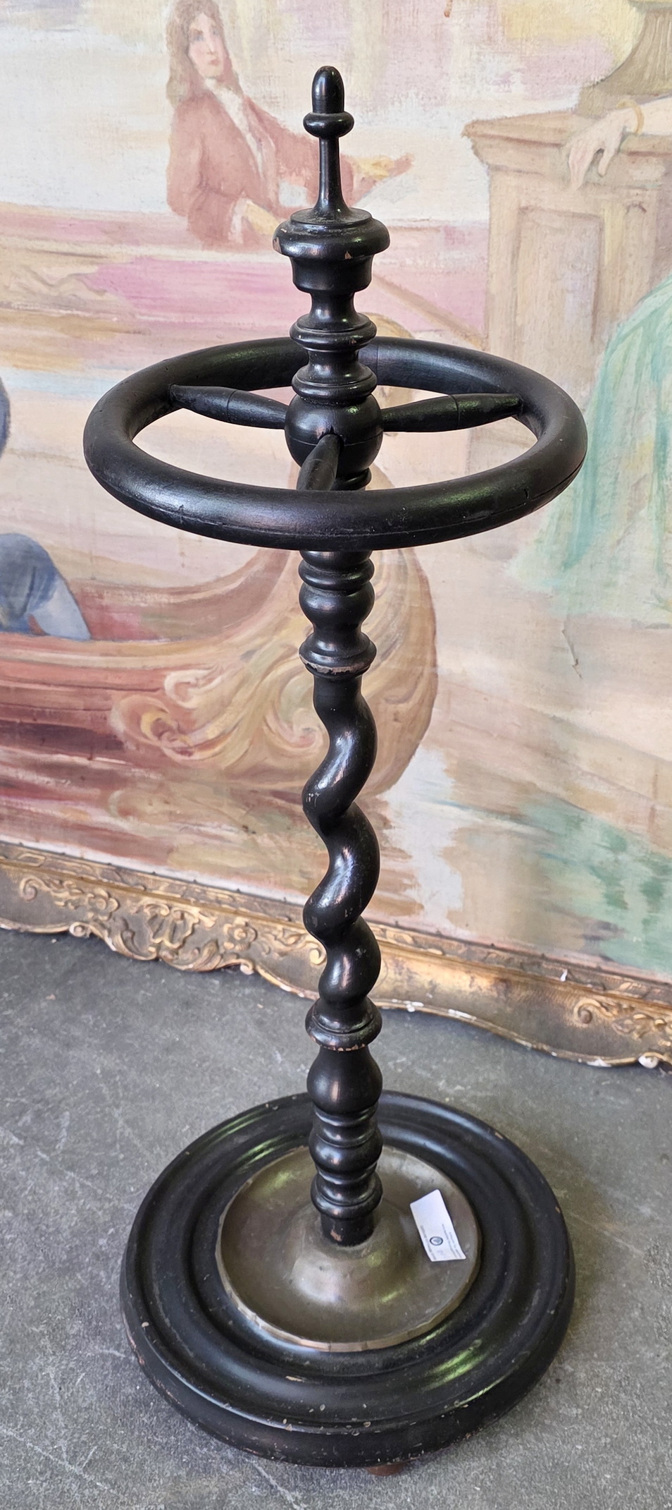 A 19th century Parisian umbrella and walking cane stand of excellent proportions, the bentwood round top with three diving- turned rails, standing on a barley-twist stem and circular plinth. The plinth retains the original brass drip-tray. Area of Paris, circa 1880.