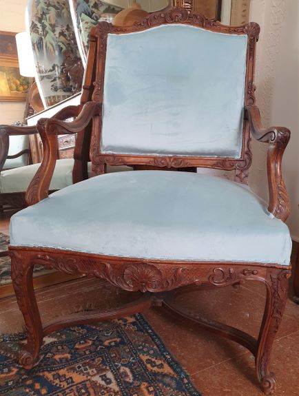 A pair of mid 19th century French Napoleon III period, Regence style, finely carved solid walnut 'Fauteuils Cabriolet' of very good quality and proportions. The shaped back-rests above sweeping arms, fitted onto comfortable, broad and deep seats. Not the quality of the haut-relief carved decorations on the back, armrests and of the aprons and legs. Area of Paris, circa 1870.
