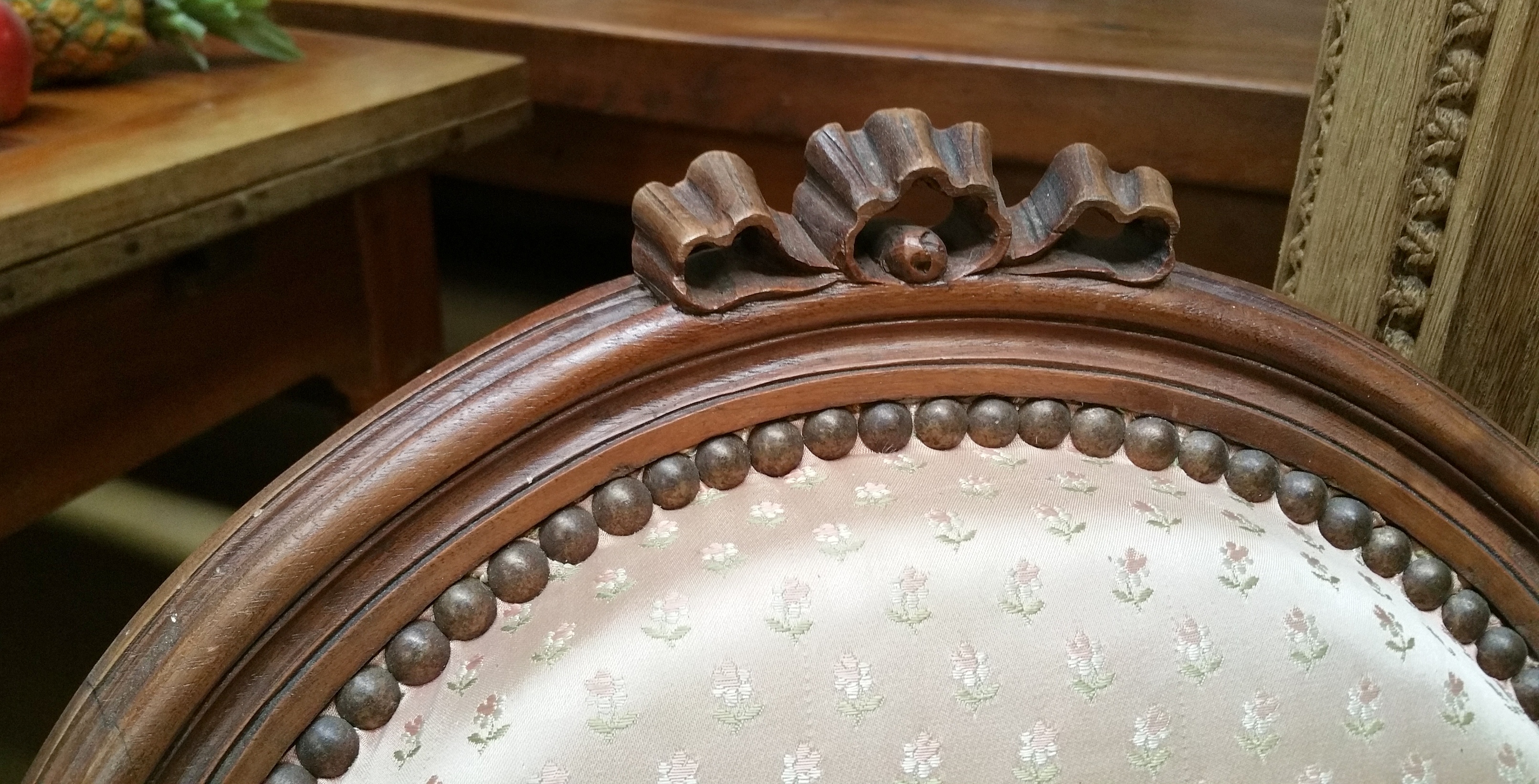A pair of 19th century French Louis XVI style carved walnut armchairs elegantly carved and fluted, the large medallion-backs, arm rests and seats upholstered. Please note that the elegance of the large, oval backs-rests with a finely-carved and fretted knotted bow. Area of Paris, circa 1880. Price is for the pair.