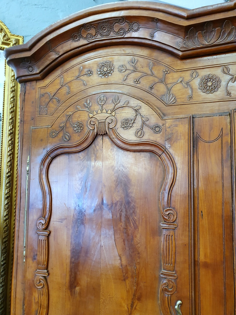 An important, mid 18th century French Louis XV period solid wild cherrywood 'Armoire de Mariage', the double 'Chapeau de Gendarme' pediment above shaped, panelled and book-matched doors decorated with delicate haut-relief carved floral and foliate motifs. Note the quality of the original, soft and luminous patination. Retaining its original (working) lock and key. Area of Rennes, circa 1760.