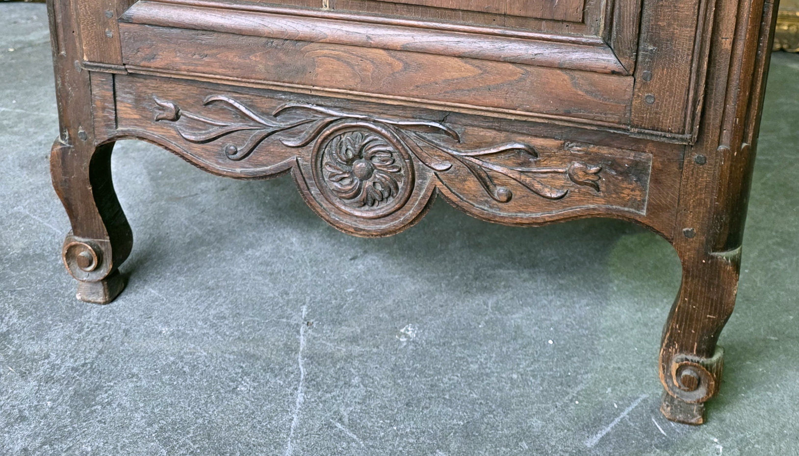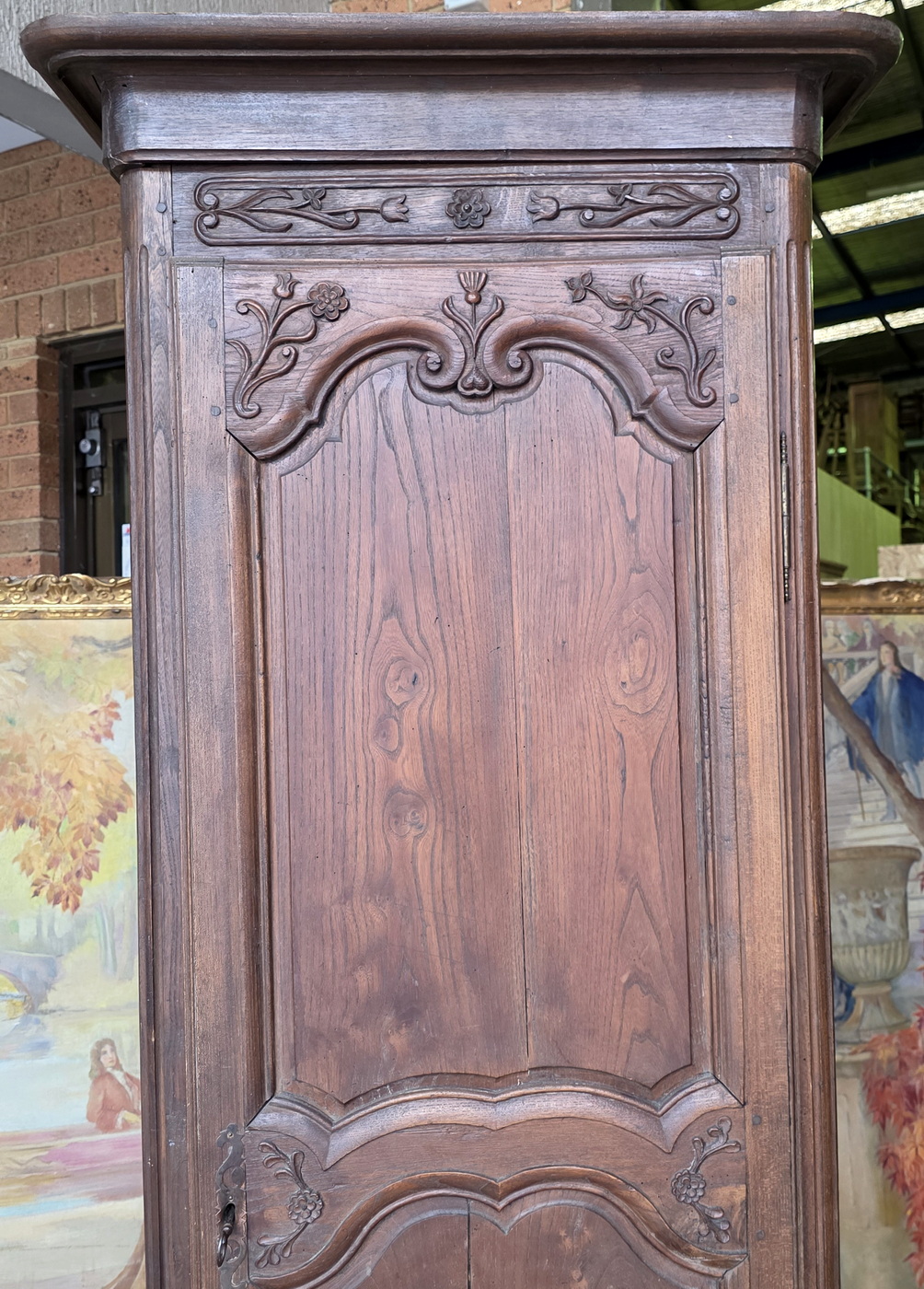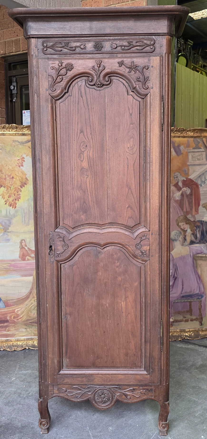 A 19th century French provincial, tall and narrow, Louis XV style, haut-relief carved solid oak 'Bonnetiere de Mariage' cupboard, the pediment and the panelled door decorated with haut-relief carved flowers and with foliate motifs. Internally fitted with shelves. Area of Normandy, circa 1880.