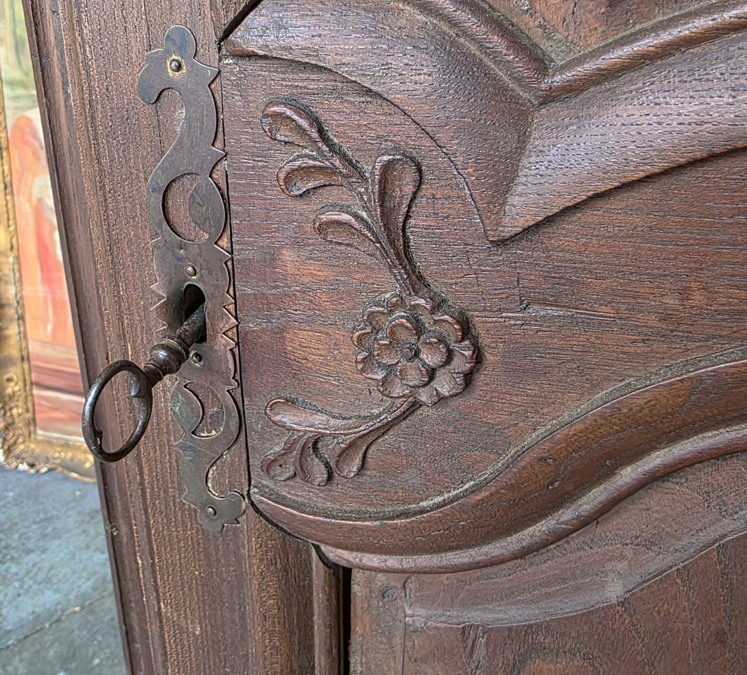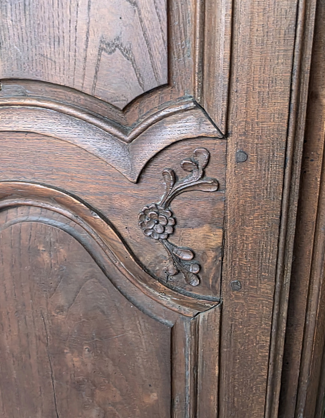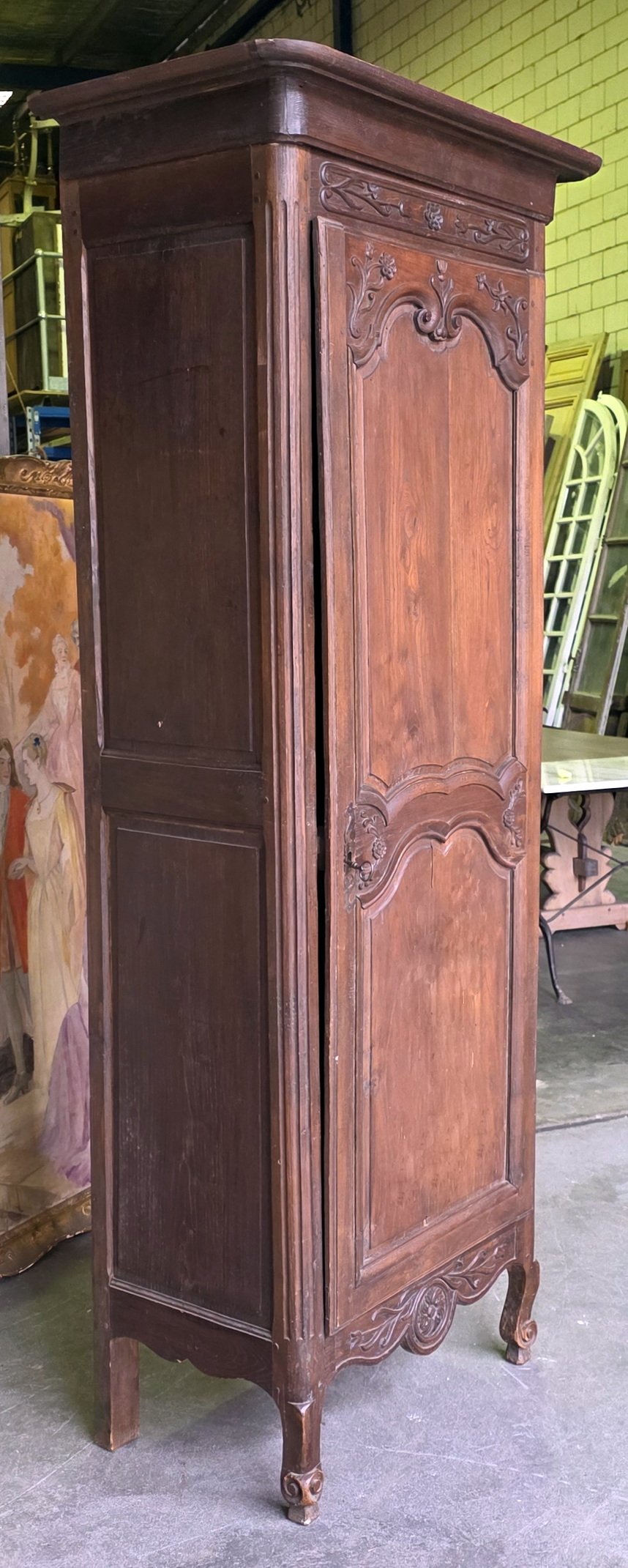 A 19th century French provincial, tall and narrow, Louis XV style, haut-relief carved solid oak 'Bonnetiere de Mariage' cupboard, the pediment and the panelled door decorated with haut-relief carved flowers and with foliate motifs. Internally fitted with shelves. Area of Normandy, circa 1880.