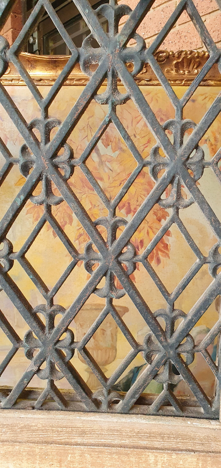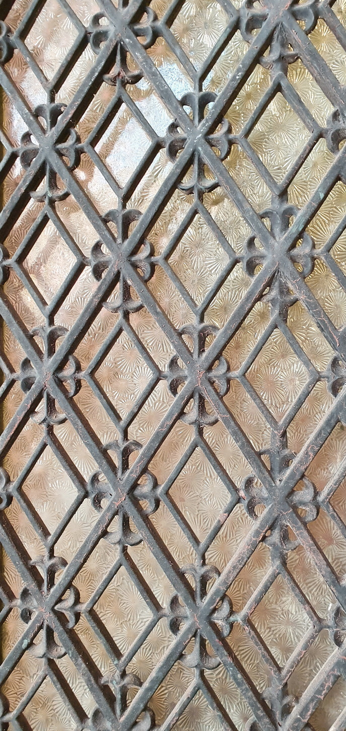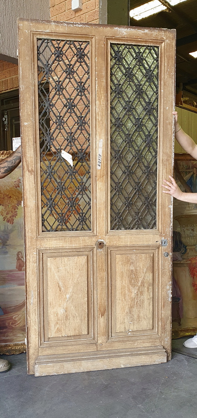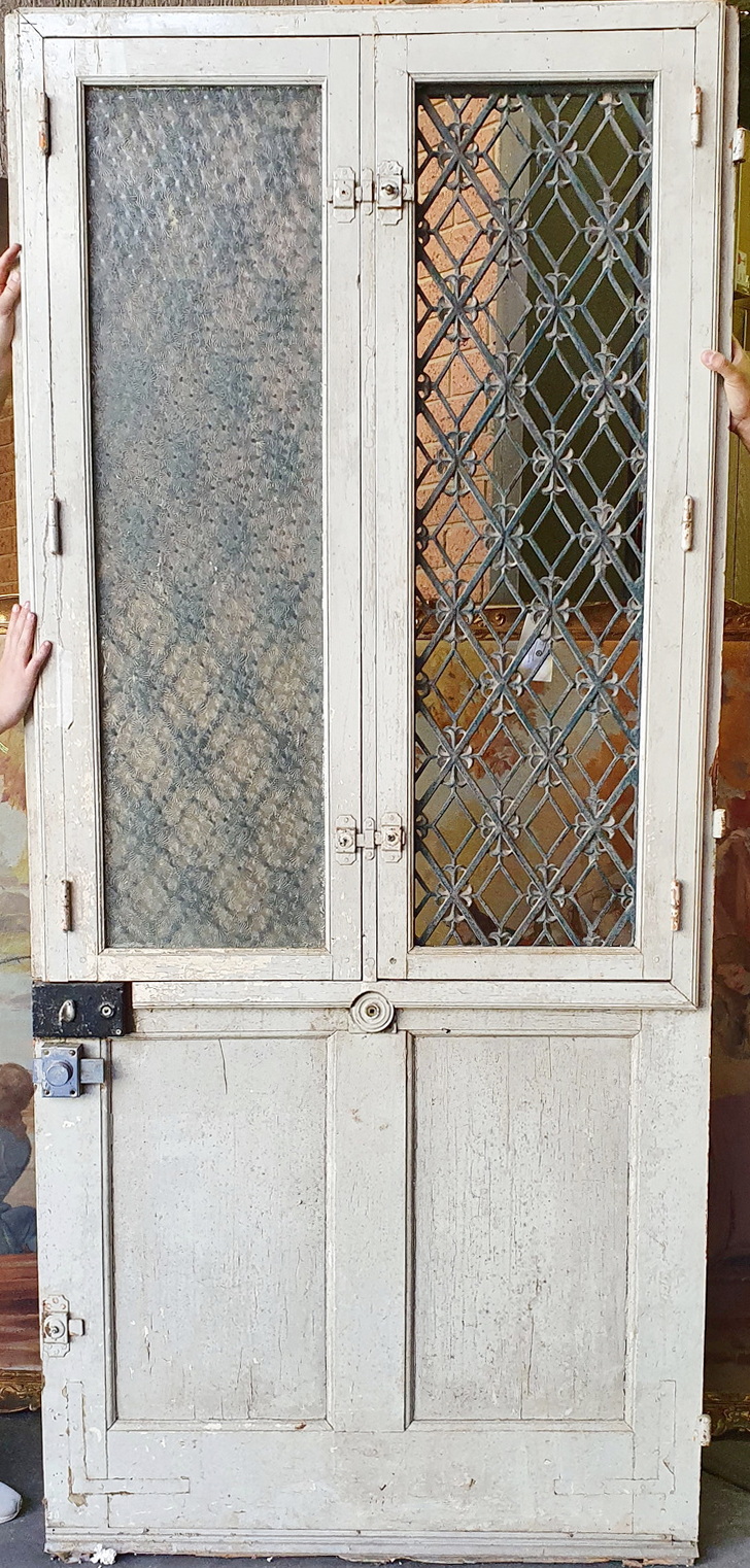 A wide and tall, 19th century French Napoleon III period painted oak entrance door of Neo Classical design and proportions, the lower section decorated with raised 'diamond' panelling, the upper section with windows opening behind each of the decorative geometric-patterned scroll-work cast iron grilles. Area of Paris, circa 1870.