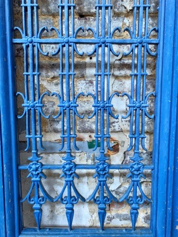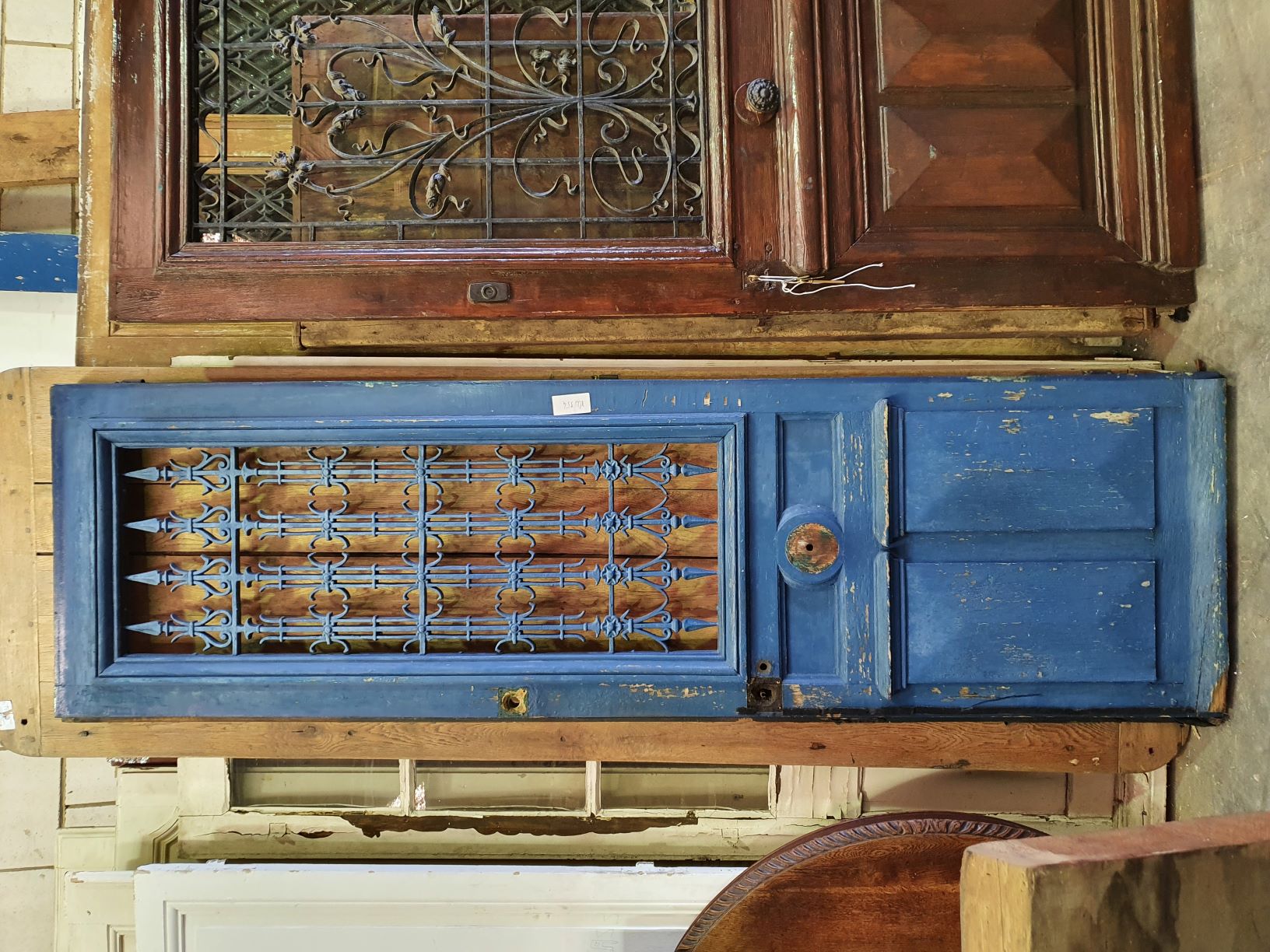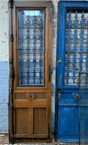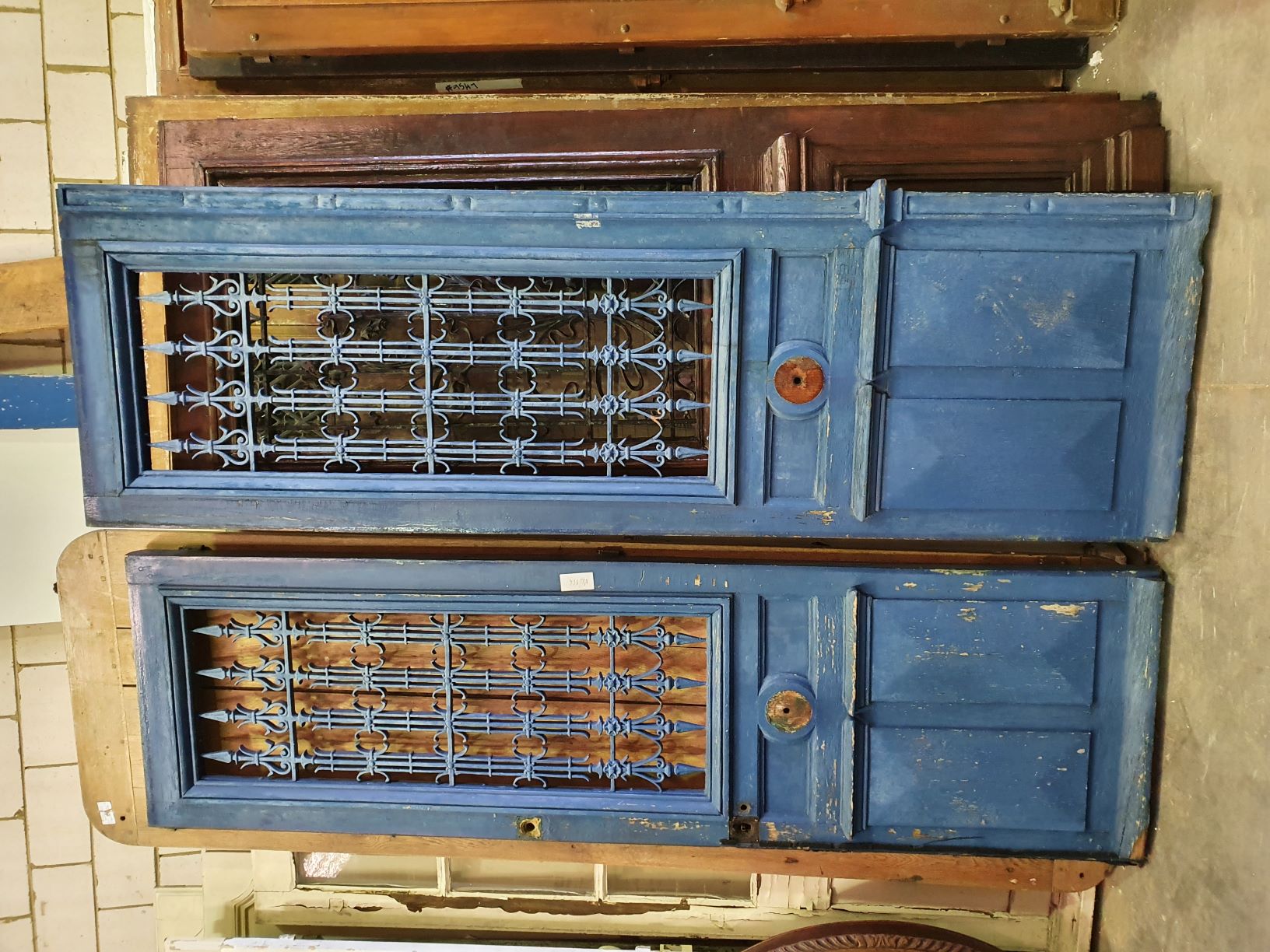 A pair of 19th century French painted oak and cast iron entrance doors of excellent size and of Classical proportions. Each door with a glazed window opening behind a geometric-design cast iron grille, above panelled and moulded bottom-sections. Retaining the original cremorne bolts and steel-framed windows. Area of Paris, circa 1880.