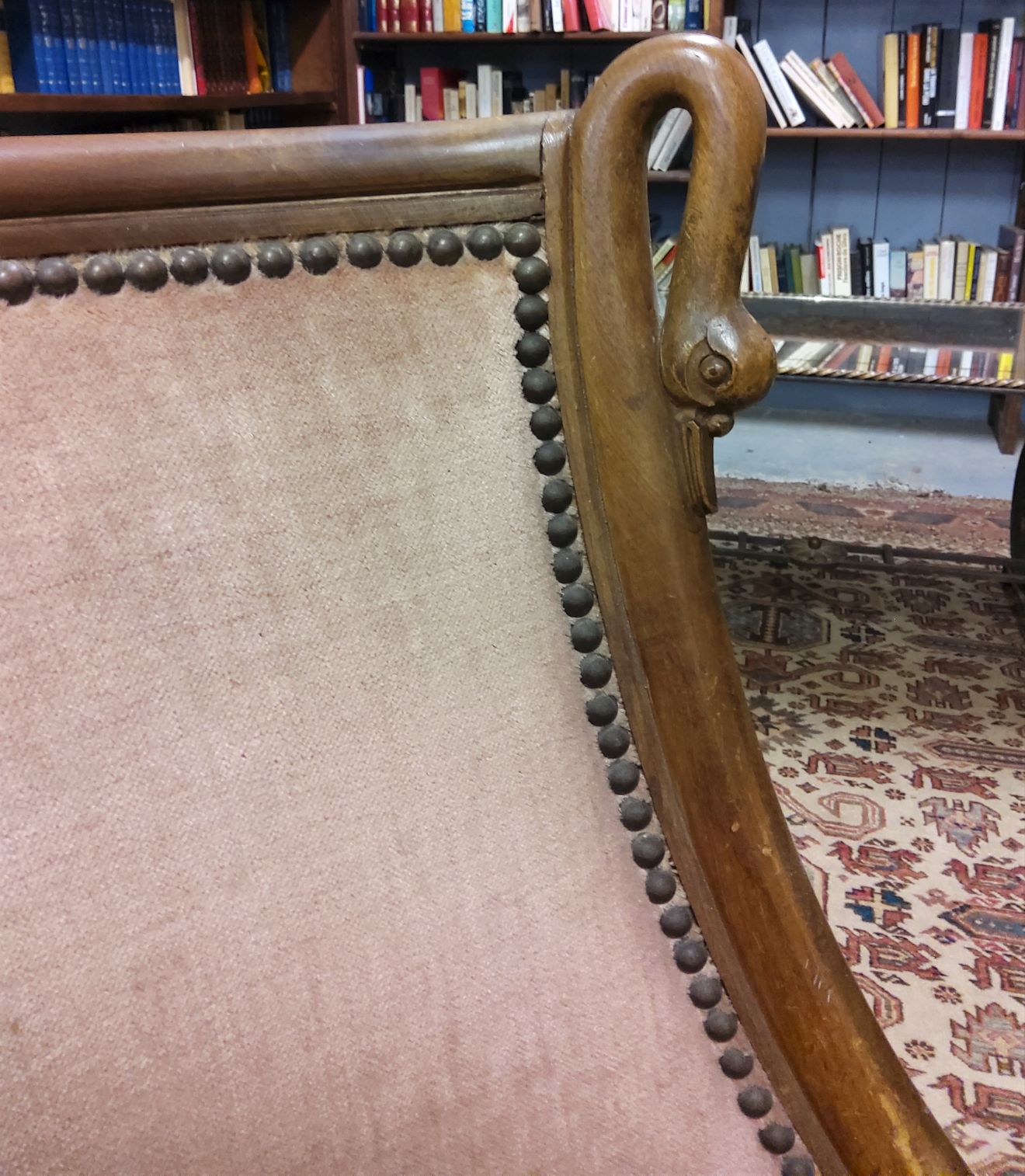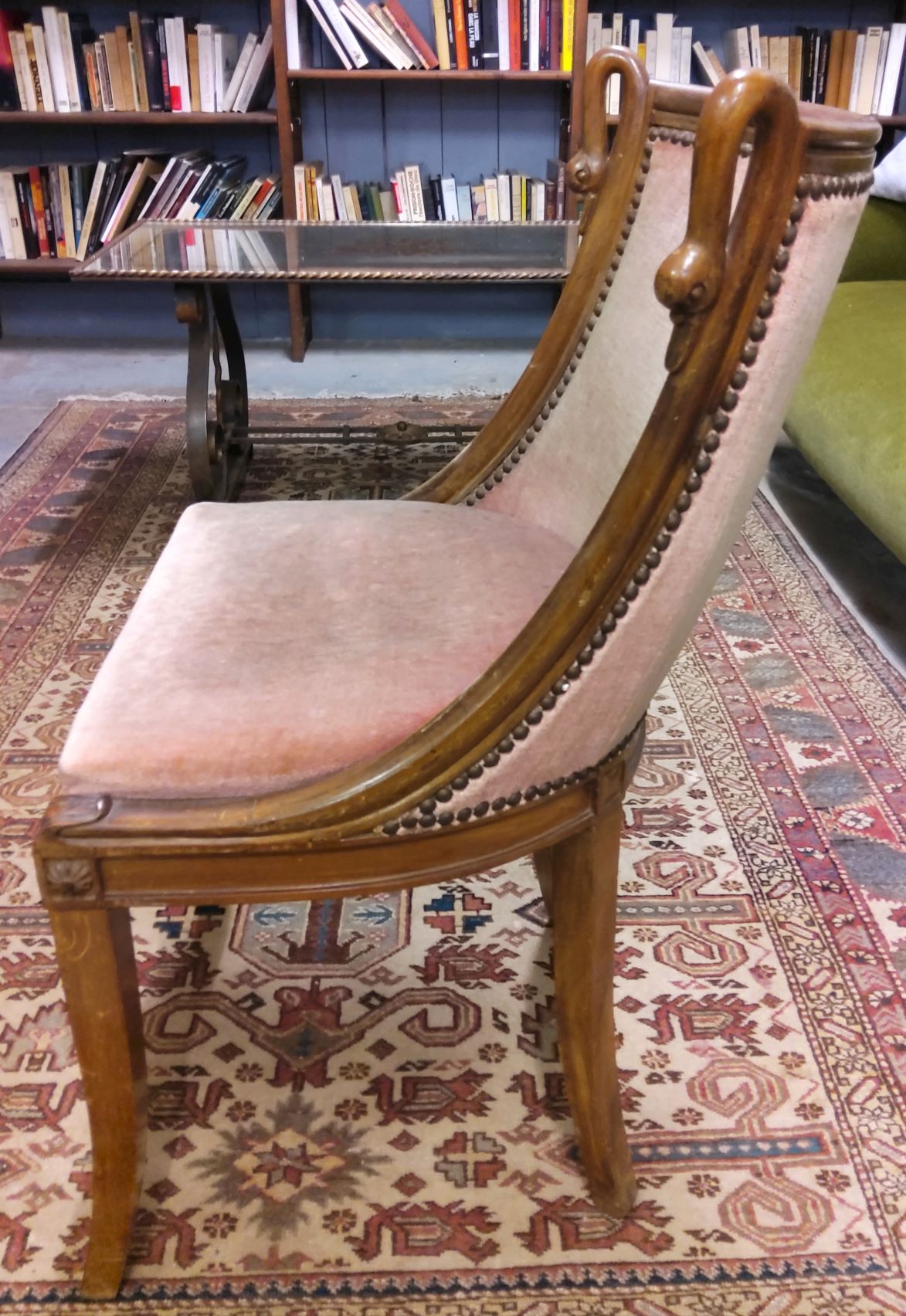 A French Empire style, finely carved mahogany desk chair, the elegant "en Gondole" shaped backrest decorated with two carved swan neck finials, a symbol of Josephine Bonaparte. The comfortable seat standing on tapering 'Klismos' legs.  Note the elegant, almost Modernist, Classic design of this chair. Area of Paris, circa 1930.