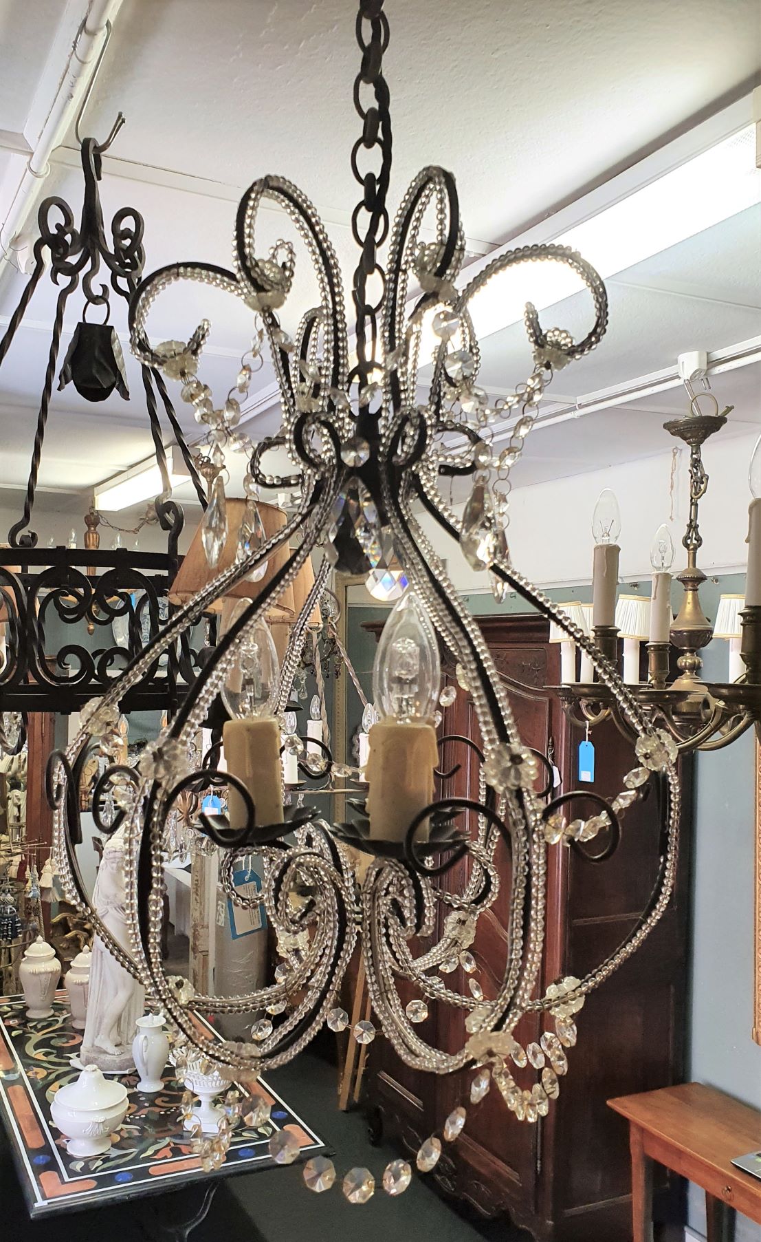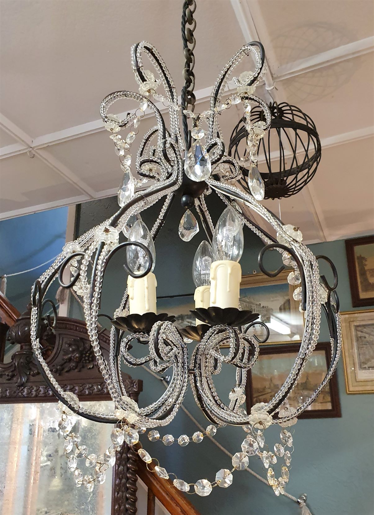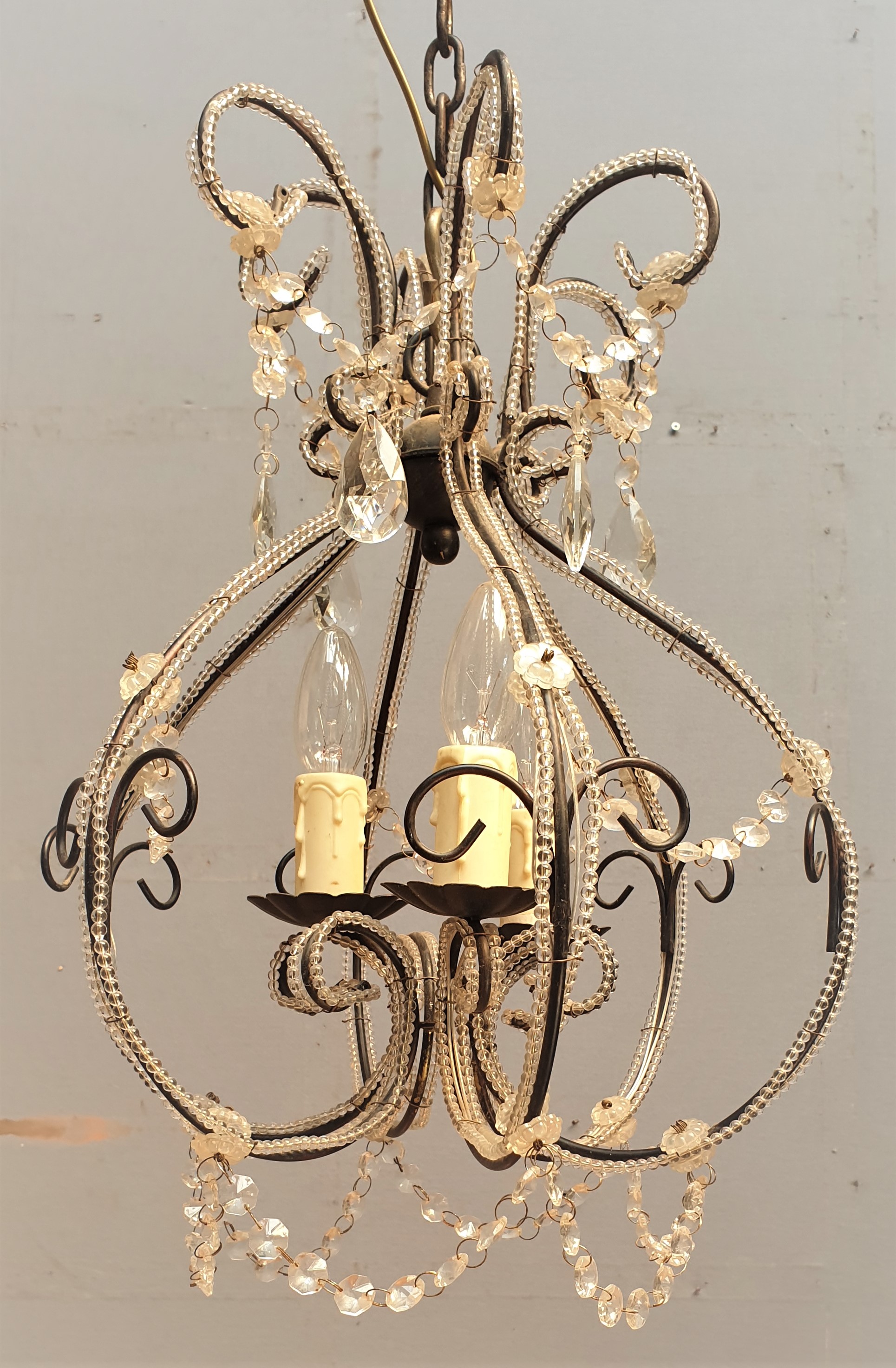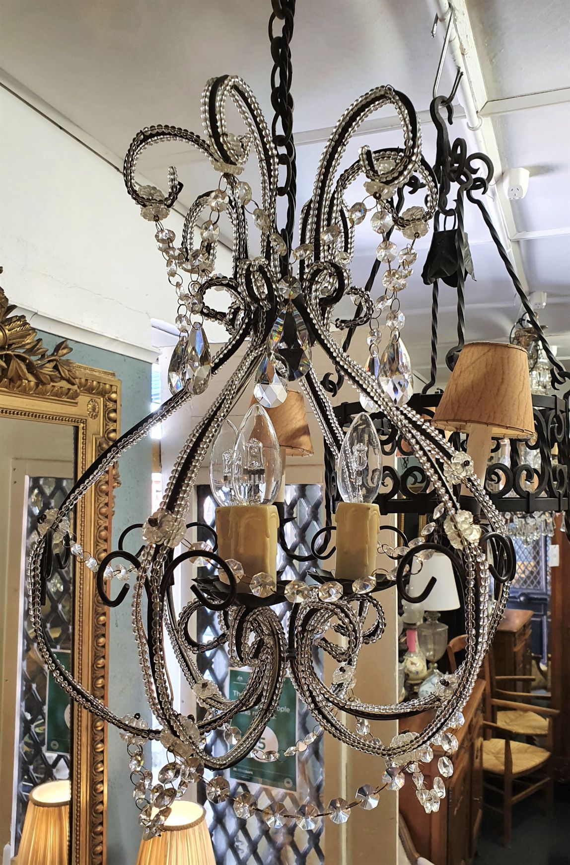 A vintage Italian wrought iron and crystal bead chandelier of three internal lights, the base decorated with chains of crystal rosettes, the pediment with hanging cut crystal drops. Area of Milan, circa 1950.