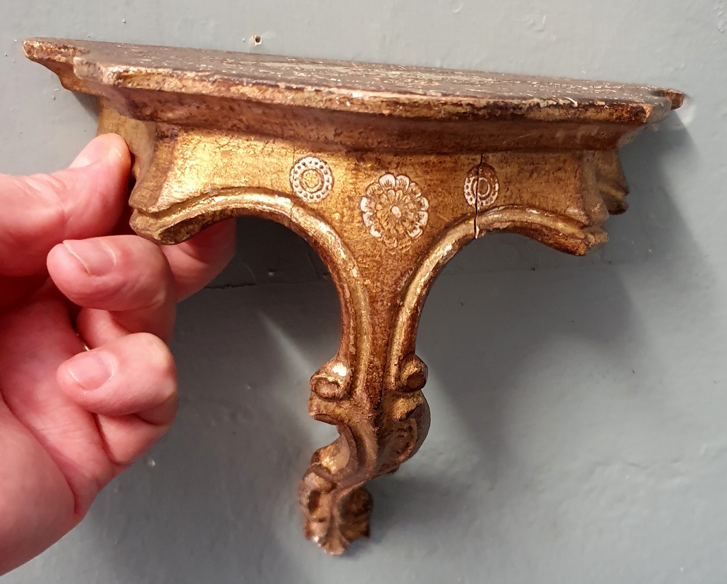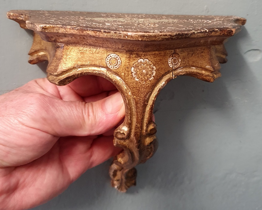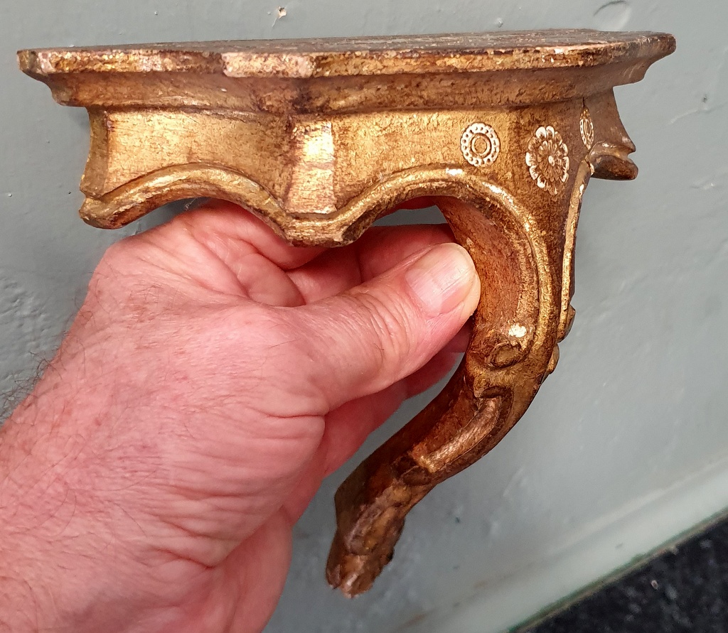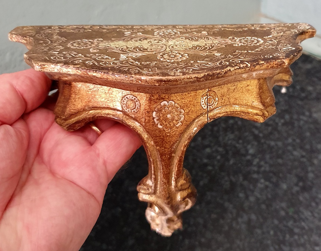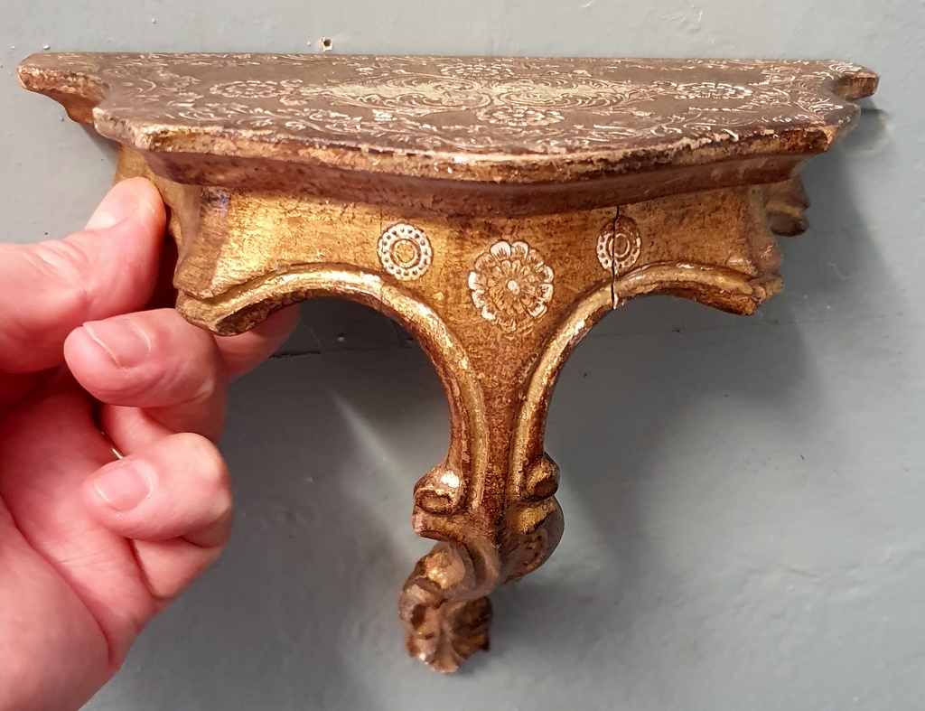 A vintage Italian carved, etched painted and gilded wall-mounted bracket. This type of bracket was designed to hold up a vase on its top. Area of Florence, circa 1950.