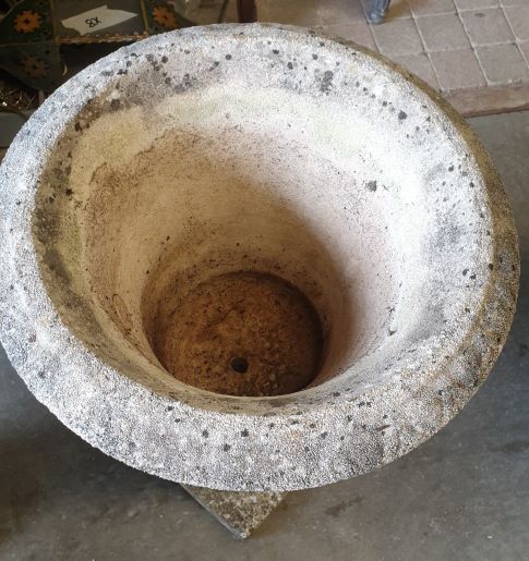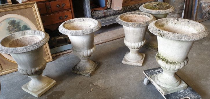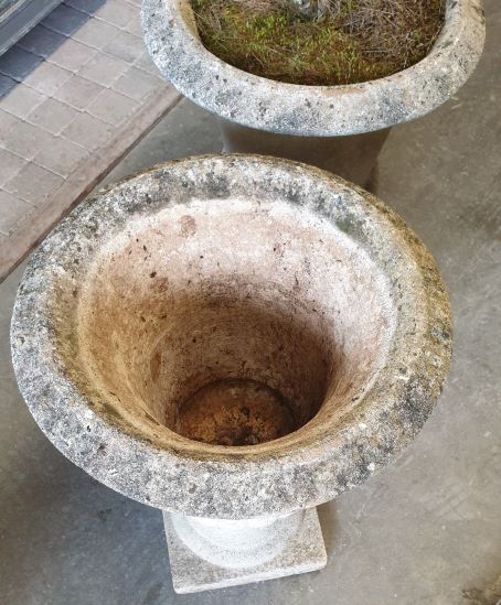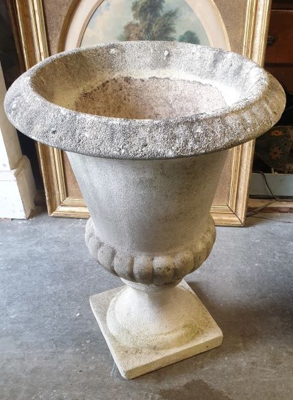 A Pair of reconstituted stone French Louis XVI style 'Medici' urns decorated with Classical gadrooned mouldings and flared top edges, standing on square plinths. The surfaces of the urns beautifully weathered and with a patina of lichens. Area of Anduze, Southern France, early 20th century.