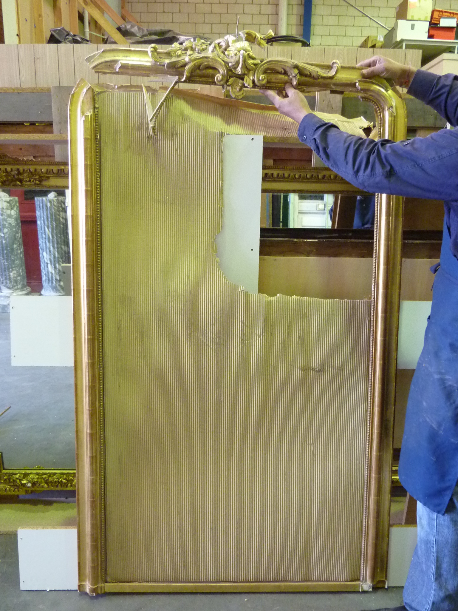 This is what happened to a client's mantle mirror which had been badly attached to the wall. A painstaking restoration and replacement mirror 'brought it back to life'.