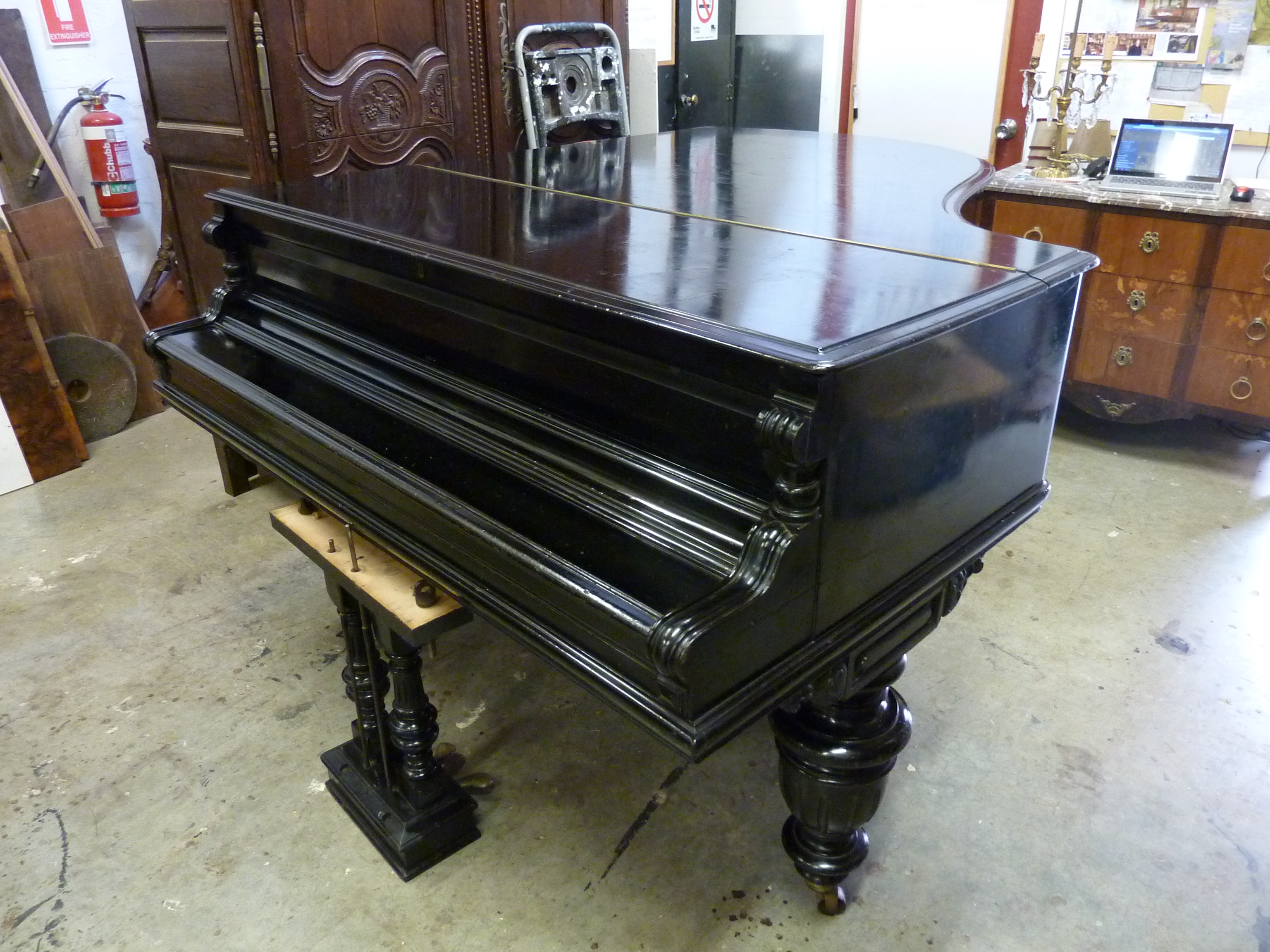 This grand piano was brought to us by the owner who had brought it into Australia from Russia. The interior was in good condition, including all its ivory and ebony keys. The aim here was to give it back its glowing, ebonised finish and to make it look well maintained, not freshly restored. The element with the pedals was left disconnected from the piano, for ease of transport.