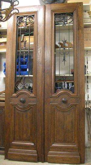 A pair of French oak entrance doors brought back to the natural oak colour and varnished, the windows fitted with safety glass.