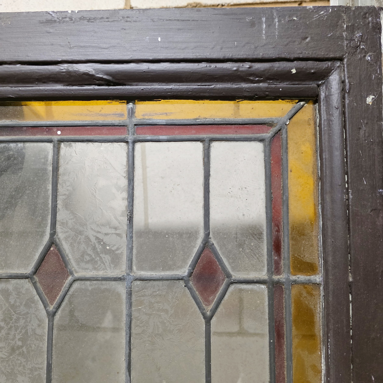 A pair of 19th century French leadlight windows decorated with geometric inlaid clear, frosted glass interspersed with red diamond-shaped pieces. Each of the doors with a red and a yellow coloured glass contour. Retaining the original hinges and locking bolts at the rear. Area of Normandy, circa 1880.