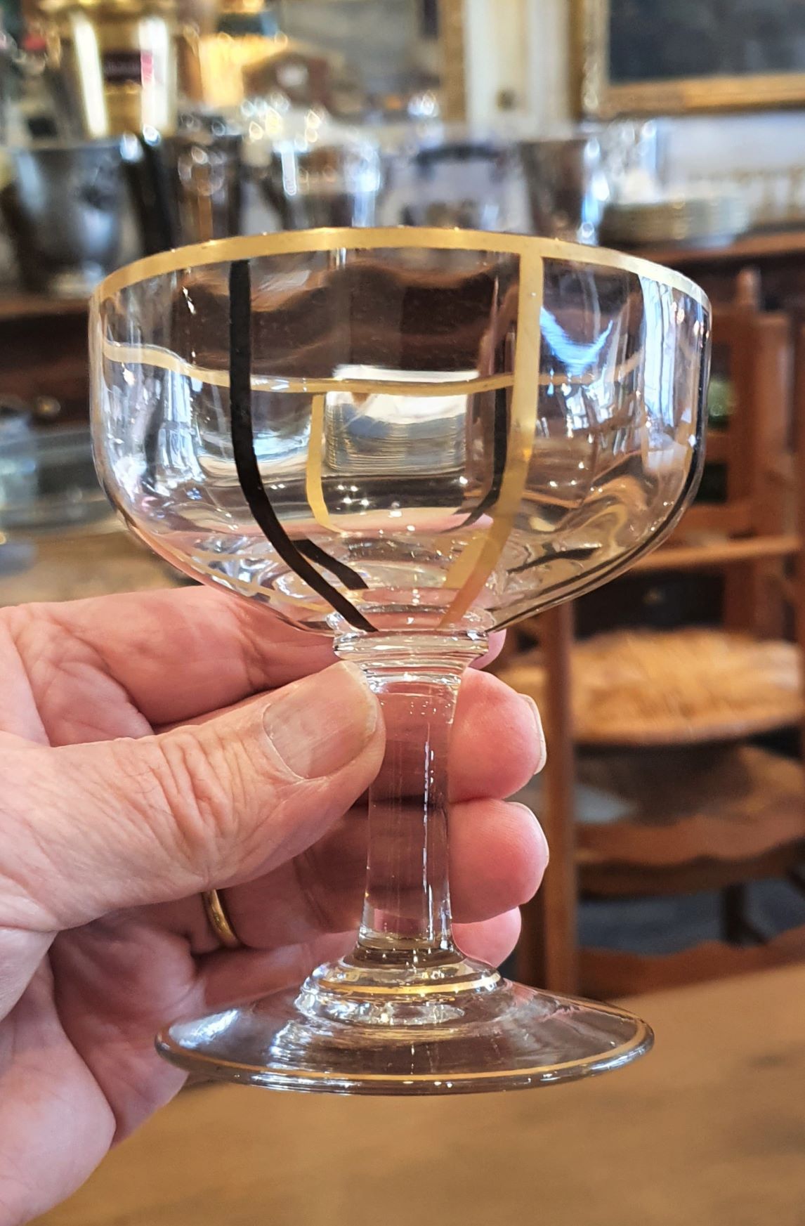 A set of six French Art Deco period Champagne coupes, the bowls with hand-painted gilt and coloured lines and with gilt edges, standing on slender stems. The underside of the plinths with the signature of "D. Delvaux, 18 rue Royale a Paris". Please note, this set comes with a seventh, spare coupe. Area of Paris, circa 1930.