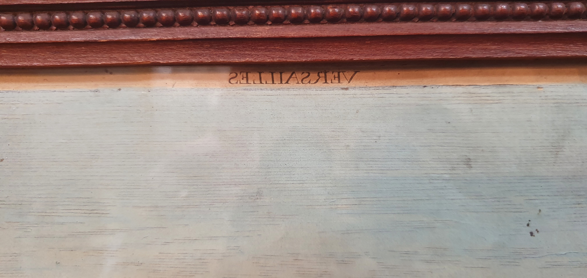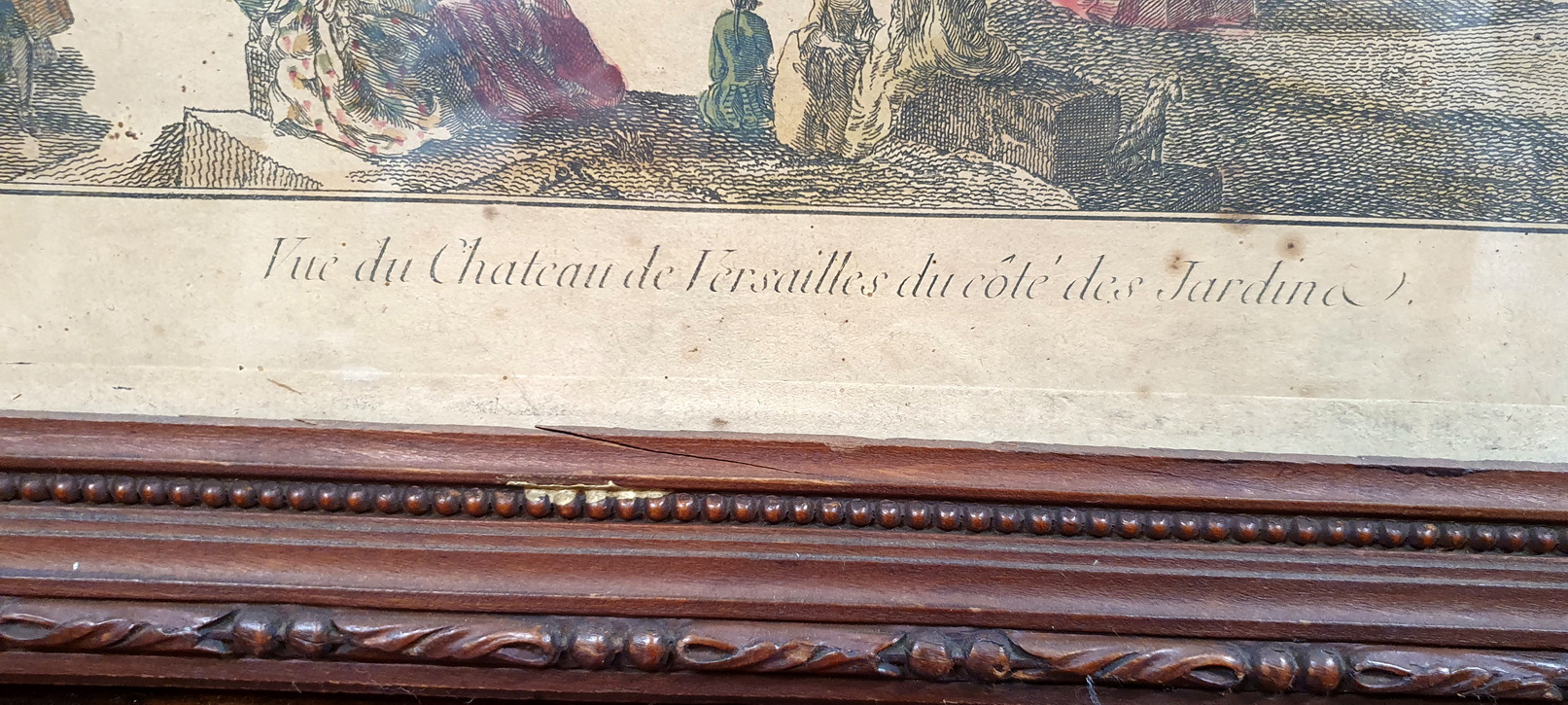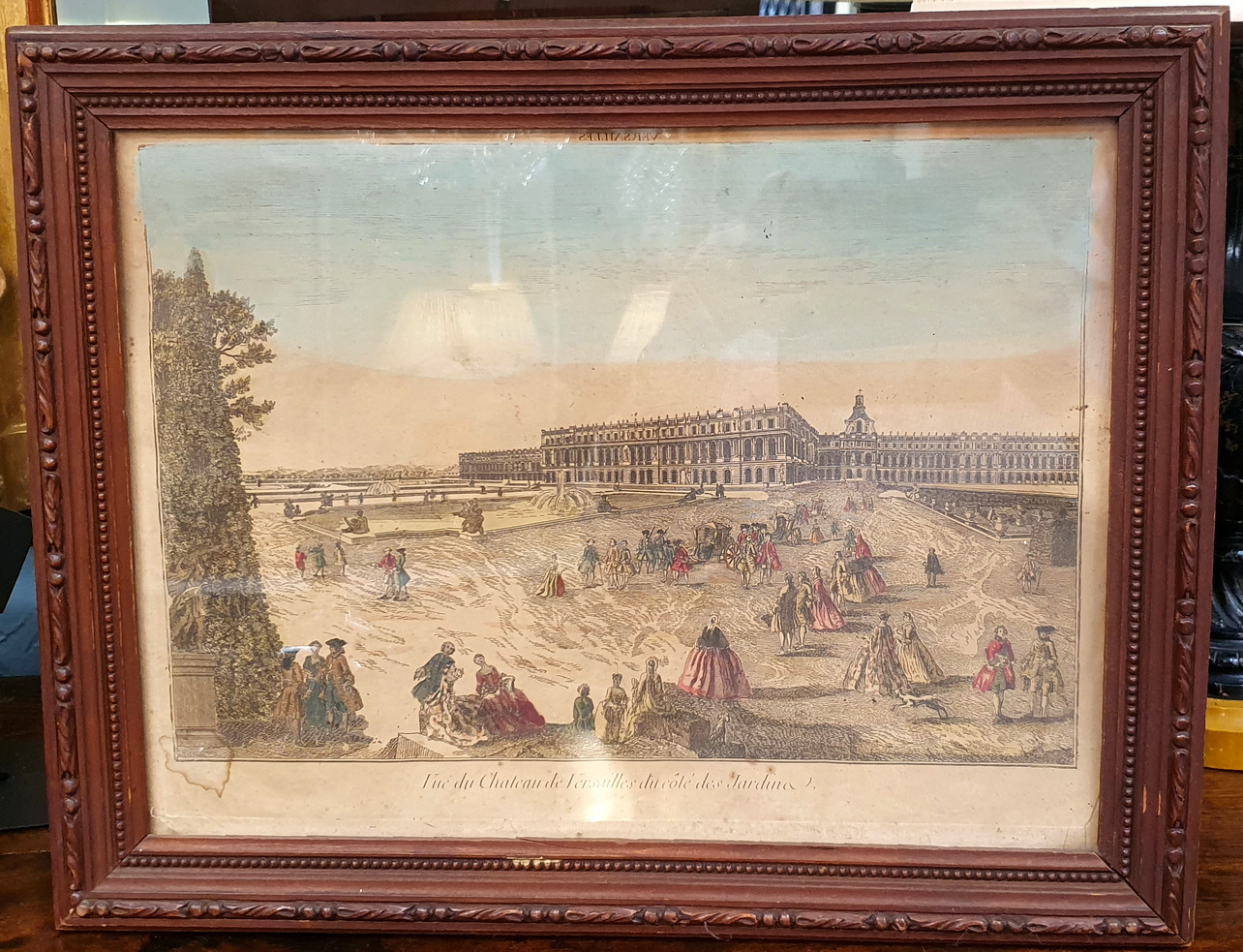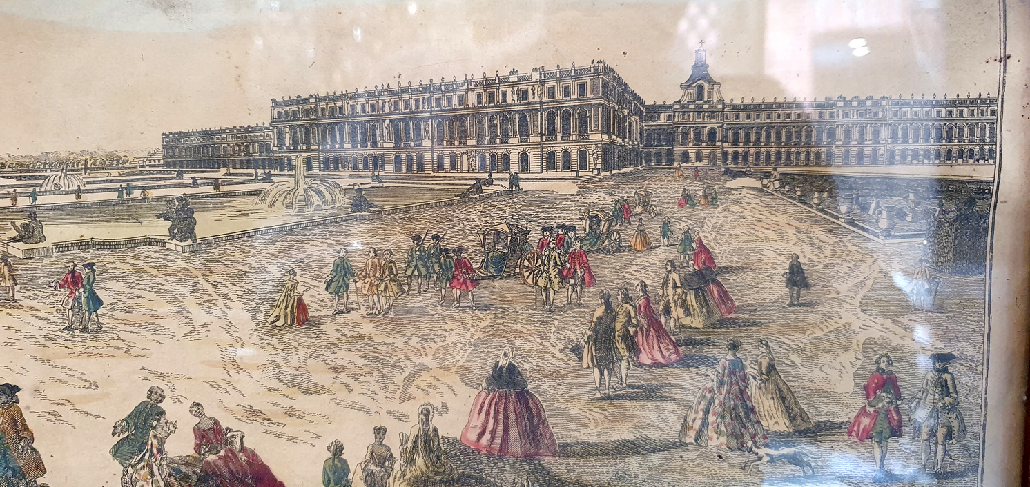 An 18th century watercolour print depicting a a view of the garden at the Palace of Versailles. These Vue d’Optique (Perspective View) prints became popular in Europe during the 18th century, and were used like slides, to be projected onto a screen from lenses of “magic lanterns”. The magic lanterns projected the views onto a screen as a Salon's evening entertainment. This hand-coloured print depicts the Palace of Versailles and its grounds and fountains, with figures in elegant costumes and dogs playing. Please note the name "Versailles" written backwards, so as to project it onto a screen. Area of Paris, circa 1770.