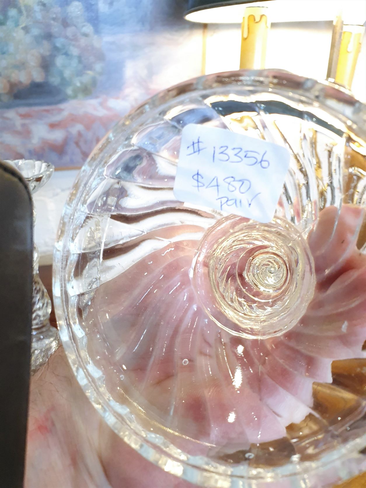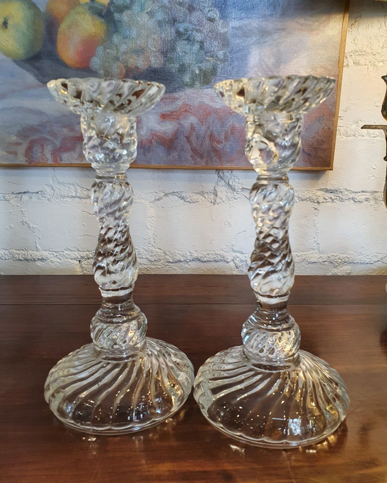 A pair of vintage French Baccarat style crystal candlesticks, the baluster-shaped uprights decorated with raised 'Bambous Swirl' patterns. France, mid 20th century.