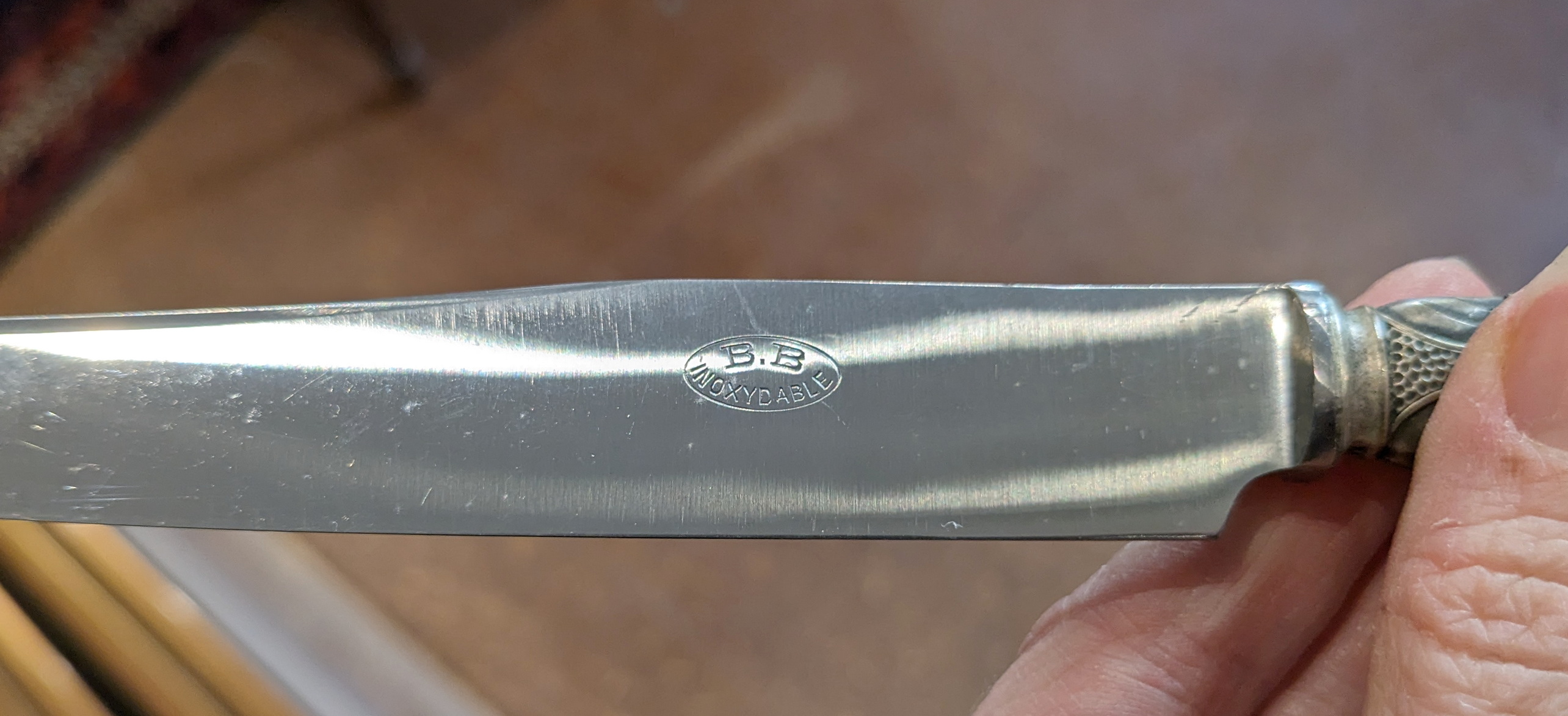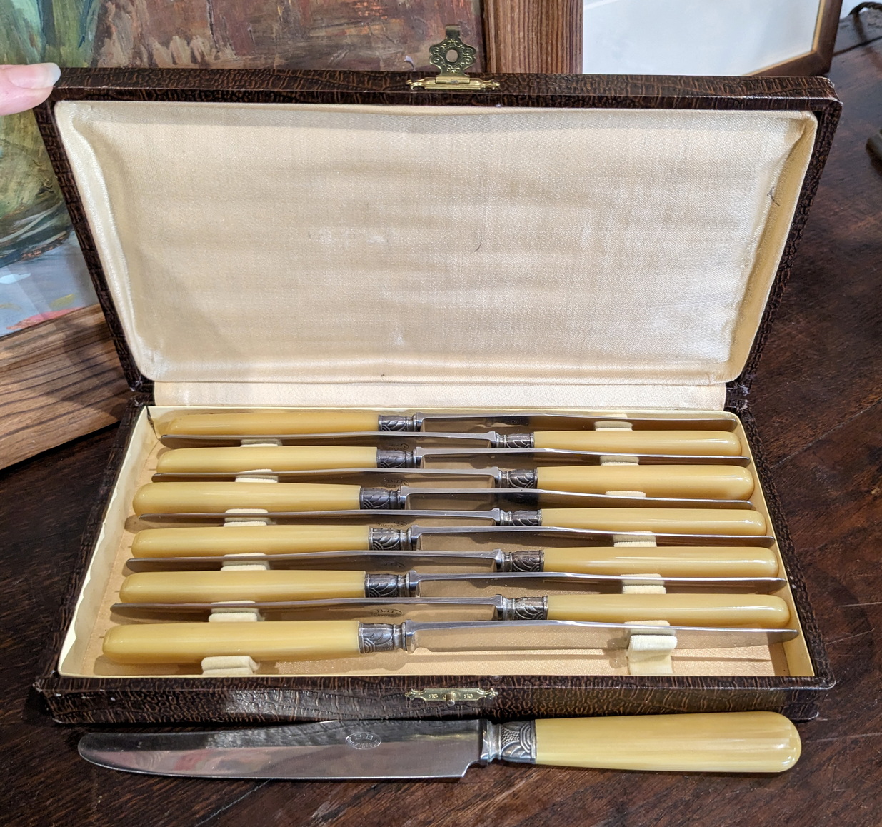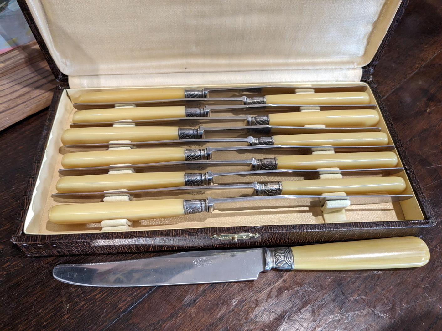 An elegant set of 12 early 20th century French Art Deco period bone handle flatware knives retaining their original, polished bone handles with silver plated tips, retaining their original cutlery box. Area of Southern France, circa 1930.