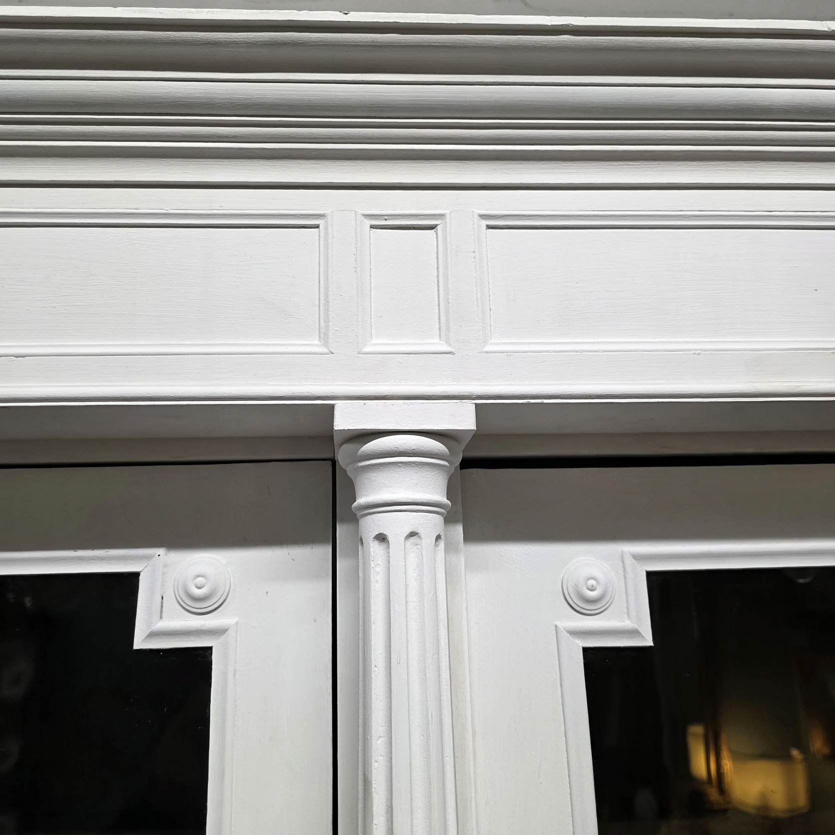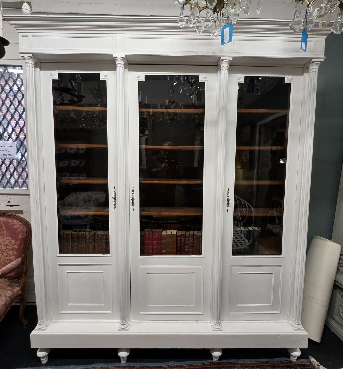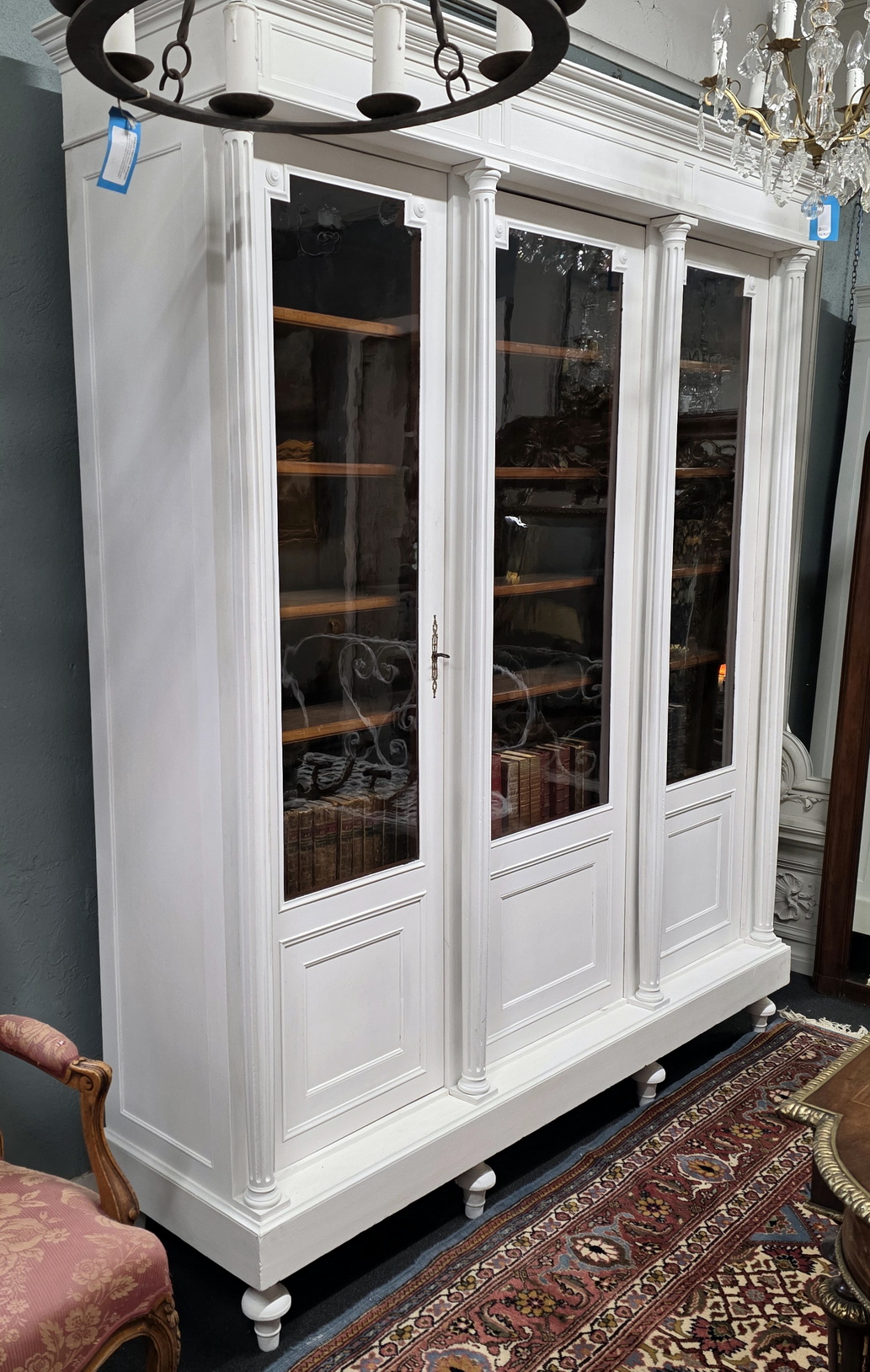 An elegant, mid 19th century French Louis XVI style, Napoleon III period, three-door painted bookcase, decorated with fluted pilasters and capitols, paterae and pine cone finials. Internally, the bookcase is fitted with adjustable-height shelves. Area of Paris, circa 1870.