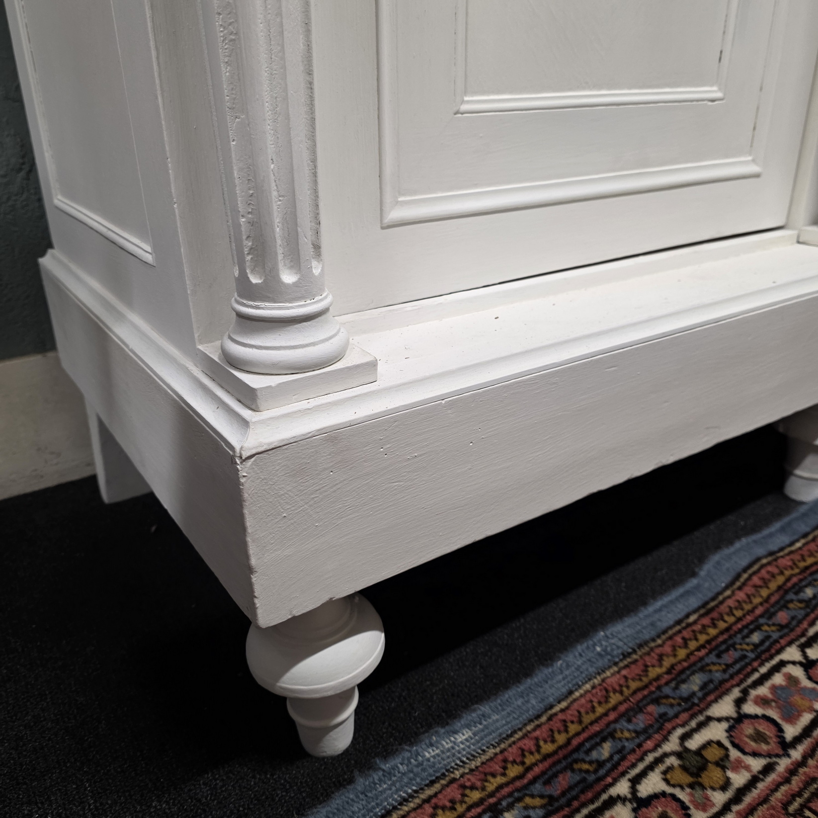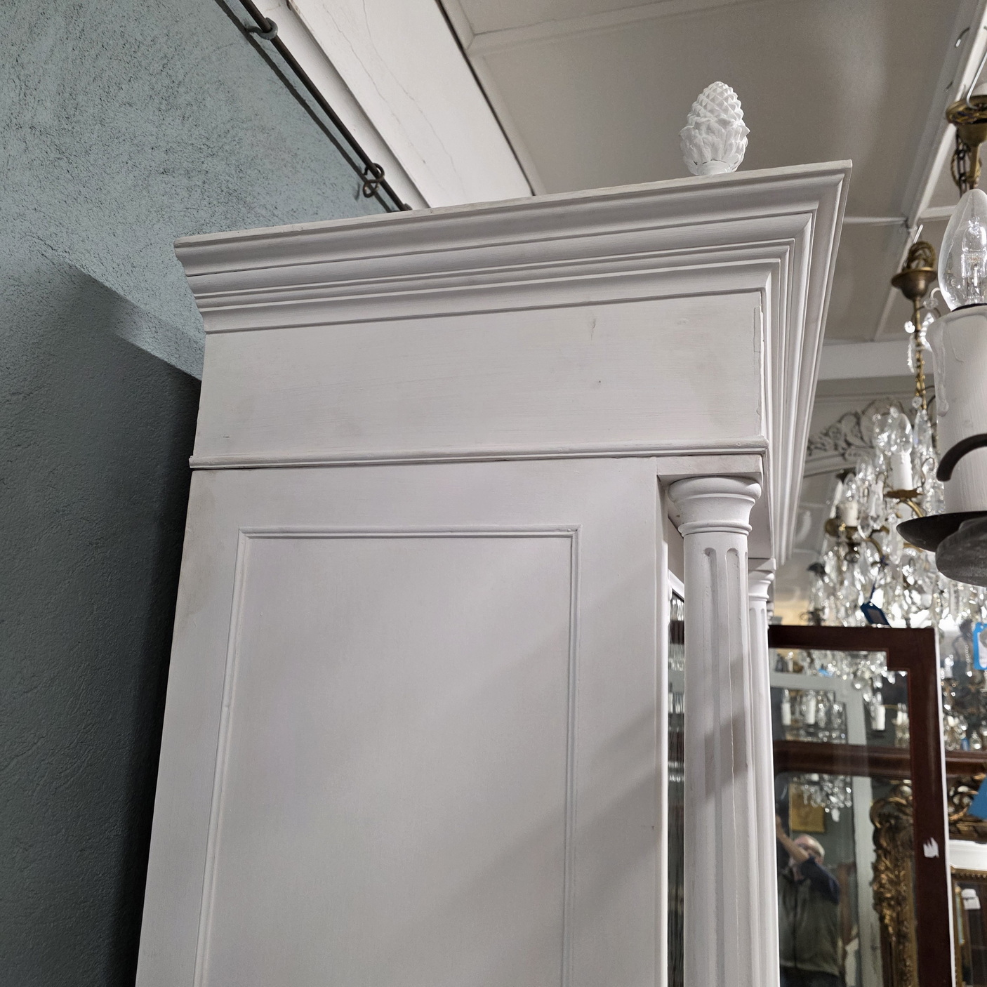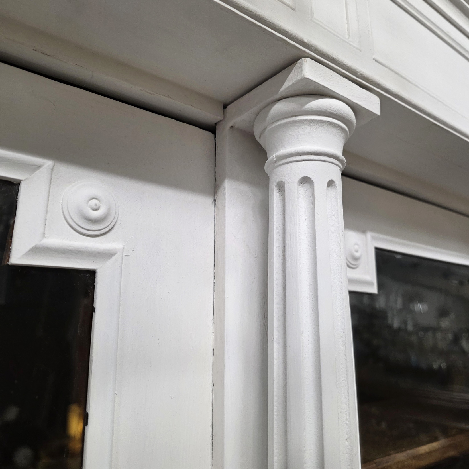 An elegant, mid 19th century French Louis XVI style, Napoleon III period, three-door painted bookcase, decorated with fluted pilasters and capitols, paterae and pine cone finials. Internally, the bookcase is fitted with adjustable-height shelves. Area of Paris, circa 1870.
