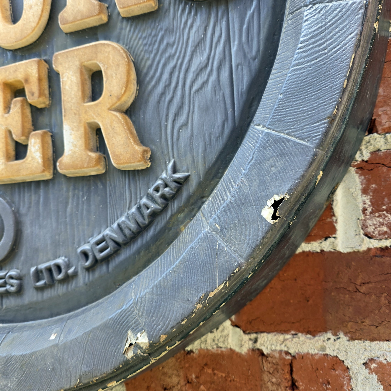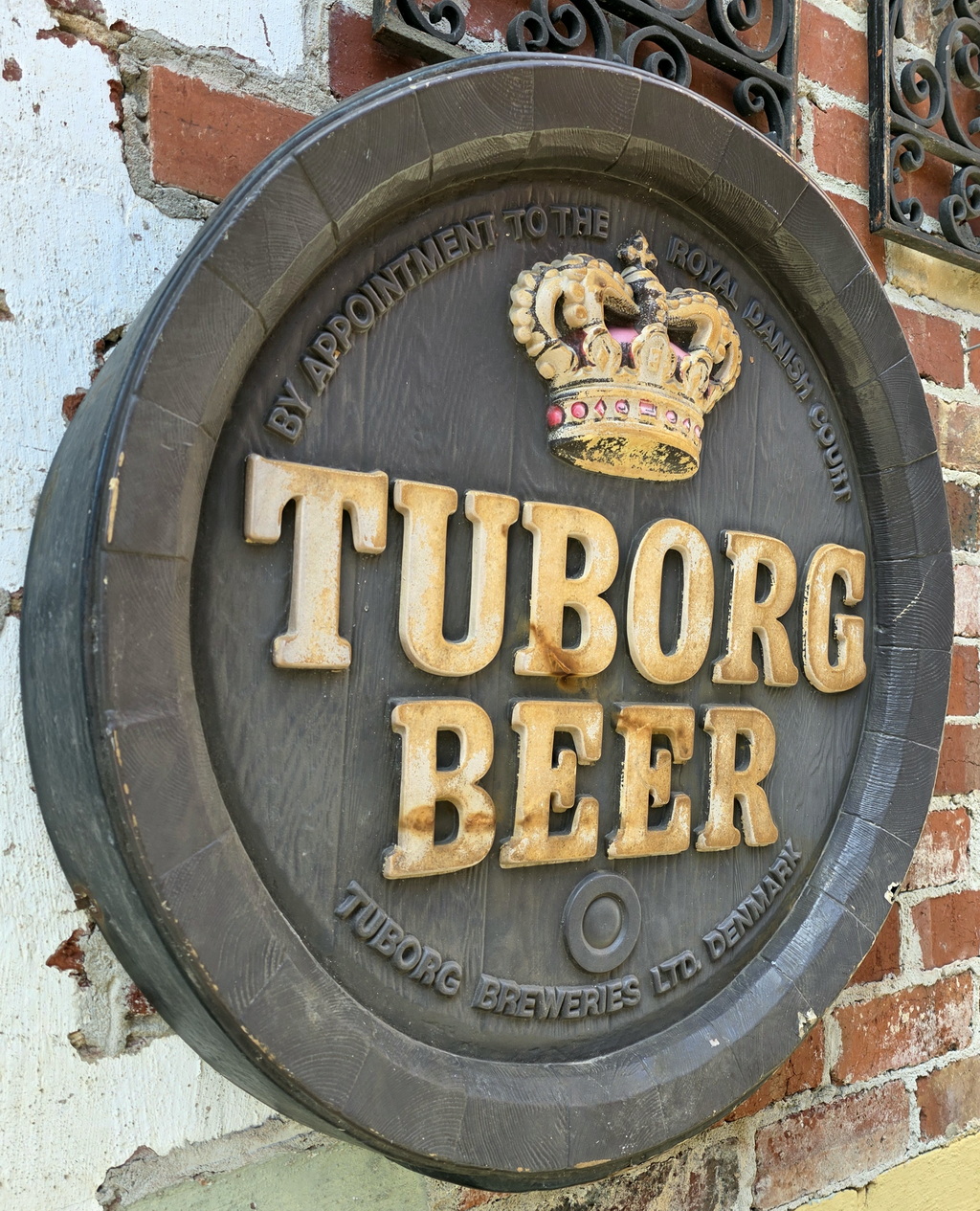 A vintage 1970s wall mounted advertising sign for the Danish beer 'Tuborg'. The faux barrel front made from coloured fiberglass. Area of Denmark, circa 1970.