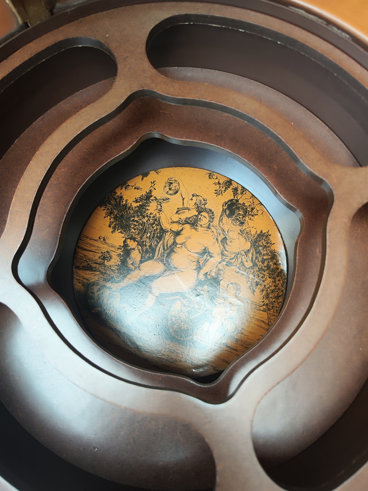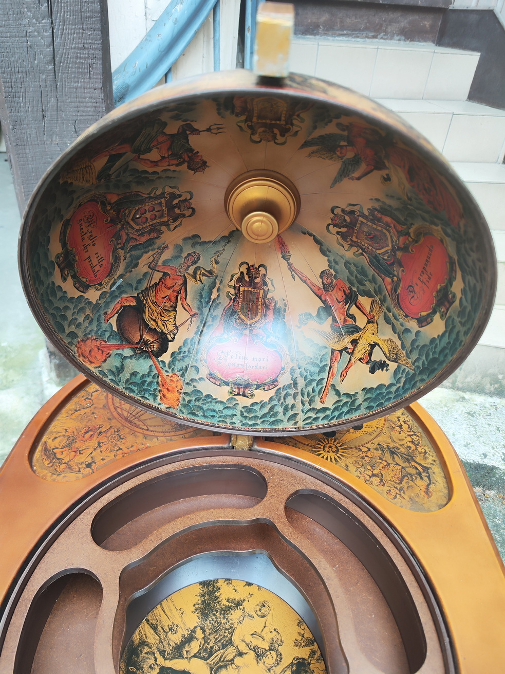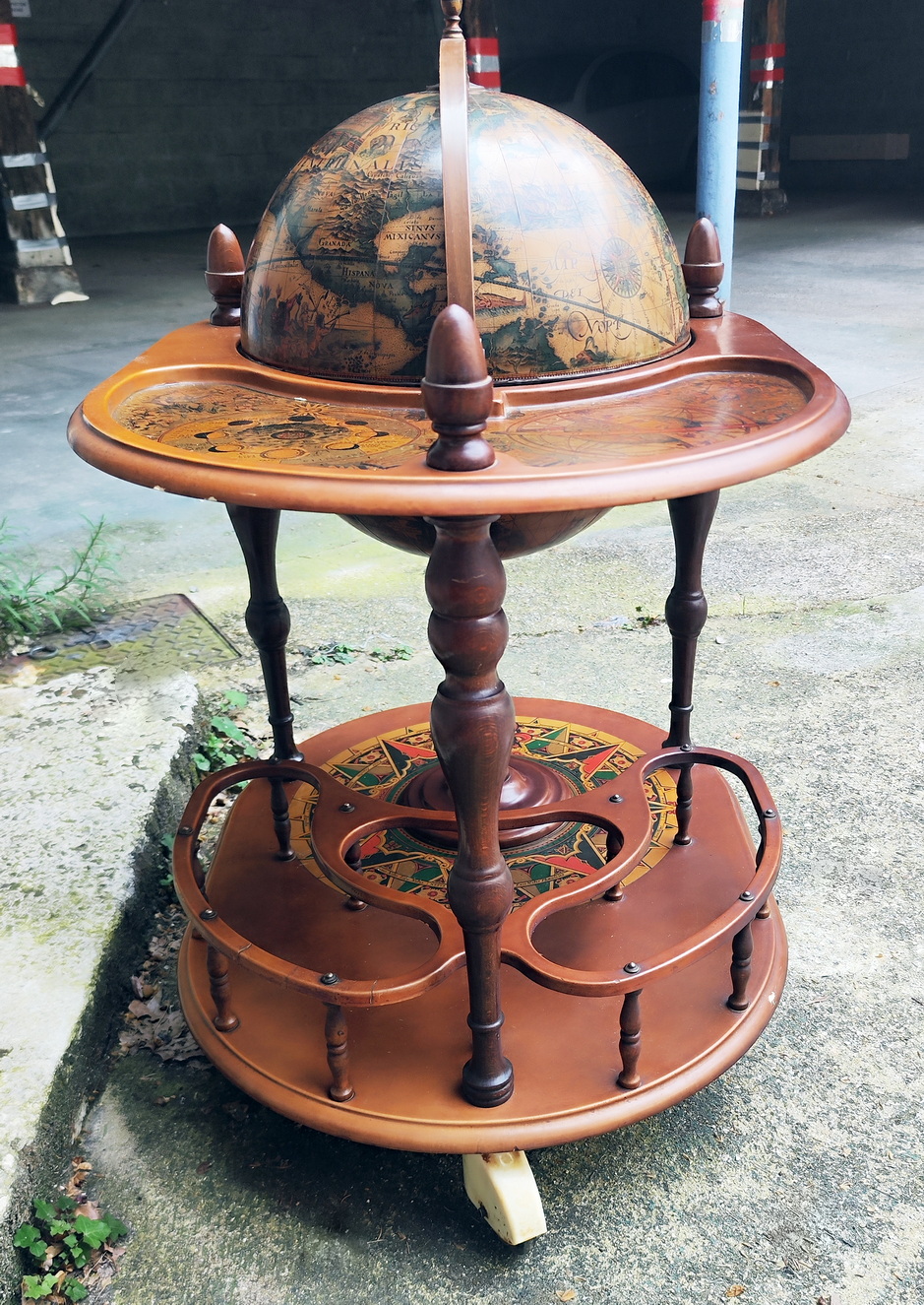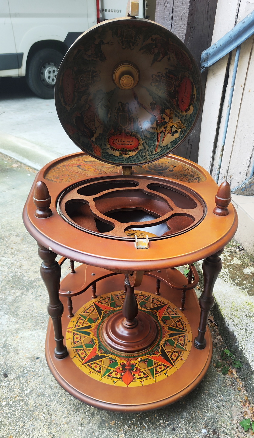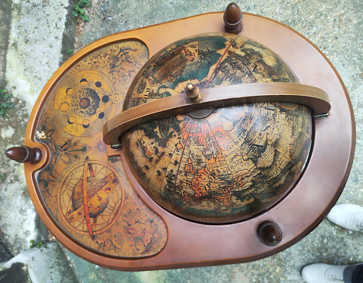 A vintage, mid 20th century French bar-cabinet in the shape of a floor-standing and rotating Atlas globe, the globe and the globe-stand decorated with applied prints of old maps, constellations and zodiac signs. The globe opens up on a sturdy hinge to reveal a rotating internal shelf with compartments for bottles and glasses. Please note: this is an unusually large bar cabinet, with extra space on the top and also an area for storing bottles in the base. Area of Paris, circa 1960.