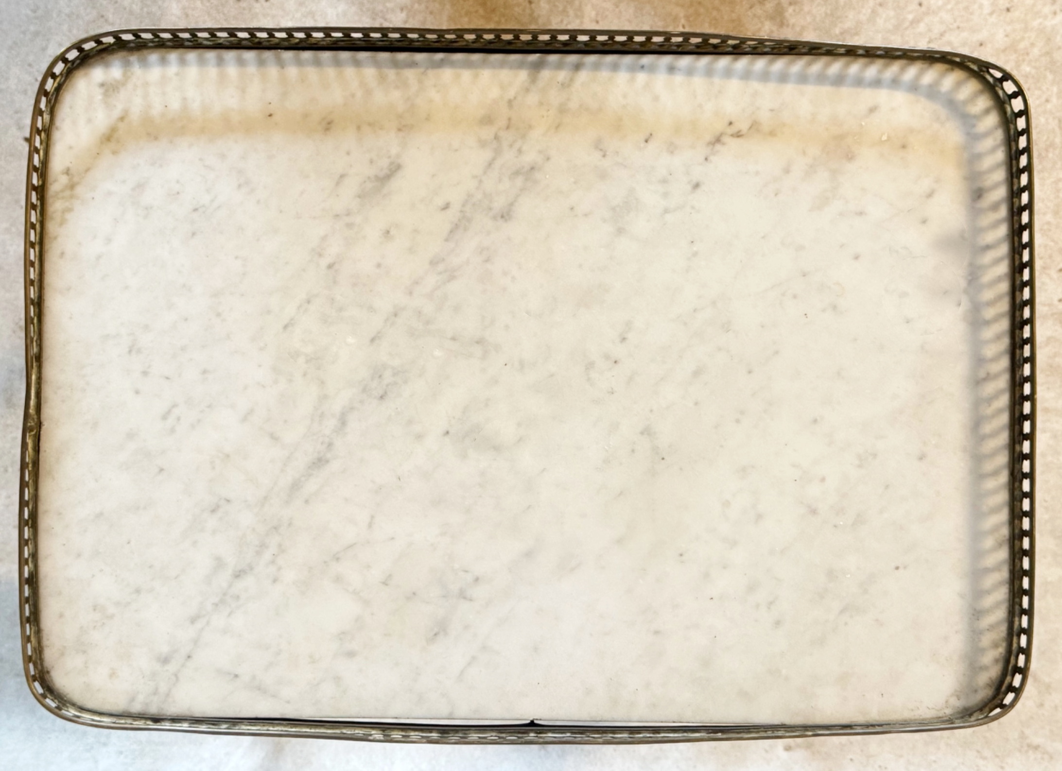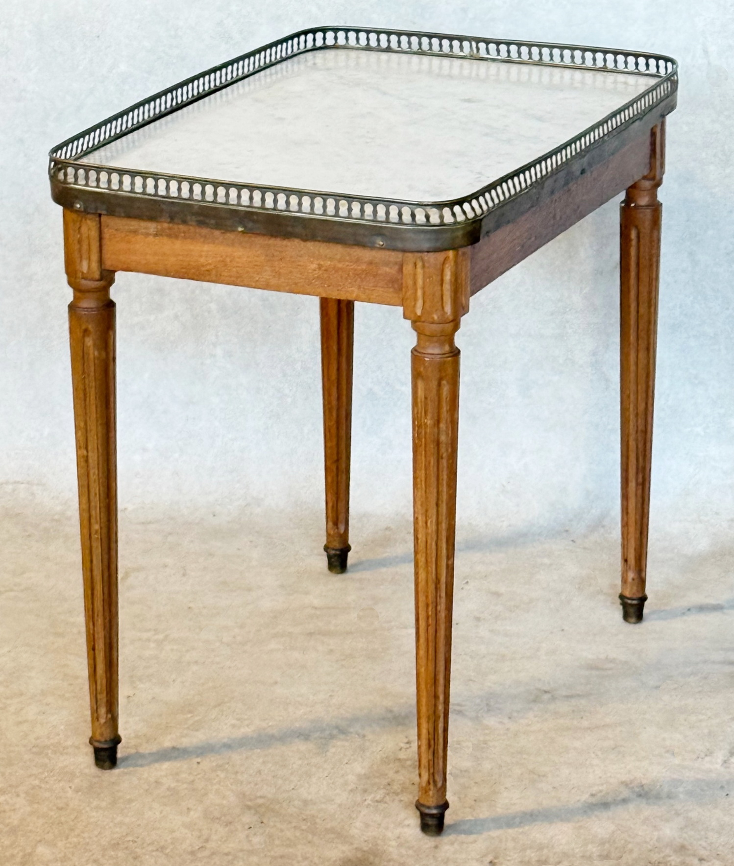 A small, early 20th century French Louis XVI style mahogany and gilt brass-mounted Bouillotte sofa table of good design and proportions, the original rectangular Carrara marble top encased within a raised and finely fretted gilt brass gallery. Area of Paris, circa 1930.