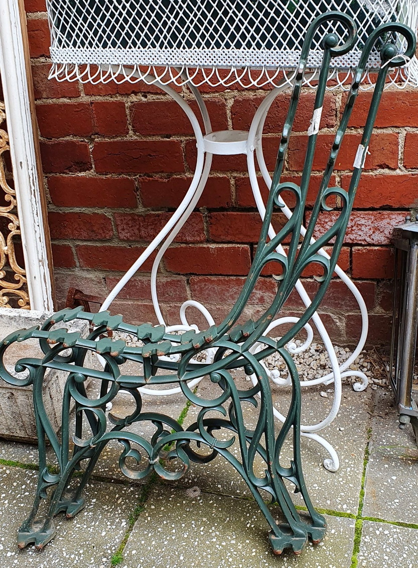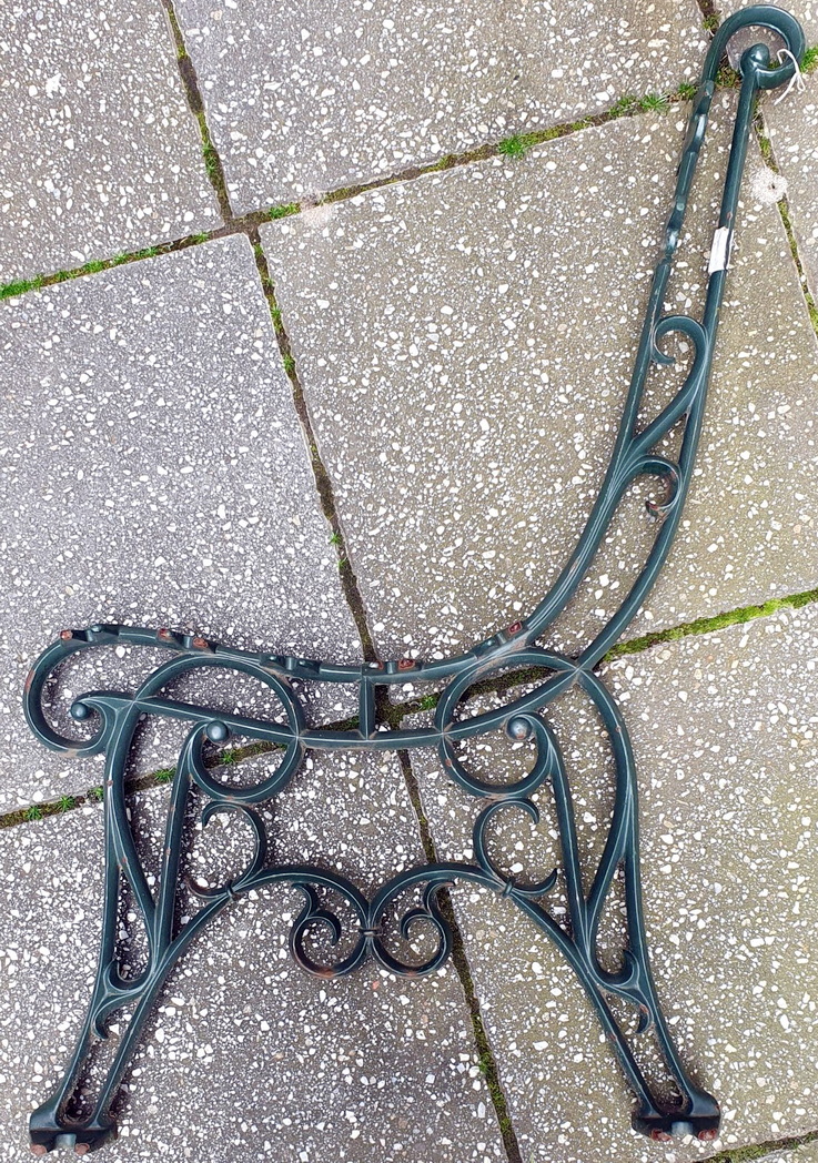 A French cast iron bench uprights decorated with fretted scrollwork motifs, each upright fitted with lugs for attaching timber slats to. This is an easy DIY job, but on request, our workshop can fit timber slats to these uprights, to a desired length (Please see attached photo showing a similar, slatted bench). Area of Isle de France (Greater Paris) circa 1950.