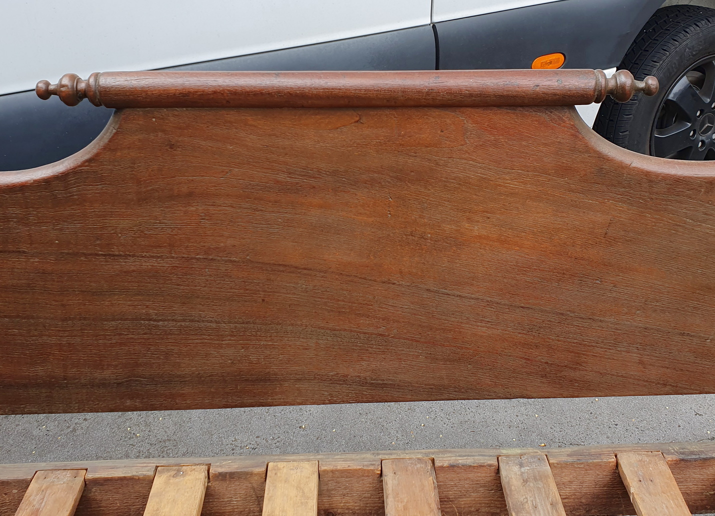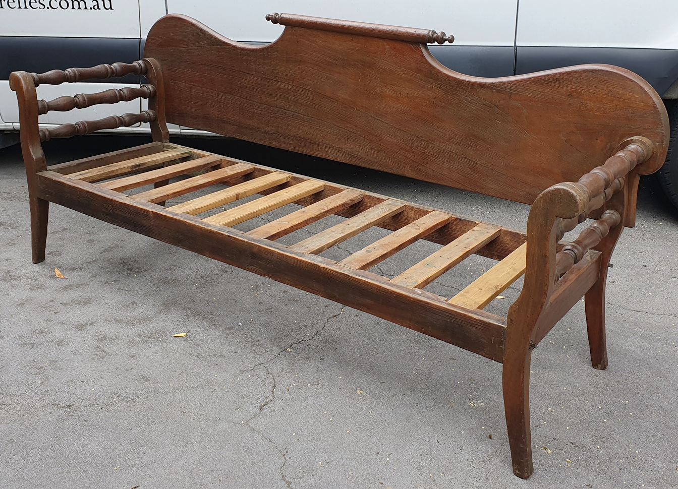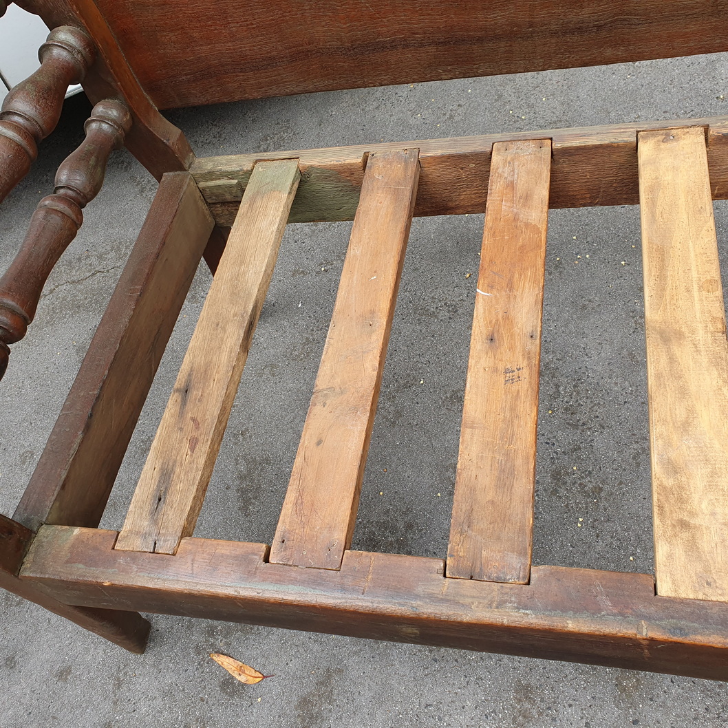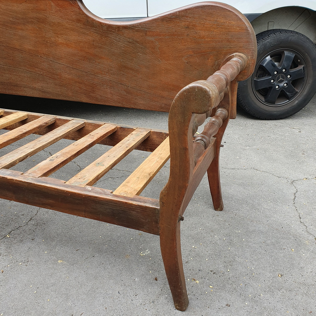 A 19th century Australian solid cedar miner's couch, the backrest made from a single, wide plank of Australian cedar shaped and decorated with a 'rolling-pin' finial, the armrests curved outwards and fitted with baluster turned rungs. Provenance: the verandah of a farmhouse in South Australia, circa 1870.