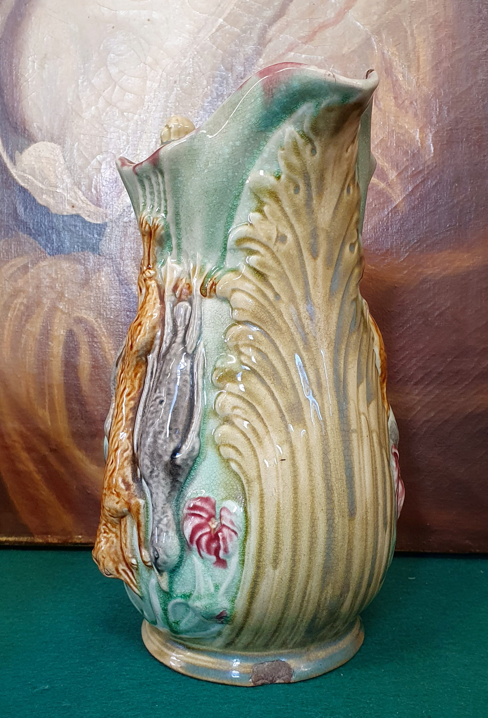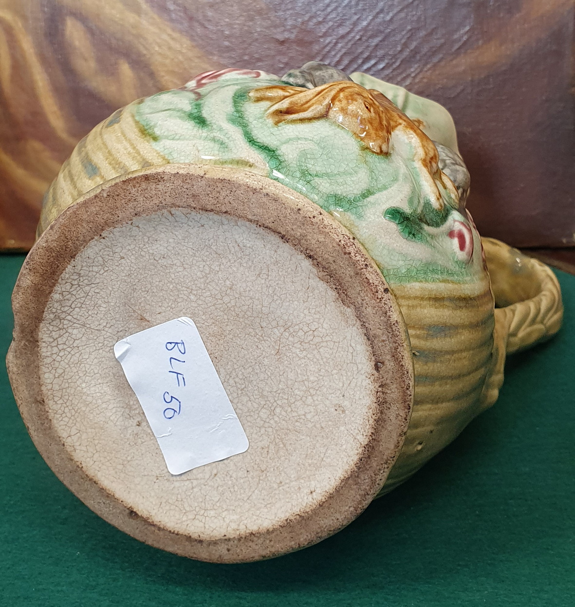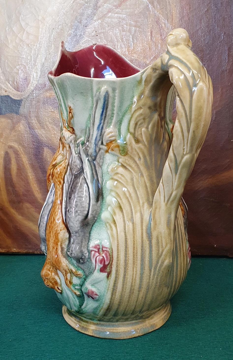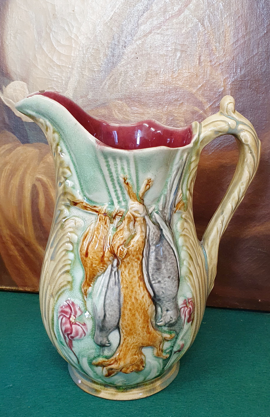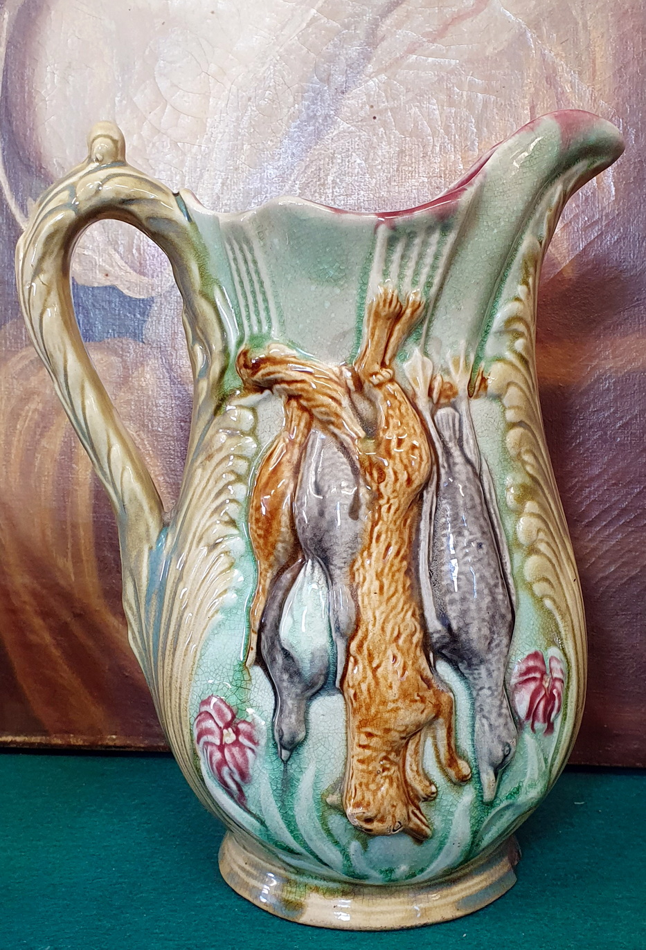 A 19th century French Art Nouveau period majolica jug decorated with haut-relief and hand painted birds and hares, the catch of a hunt. The colours and patterns of the glaze are typical of the French Art Nouveau period. Area of Lille, Northern France, circa 1900.